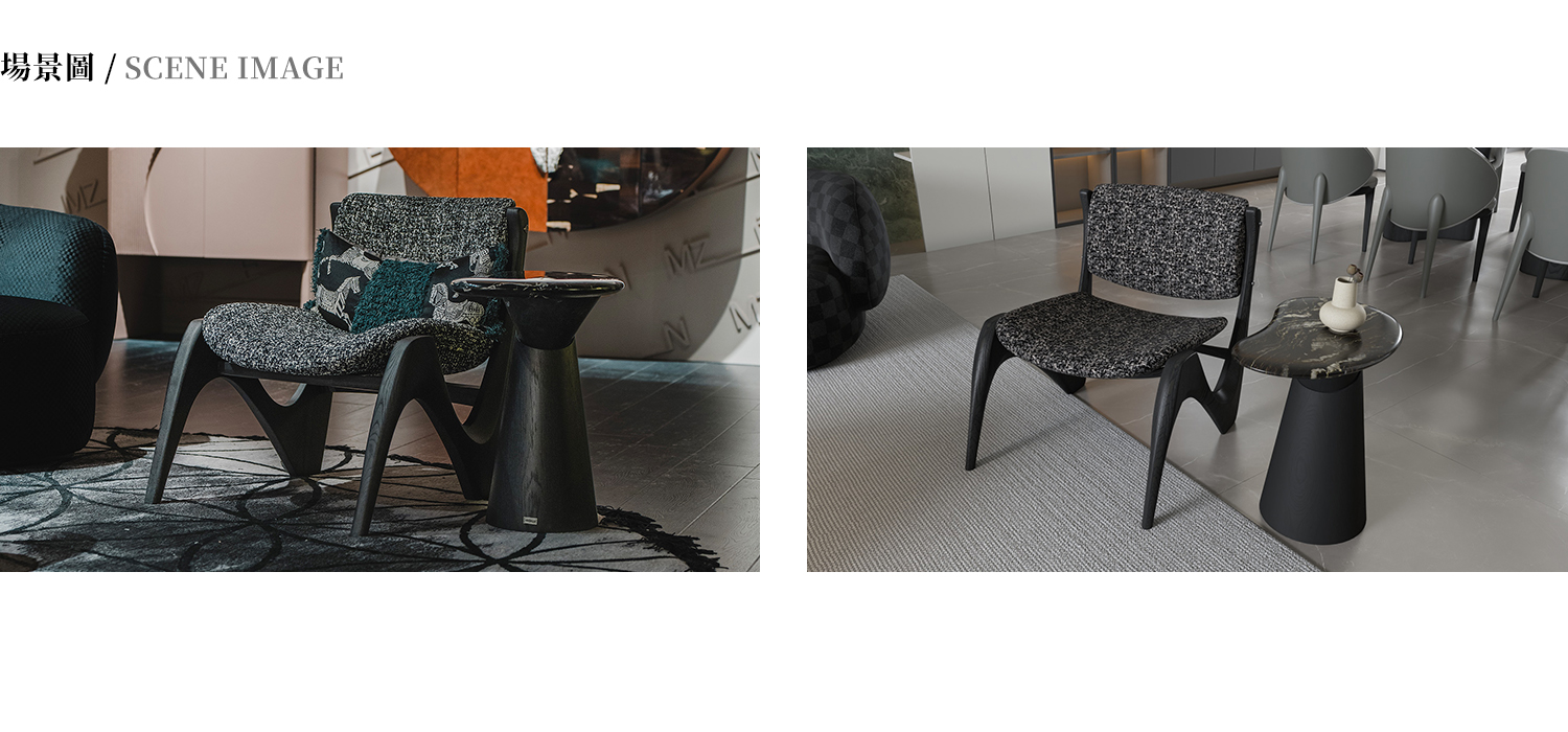 邊几檯面為潑墨黑大理石,整體框架為白蠟木實木開放漆黑橡色。
