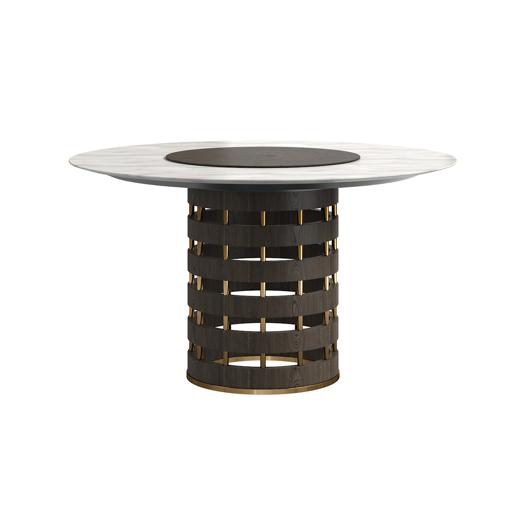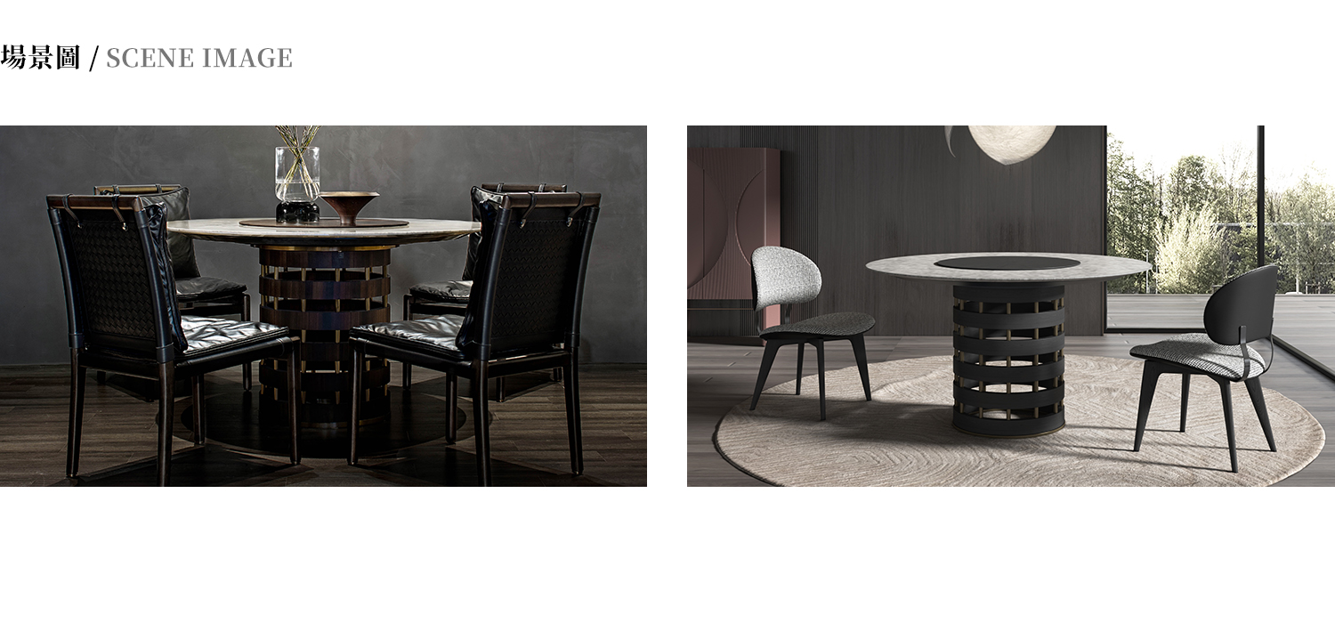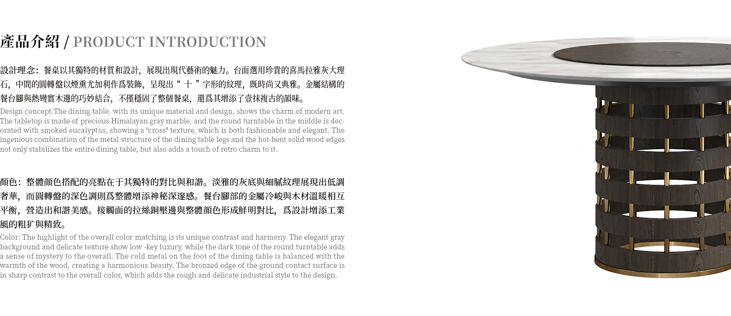 桌面為喜馬拉雅灰大理石切科邊,轉盤貼白橡直紋木皮,底座貼白橡直紋木皮 + 金屬。