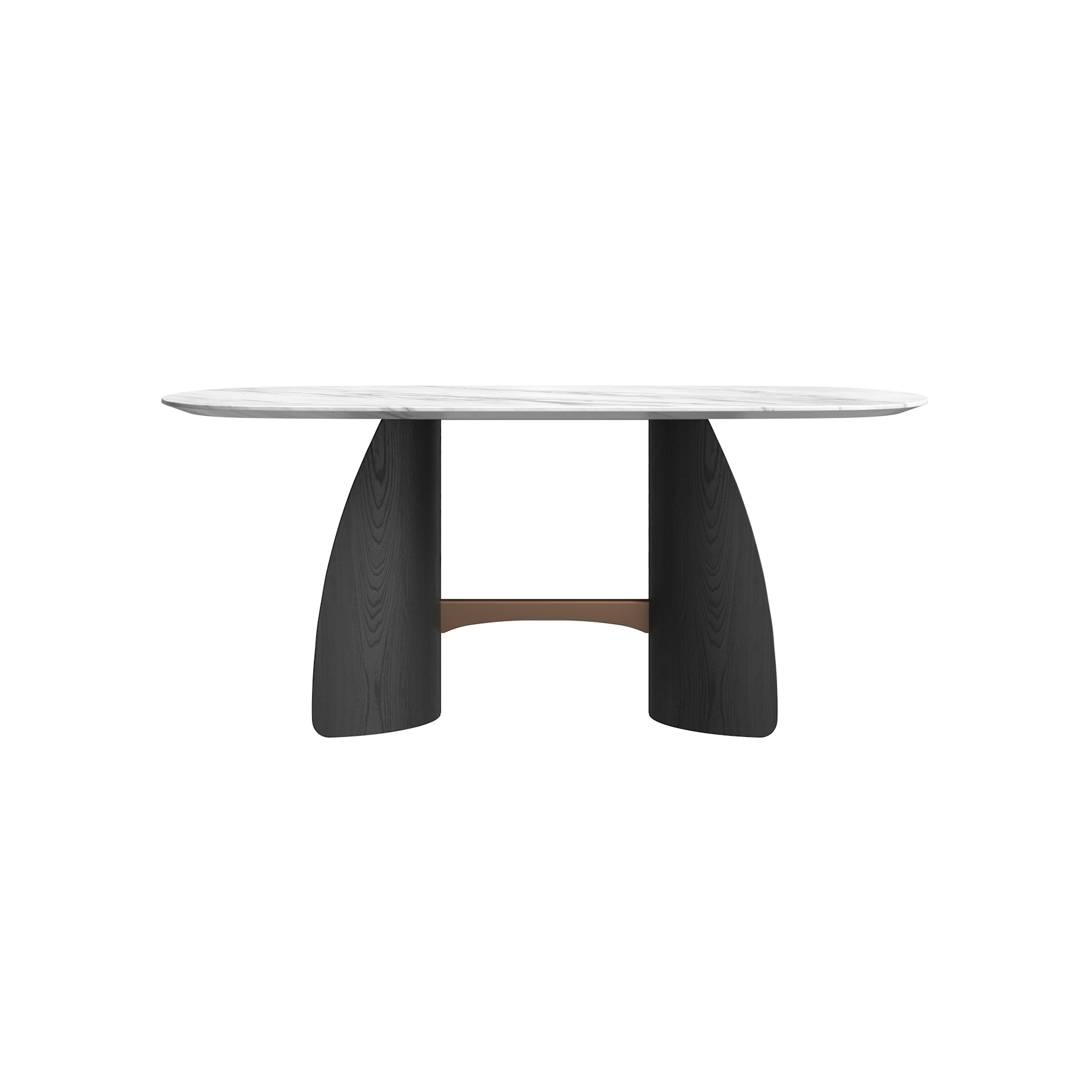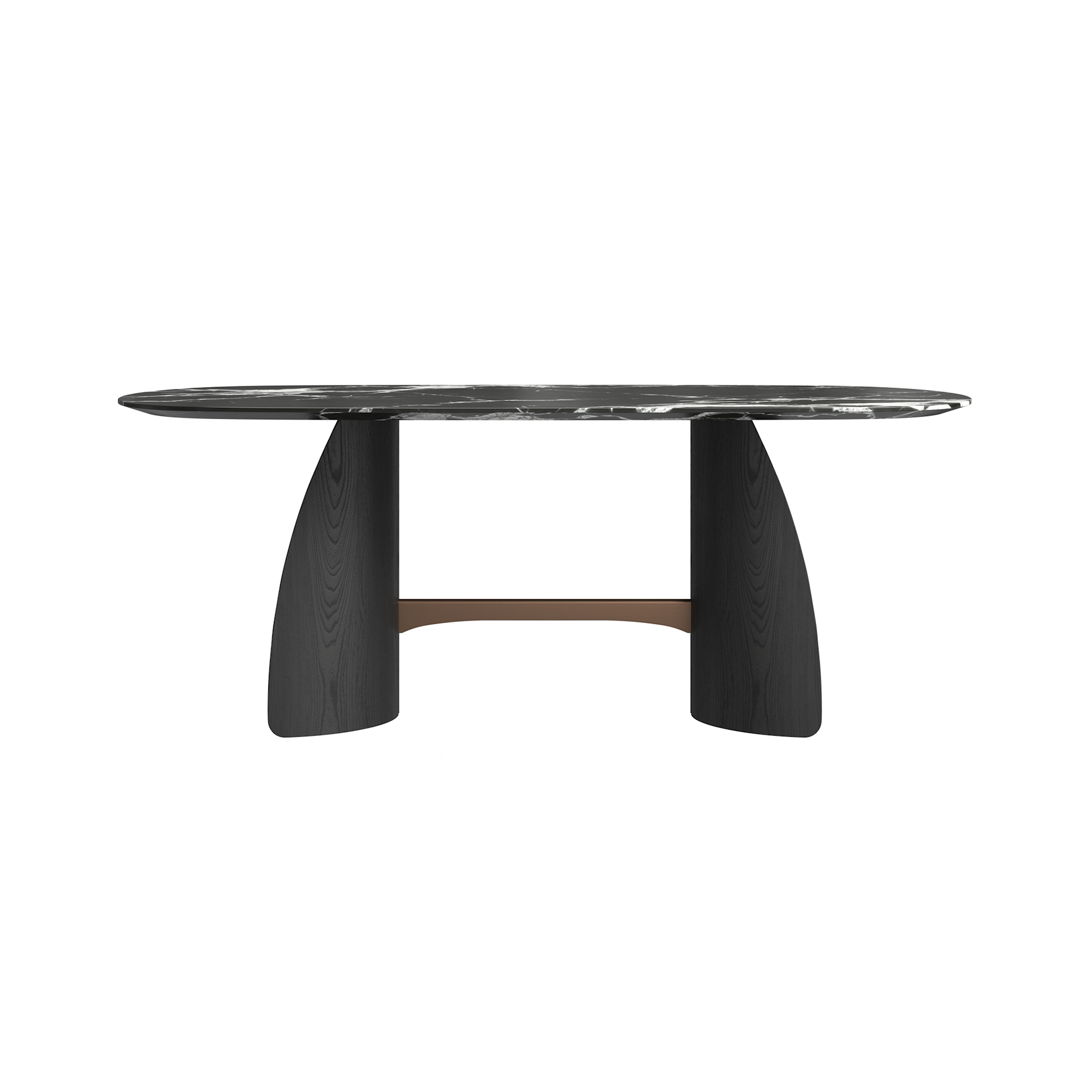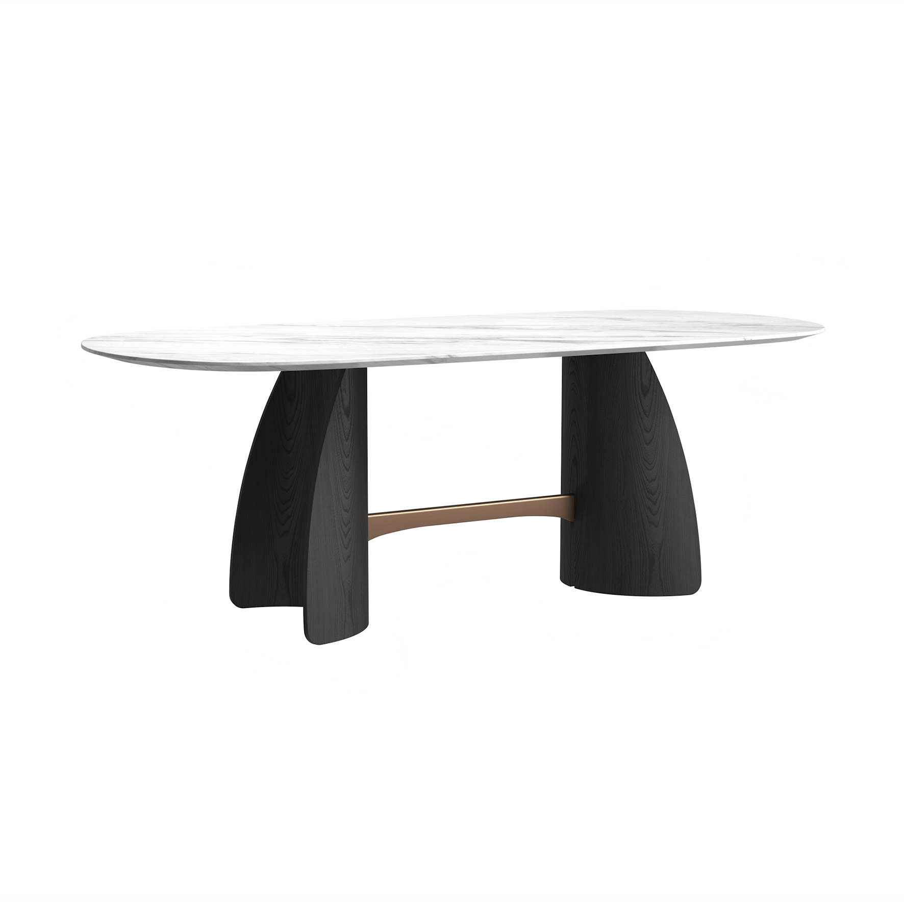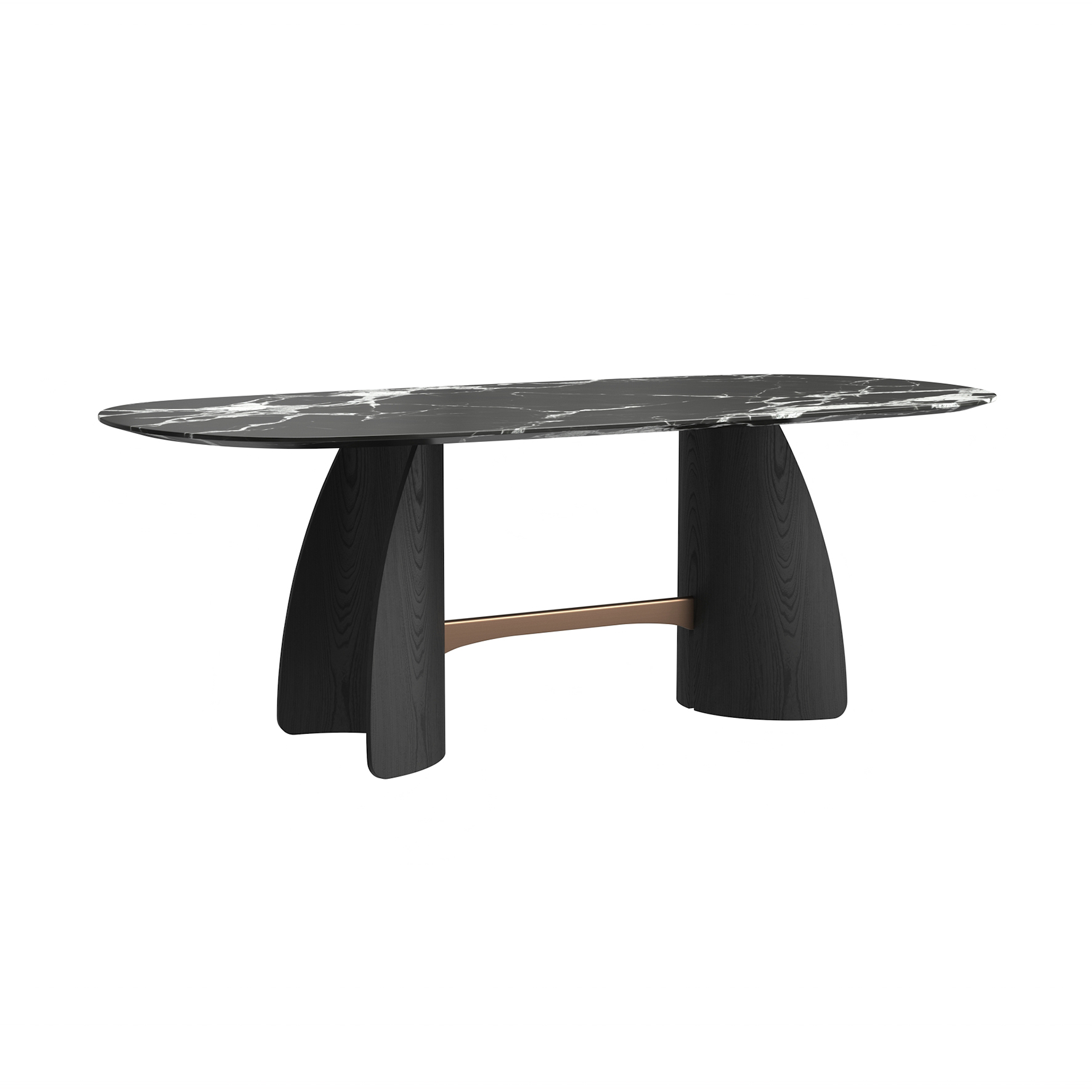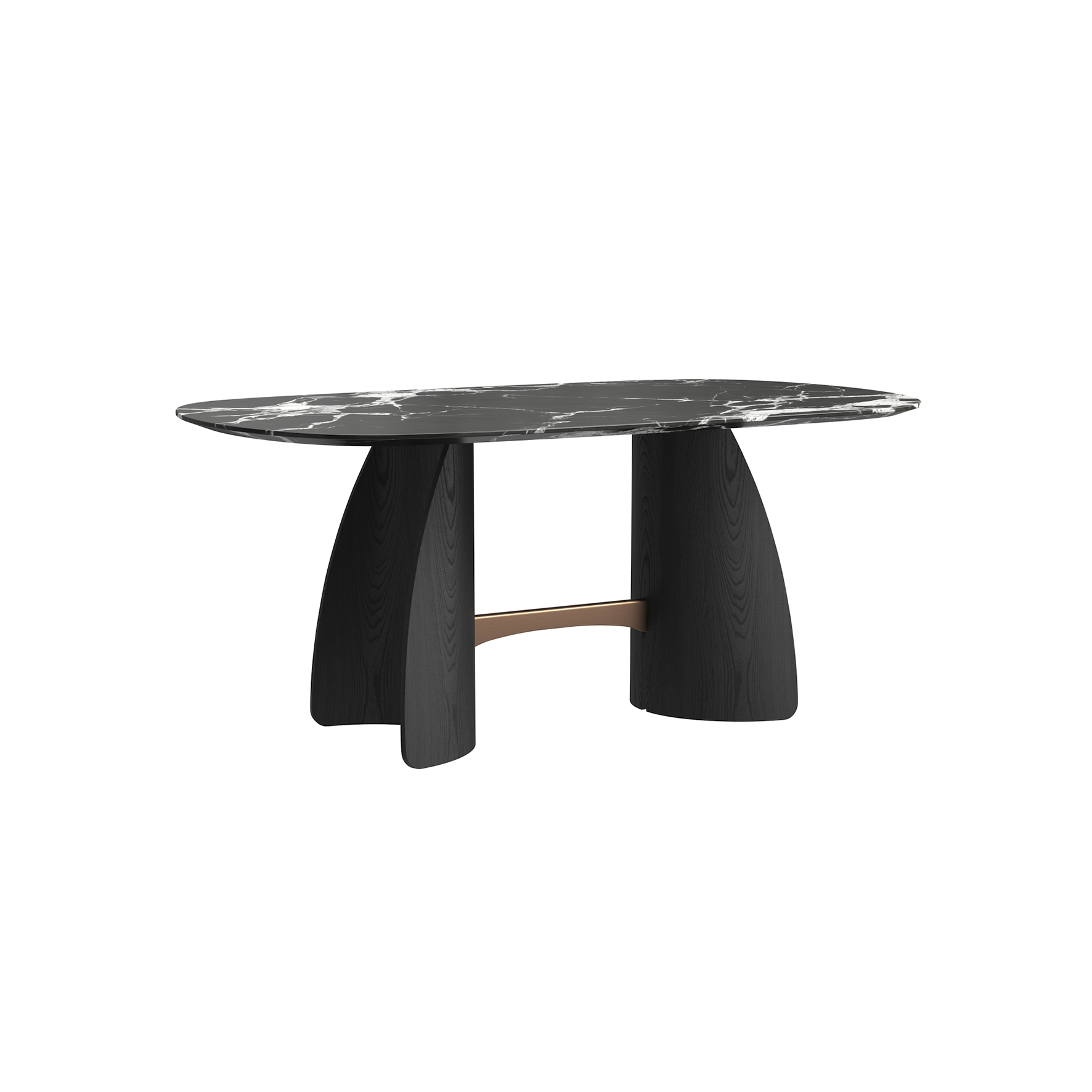 The tabletop is crafted from Calacatta White or BulgariBlack marble, with legs featuring a white oak mountain pat-tern and a metal stretcher for central support between thelegs.