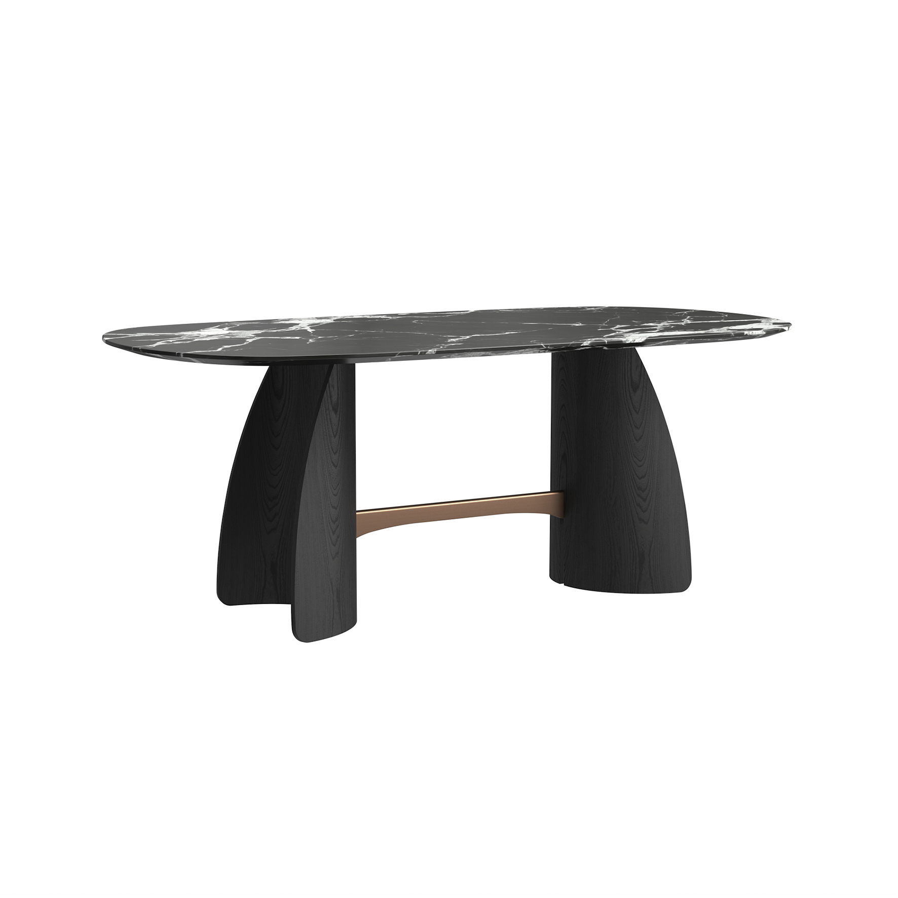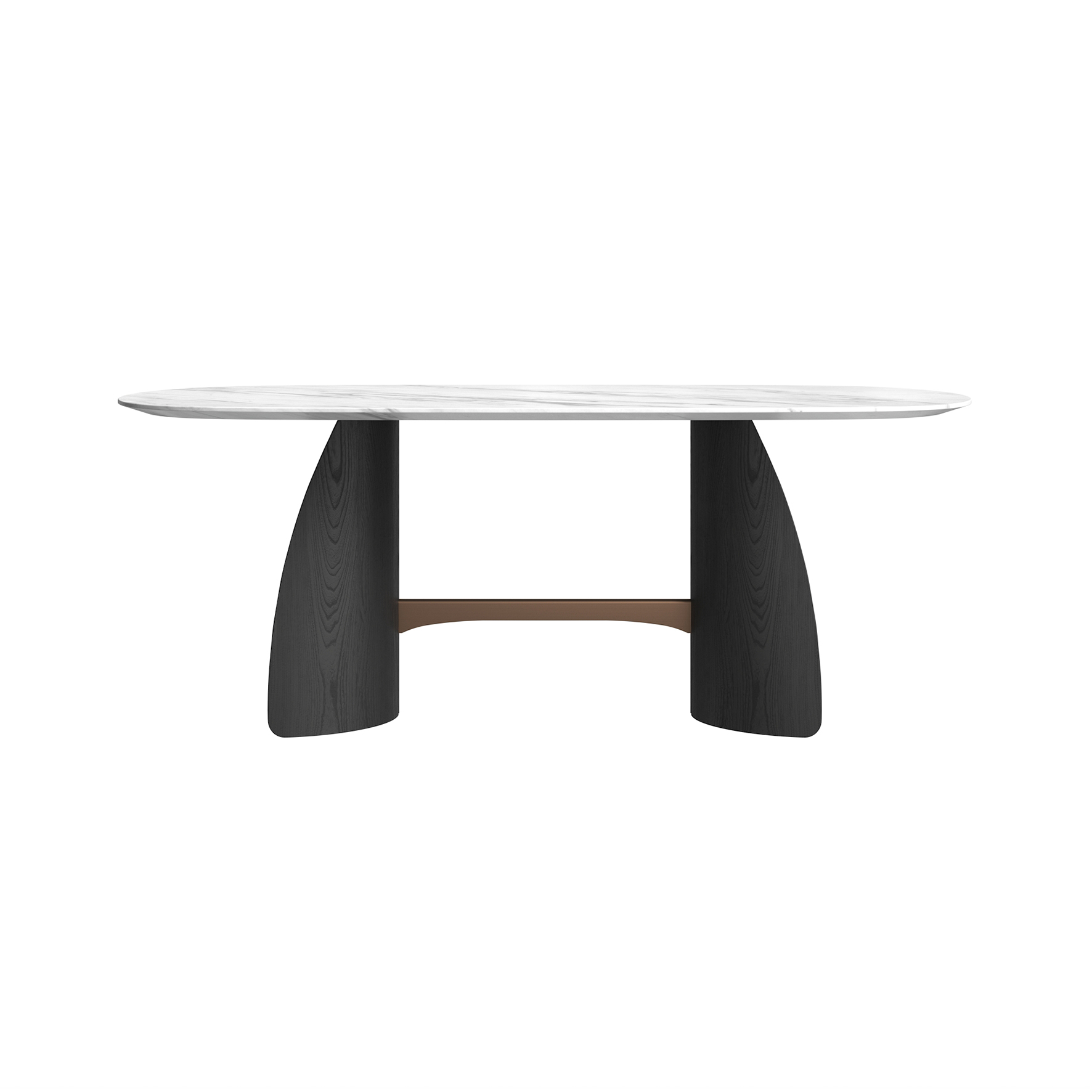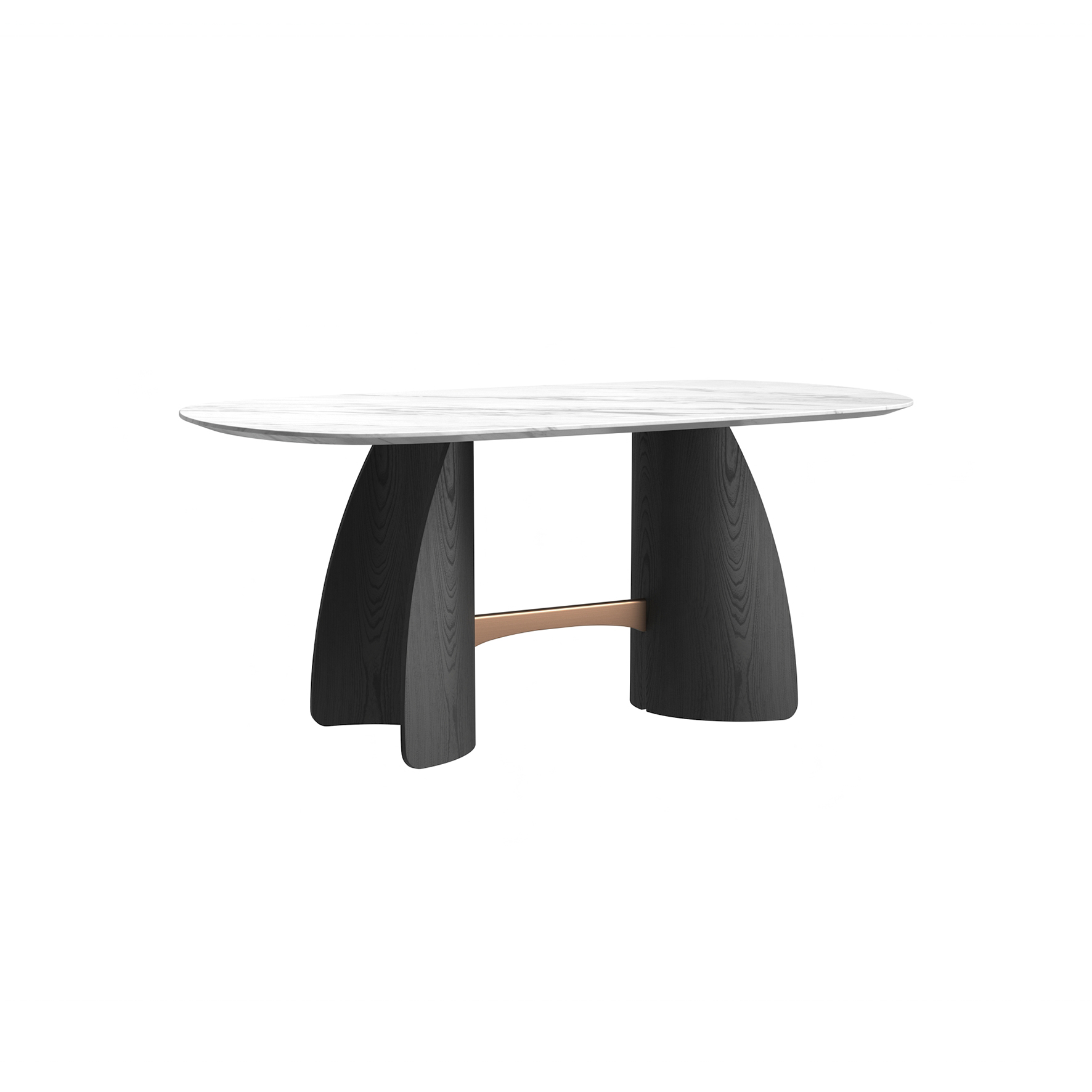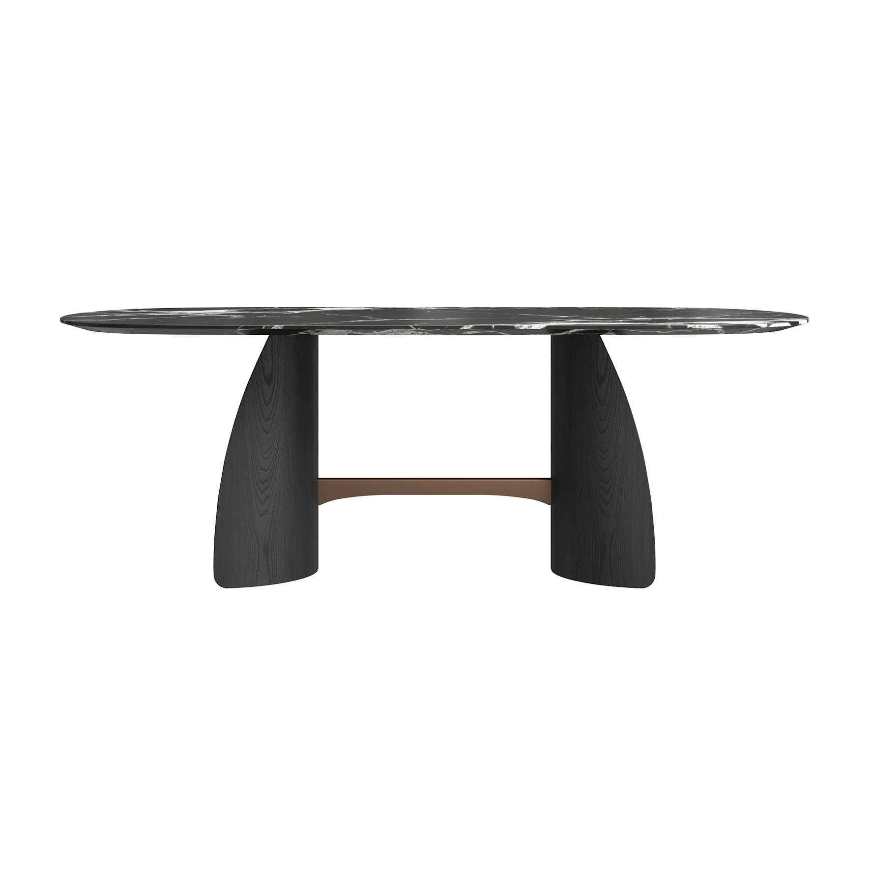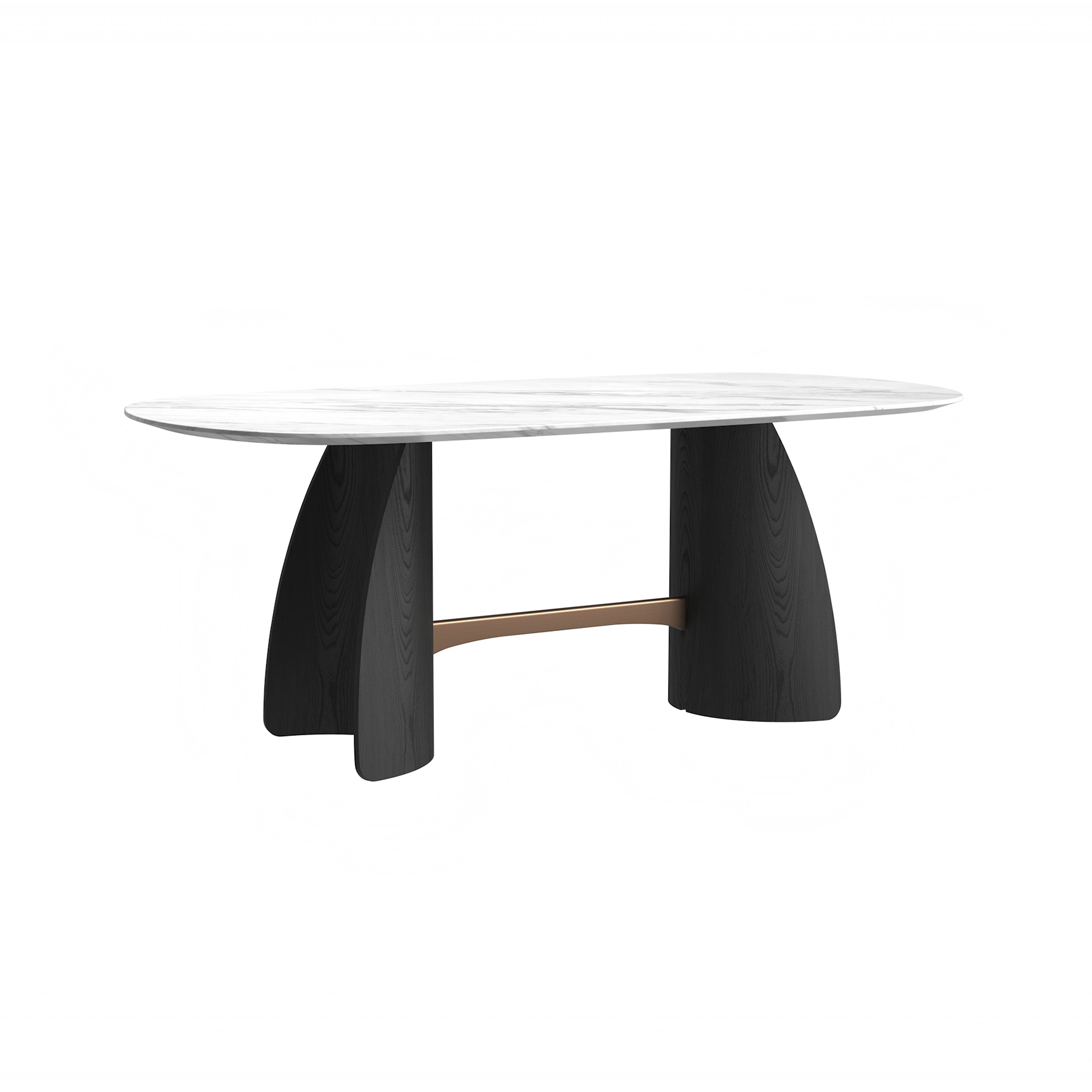 The tabletop is crafted from Calacatta White or BulgariBlack marble, with legs featuring a white oak mountain pat-tern and a metal stretcher for central support between thelegs.