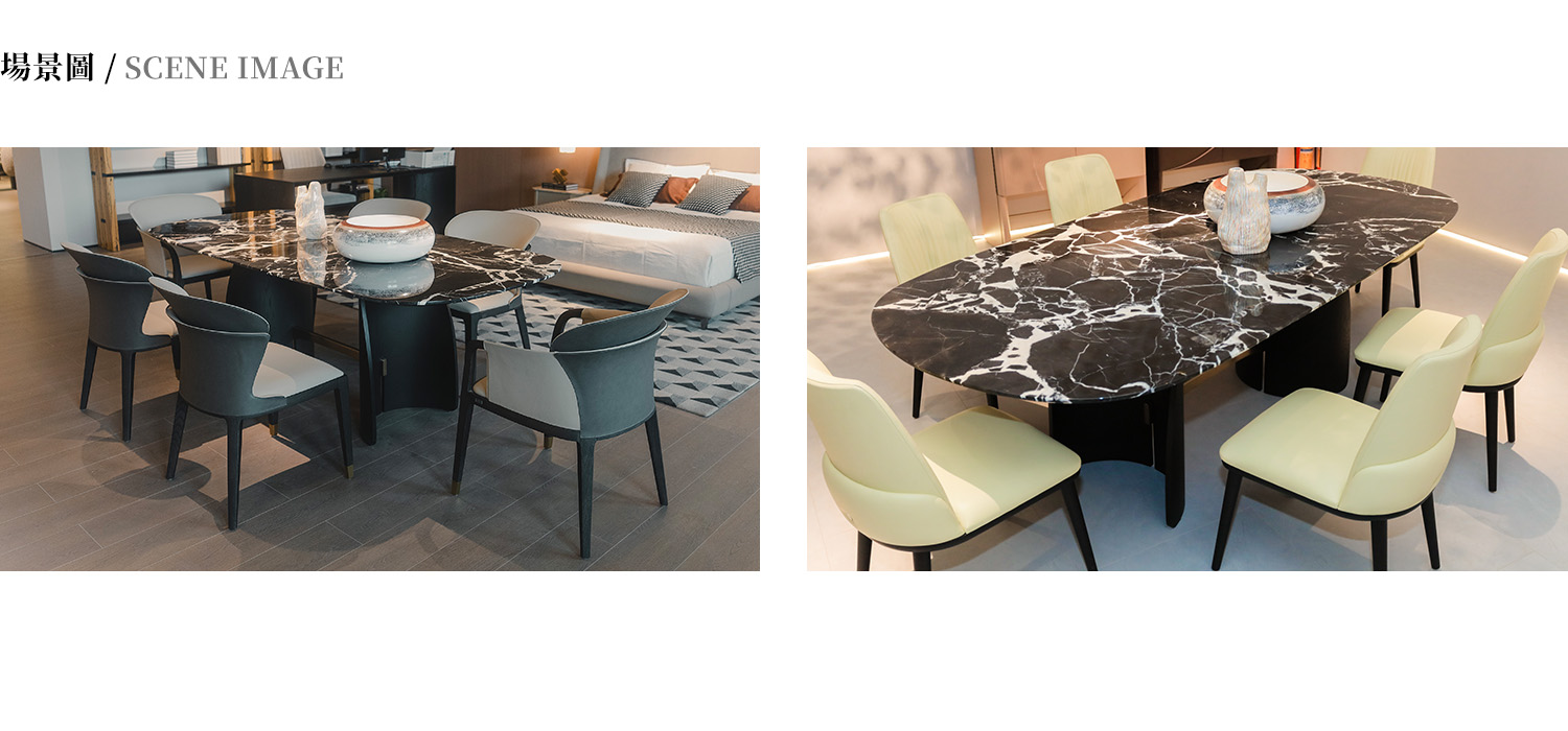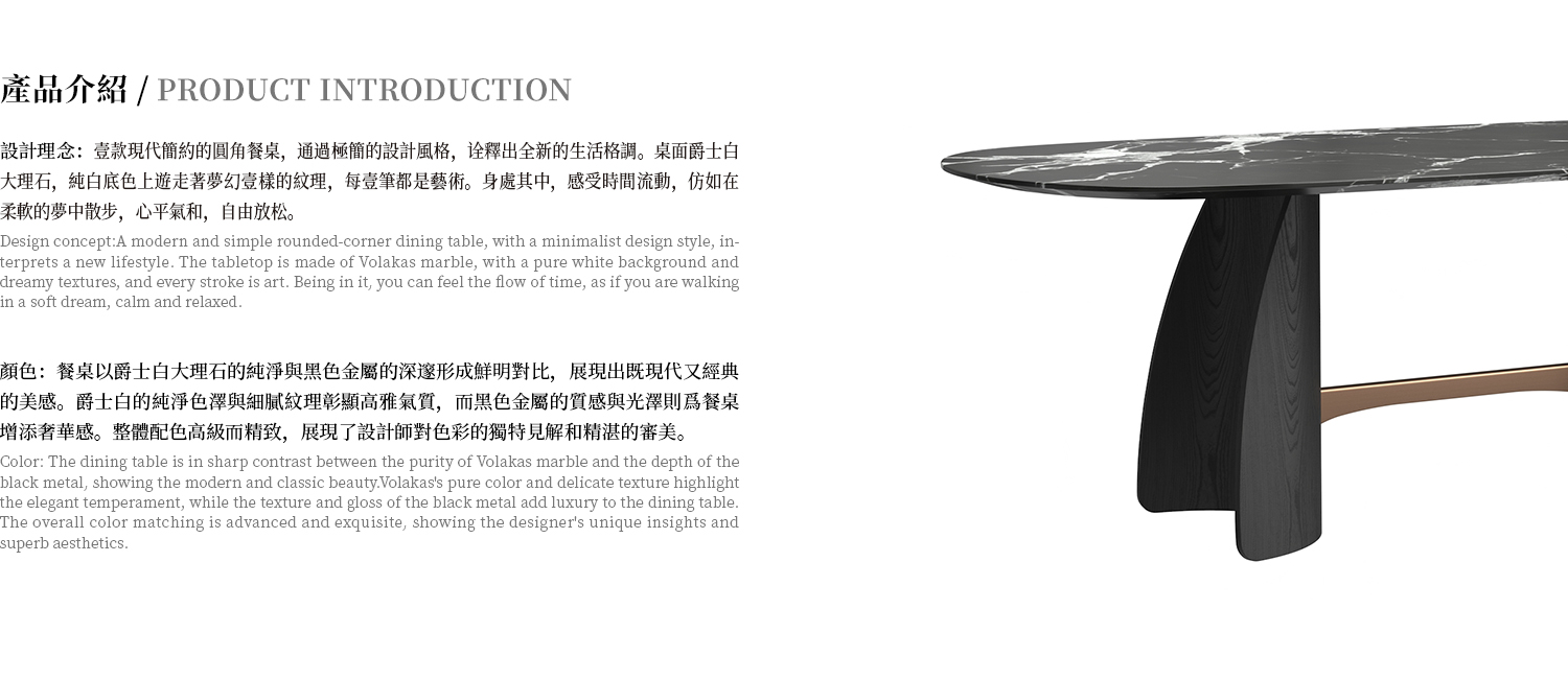 桌面為爵士白/寶格麗黑大理石,桌腳為白橡小山紋(桌腳中間支撐的拉條為金屬)。