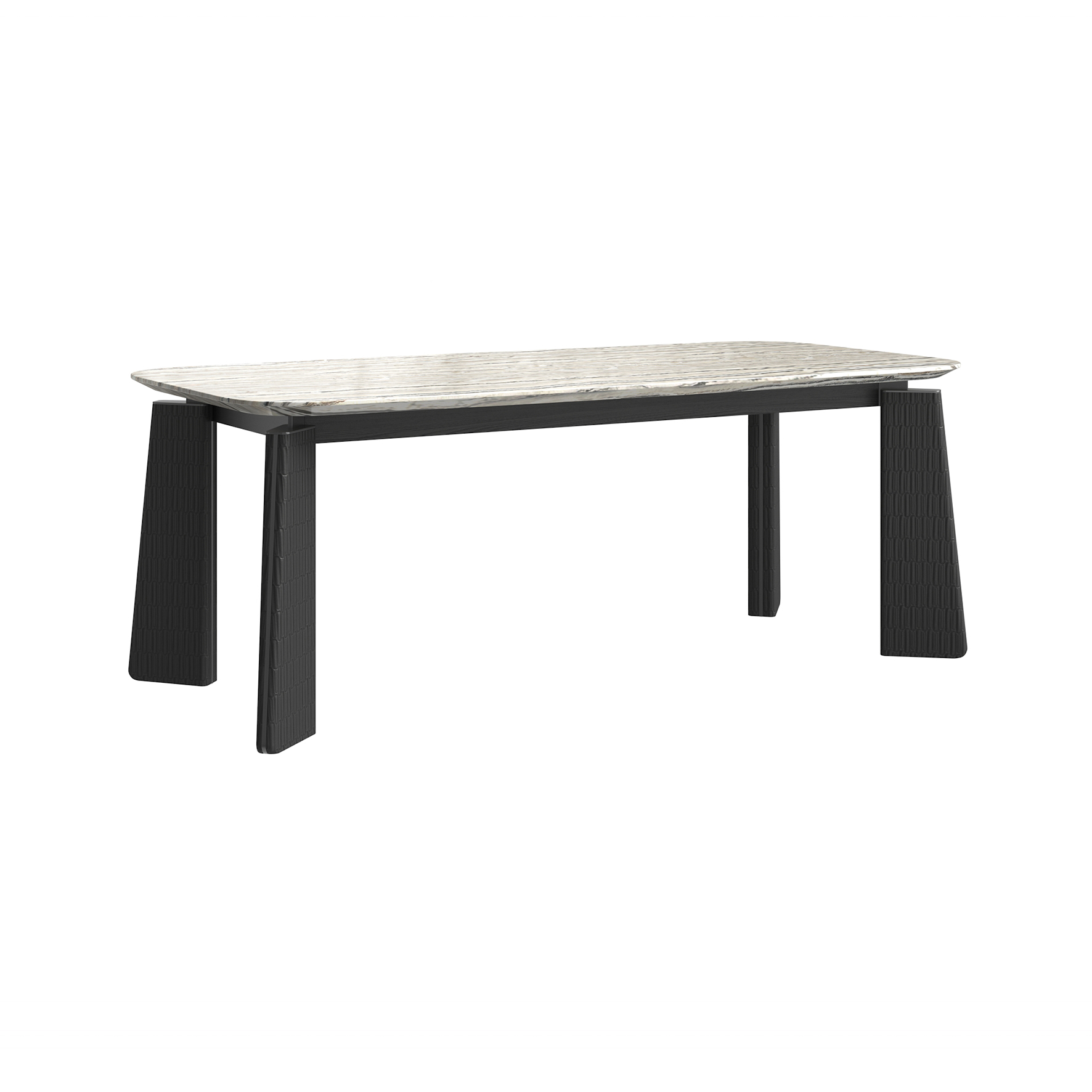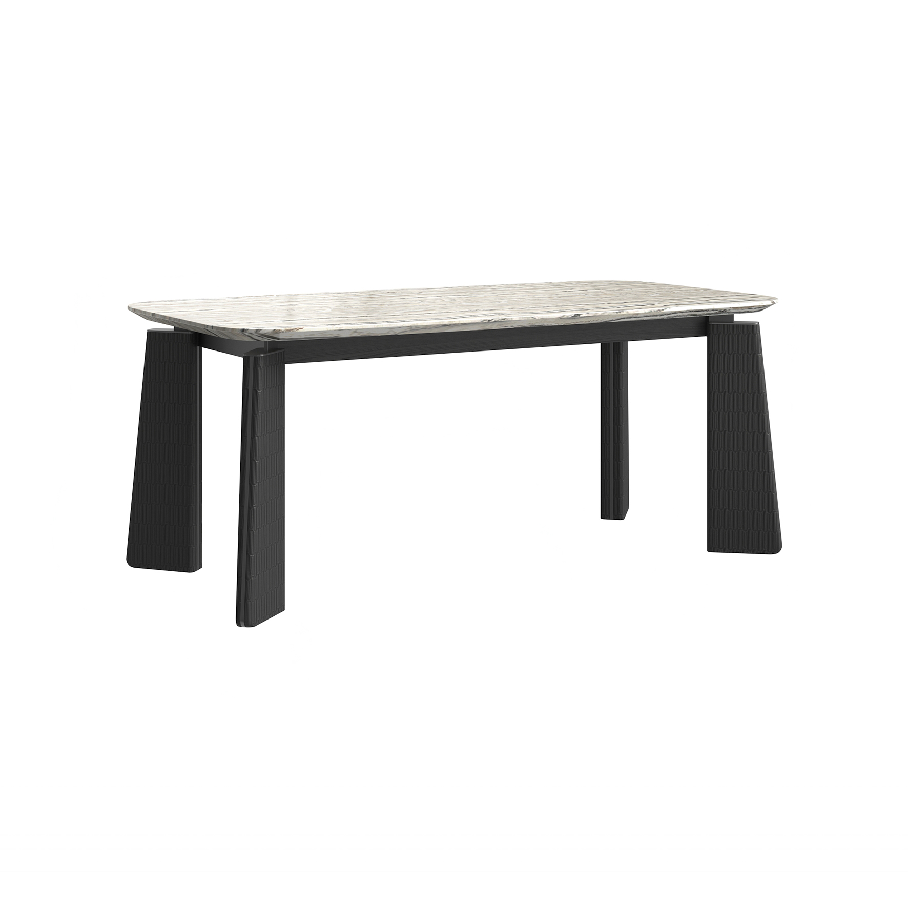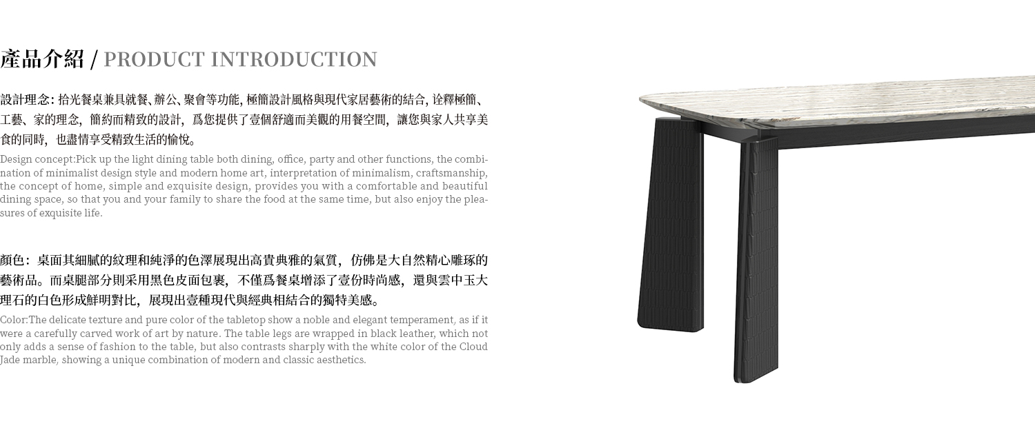 桌面為雲中玉大理石,桌腳絎縫車格紋線超纖皮包制 + 內嵌五金條。
