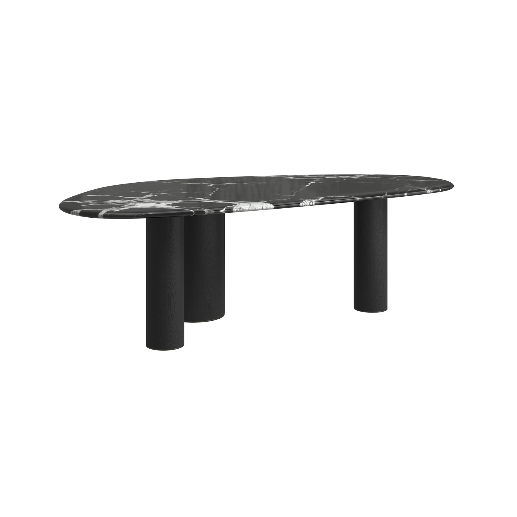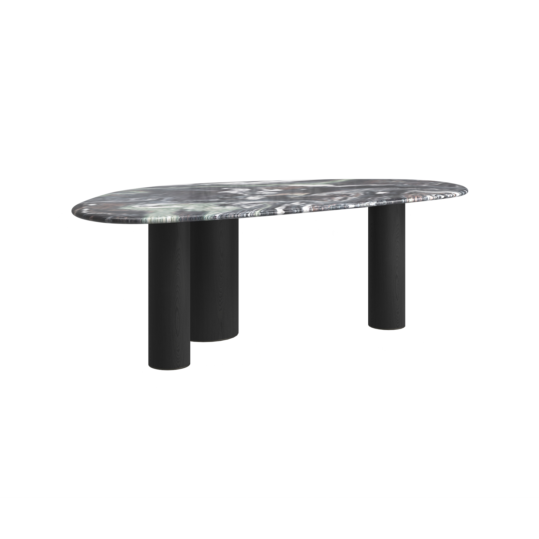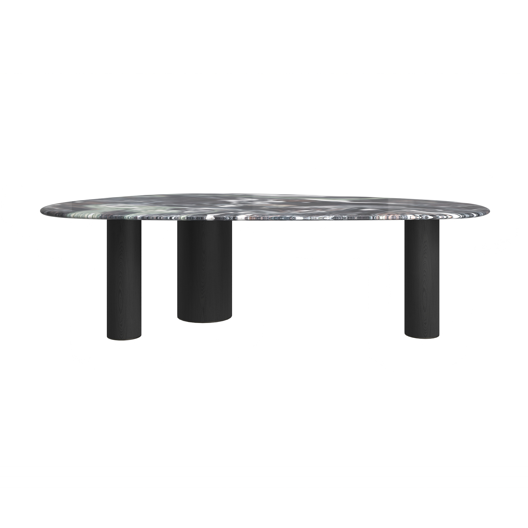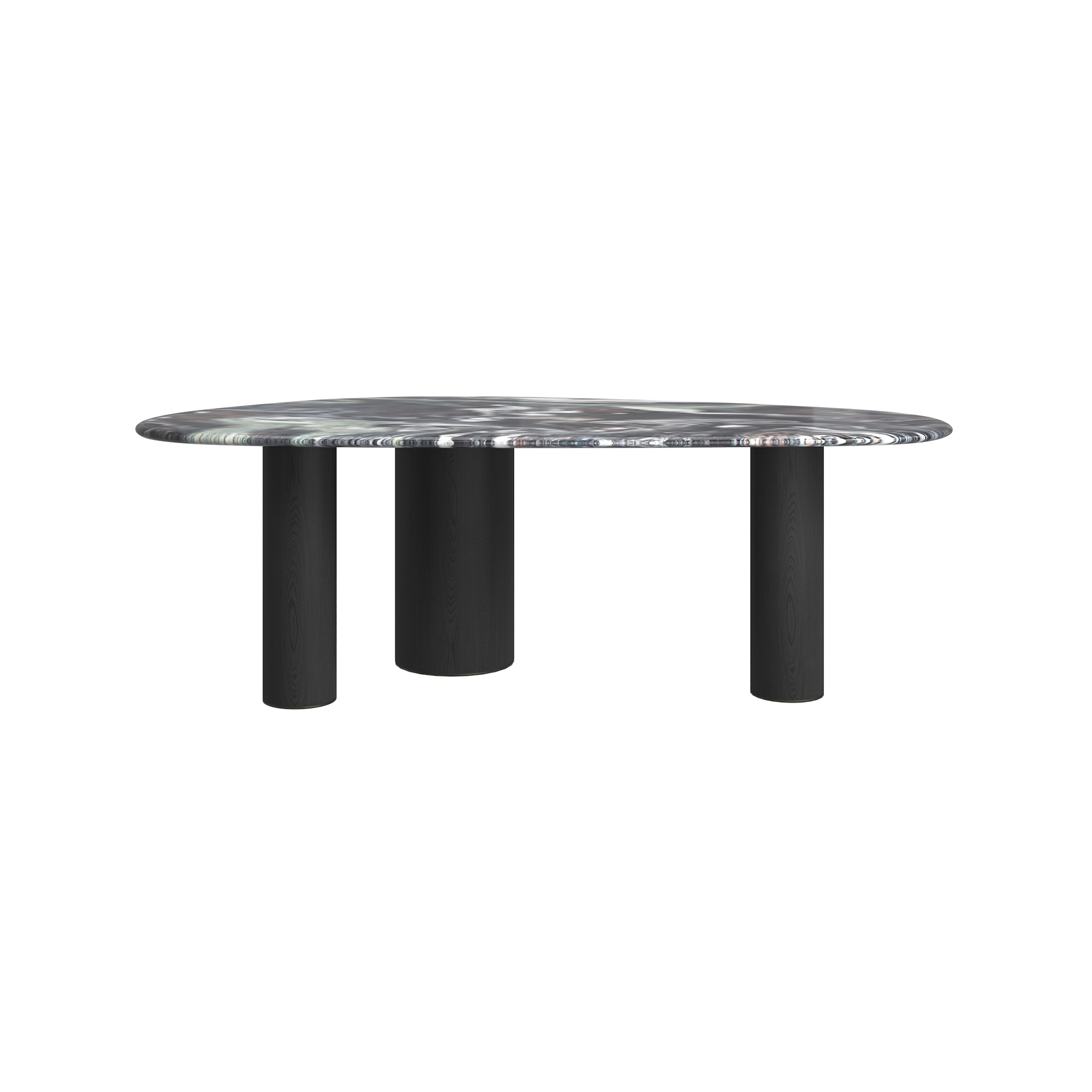 The tabletop is crafted from Purple Landscape/BulgariBlack marble, with wooden legs finished in black oak-tonedwhite oak mountain-pattern veneer and supported by metalfeet.
