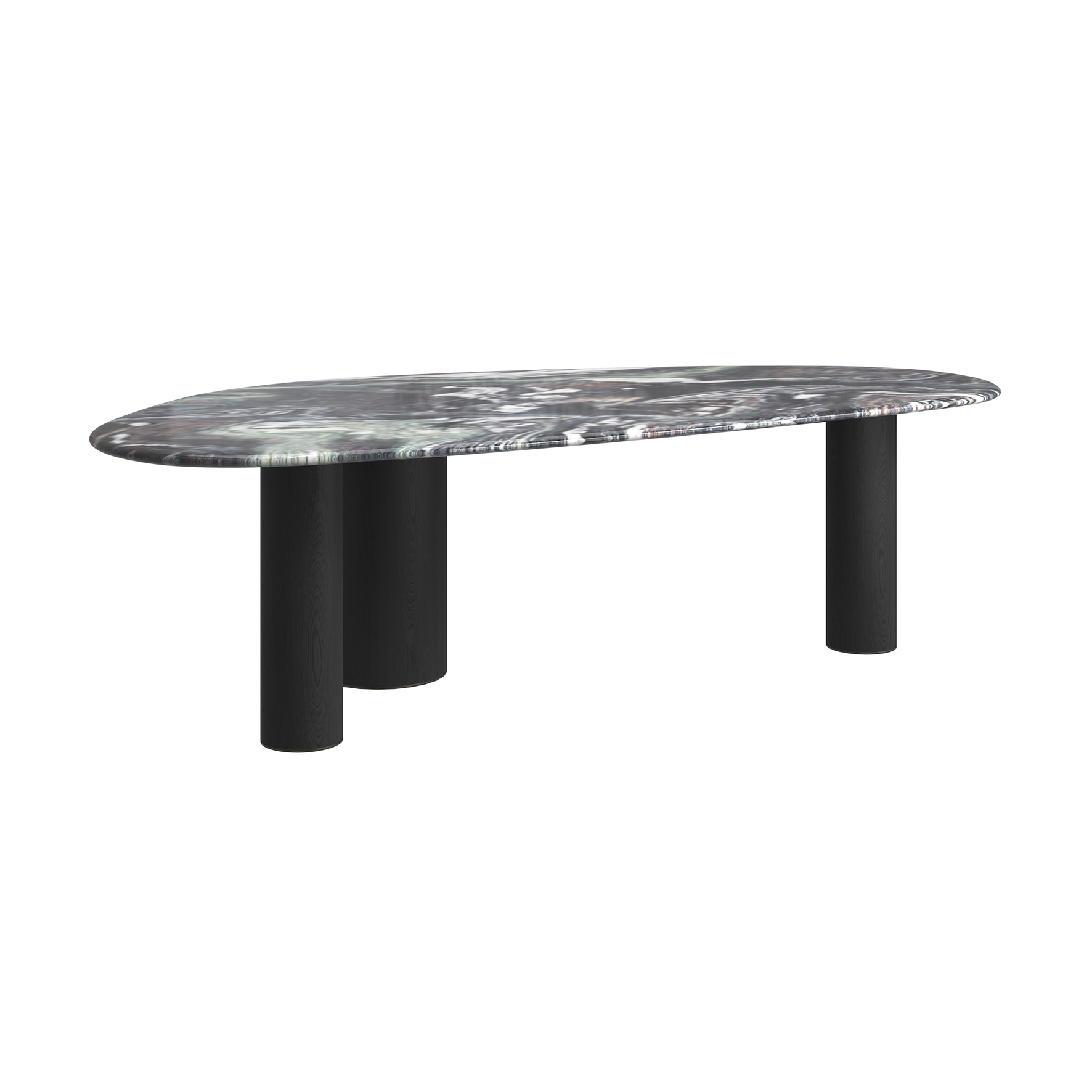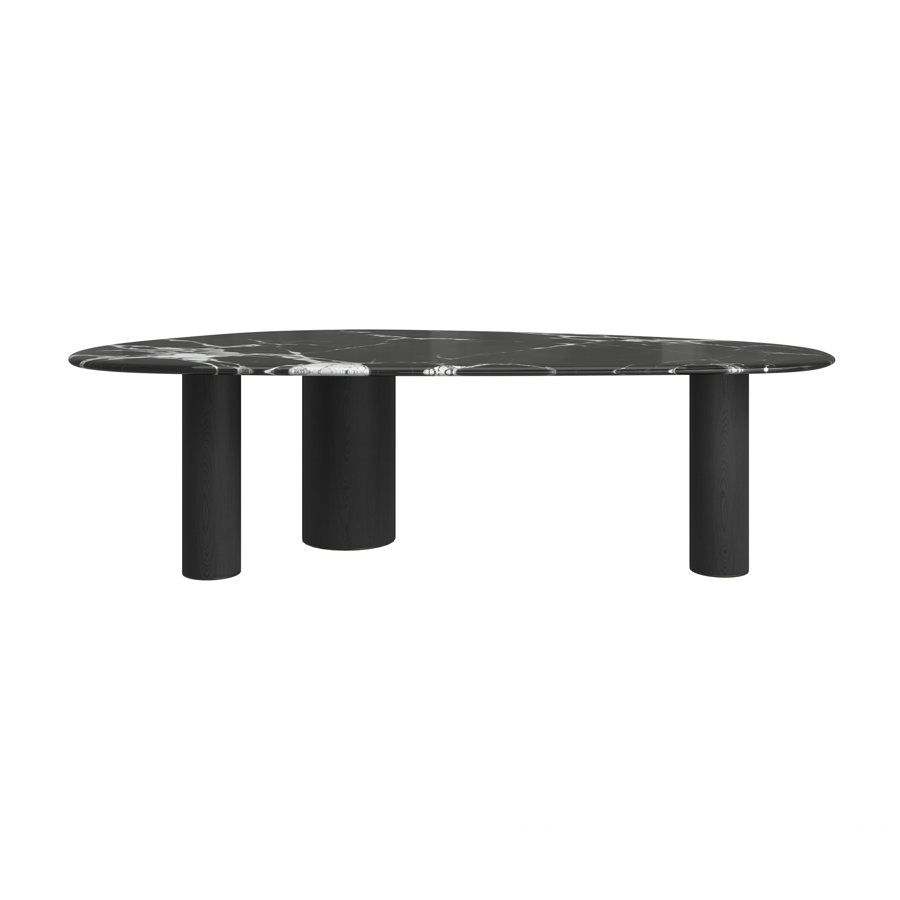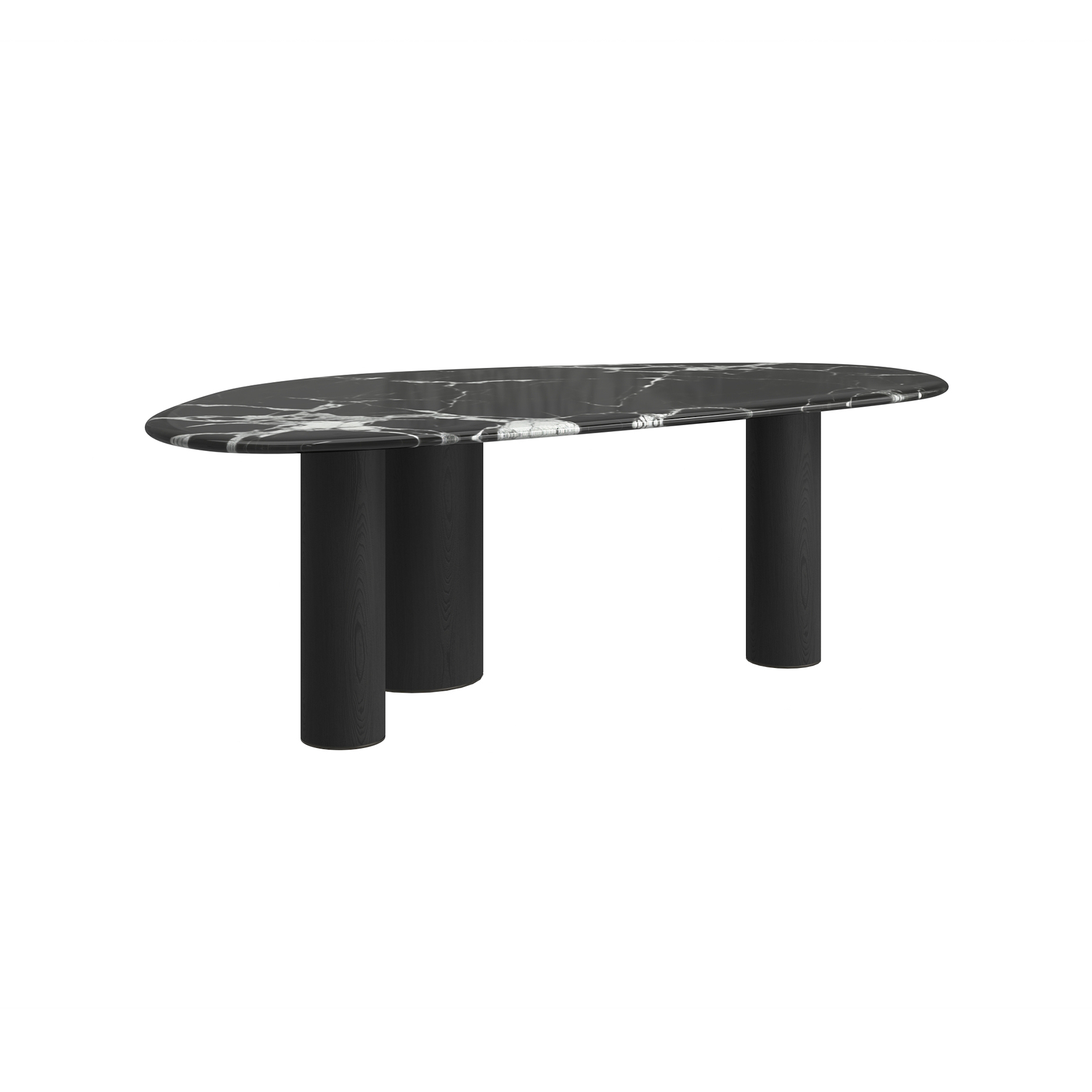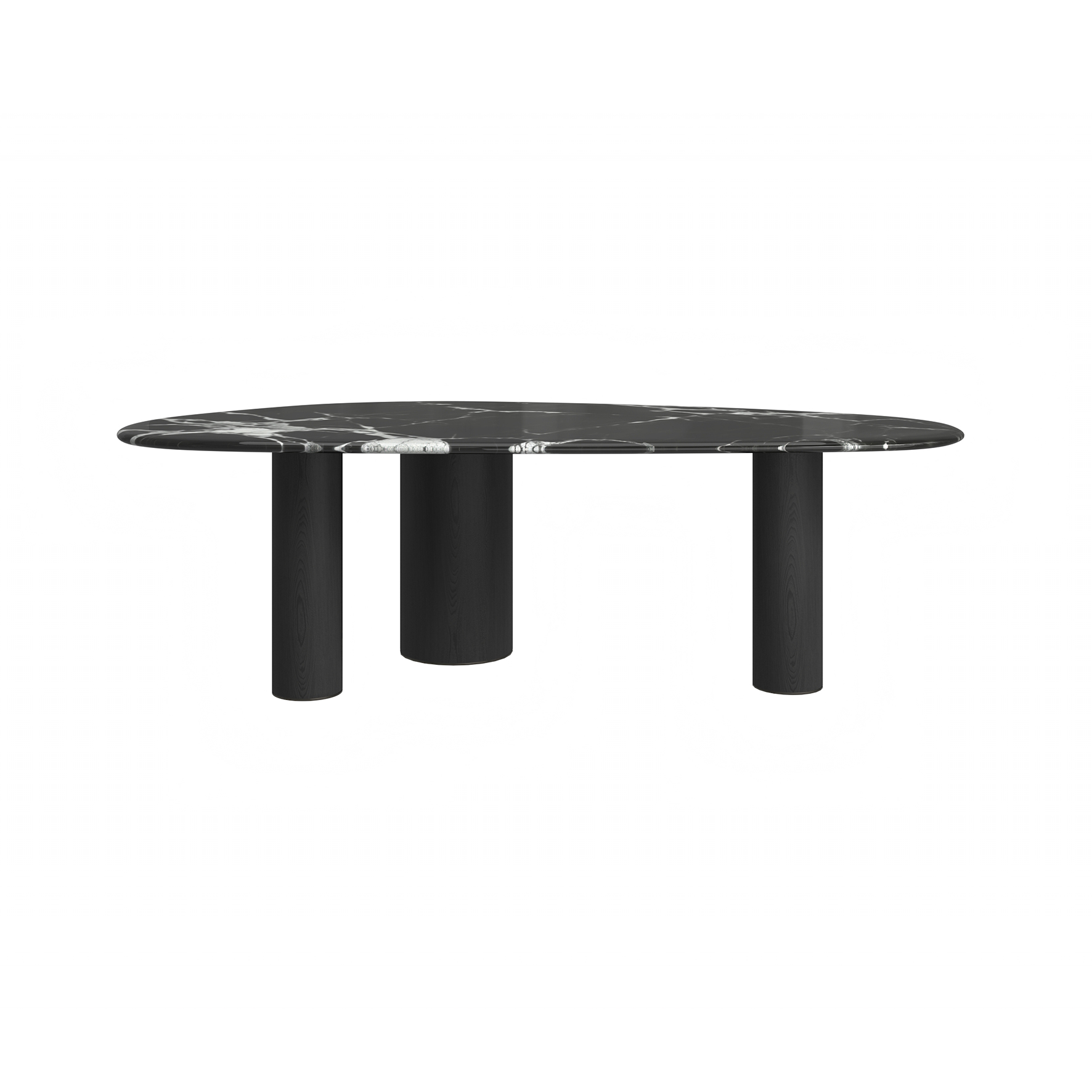 The tabletop is crafted from Purple Landscape/BulgariBlack marble, with wooden legs finished in black oak-tonedwhite oak mountain-pattern veneer and supported by metalfeet.
