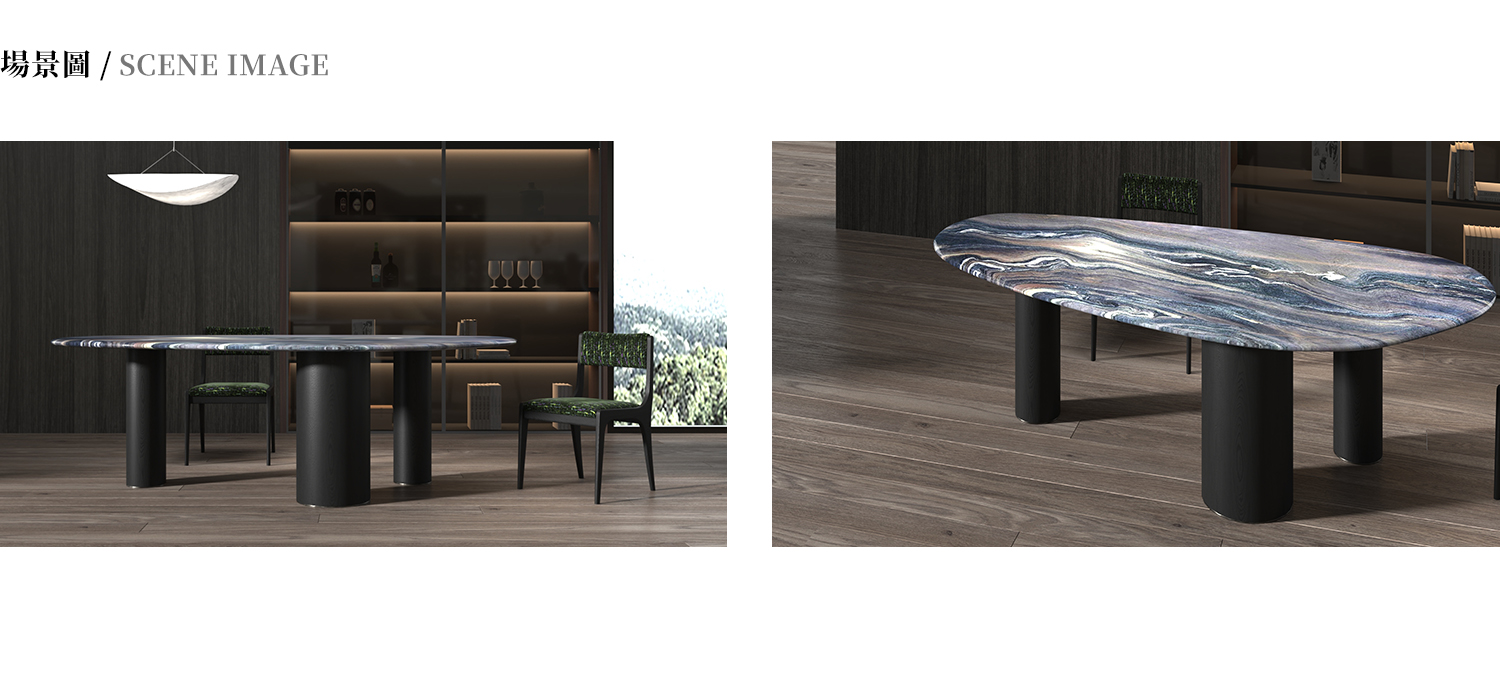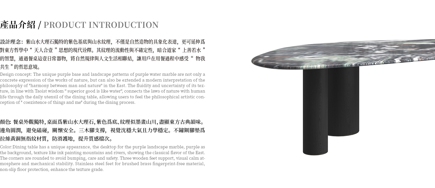 桌面為紫山水/寶格麗黑大理石,木桌腳貼黑橡色白橡小山紋,金屬腳墊。