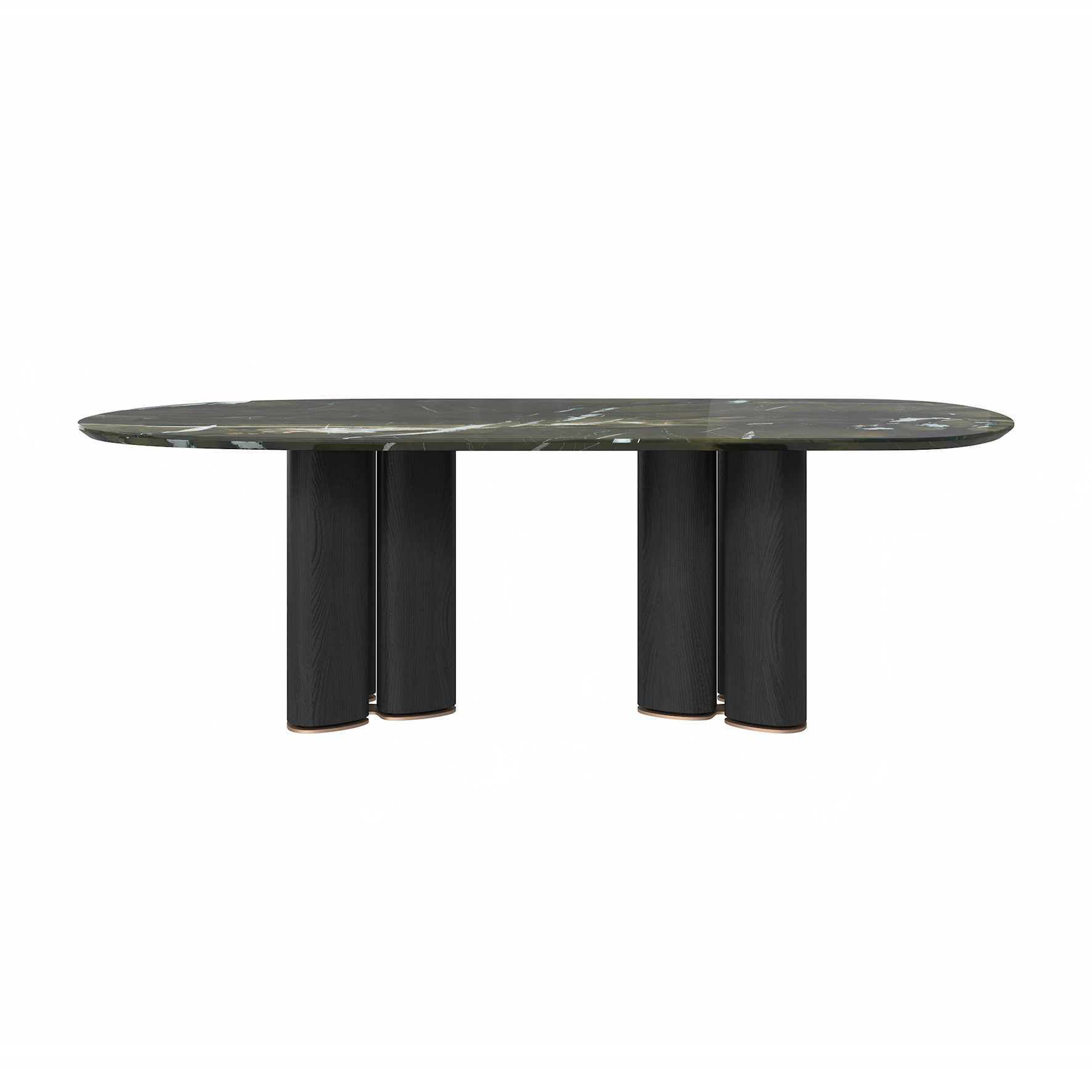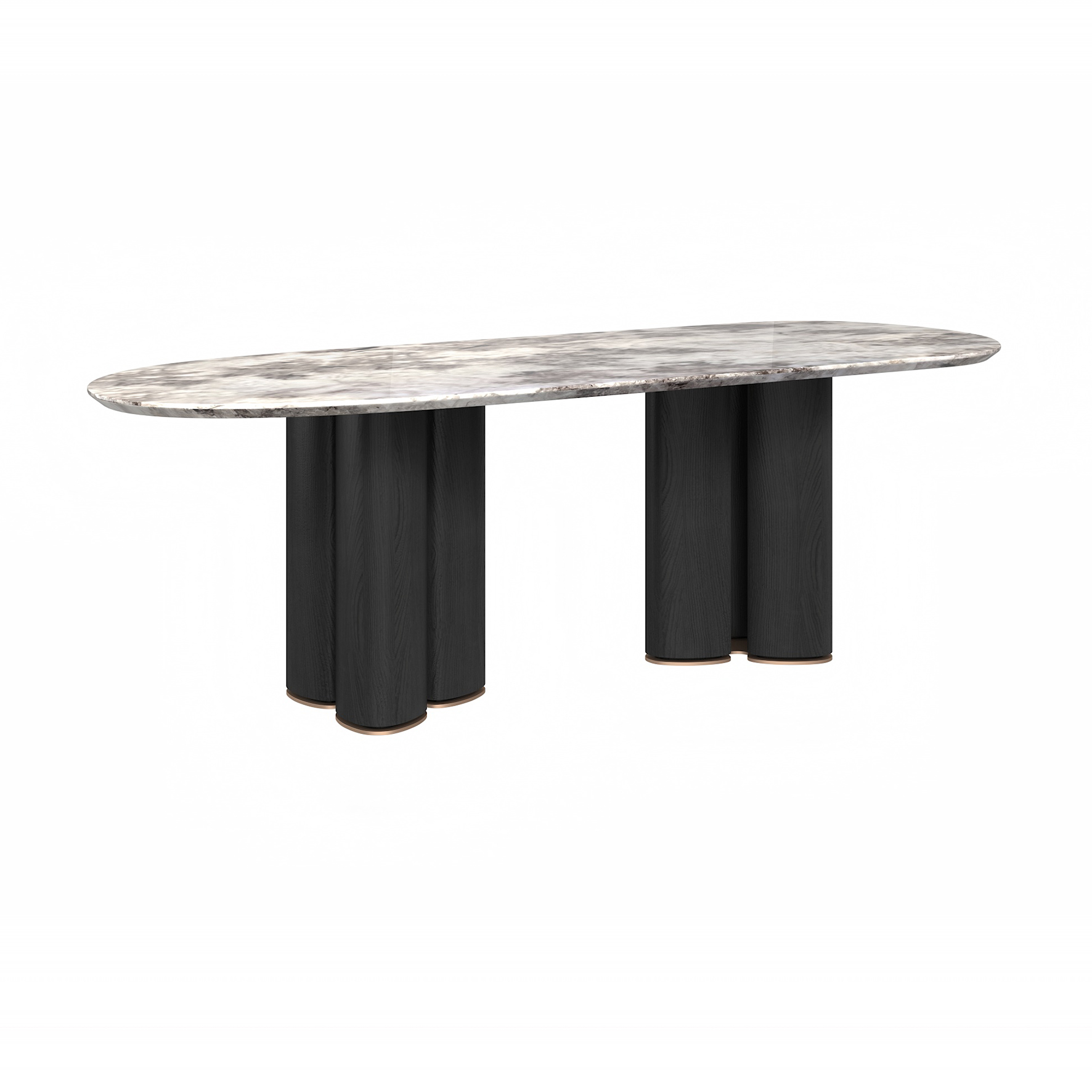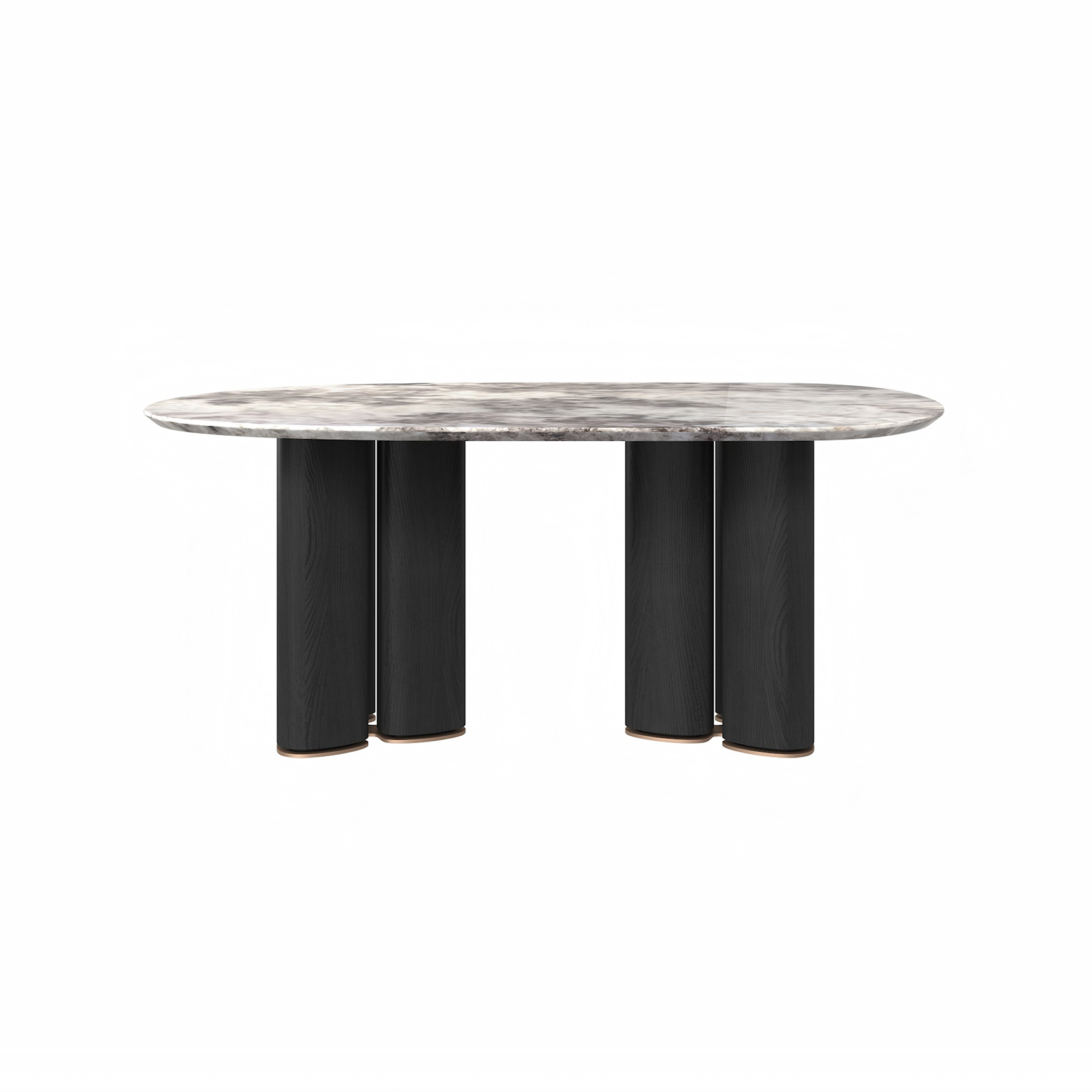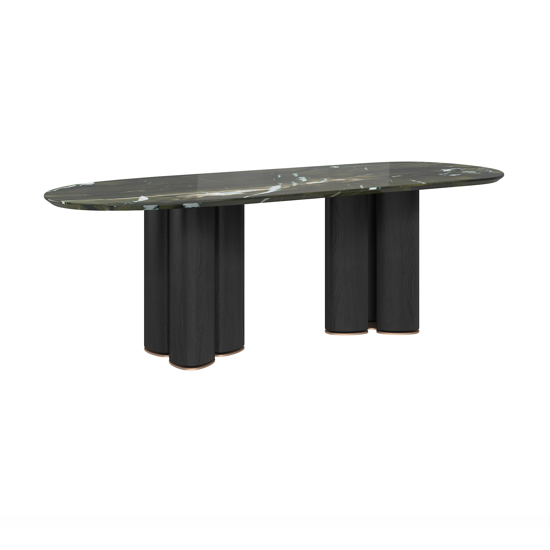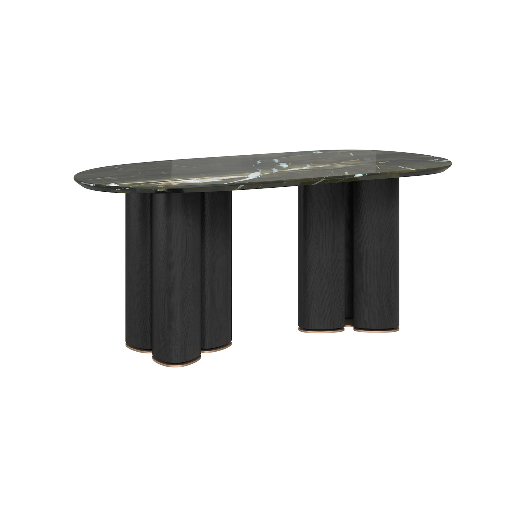The tabletop is crafted from Paradise Bird/Snow Fox/Avoca-do Green marble, with legs finished in white oak moun-tain-pattern veneer and supported by metal feet.