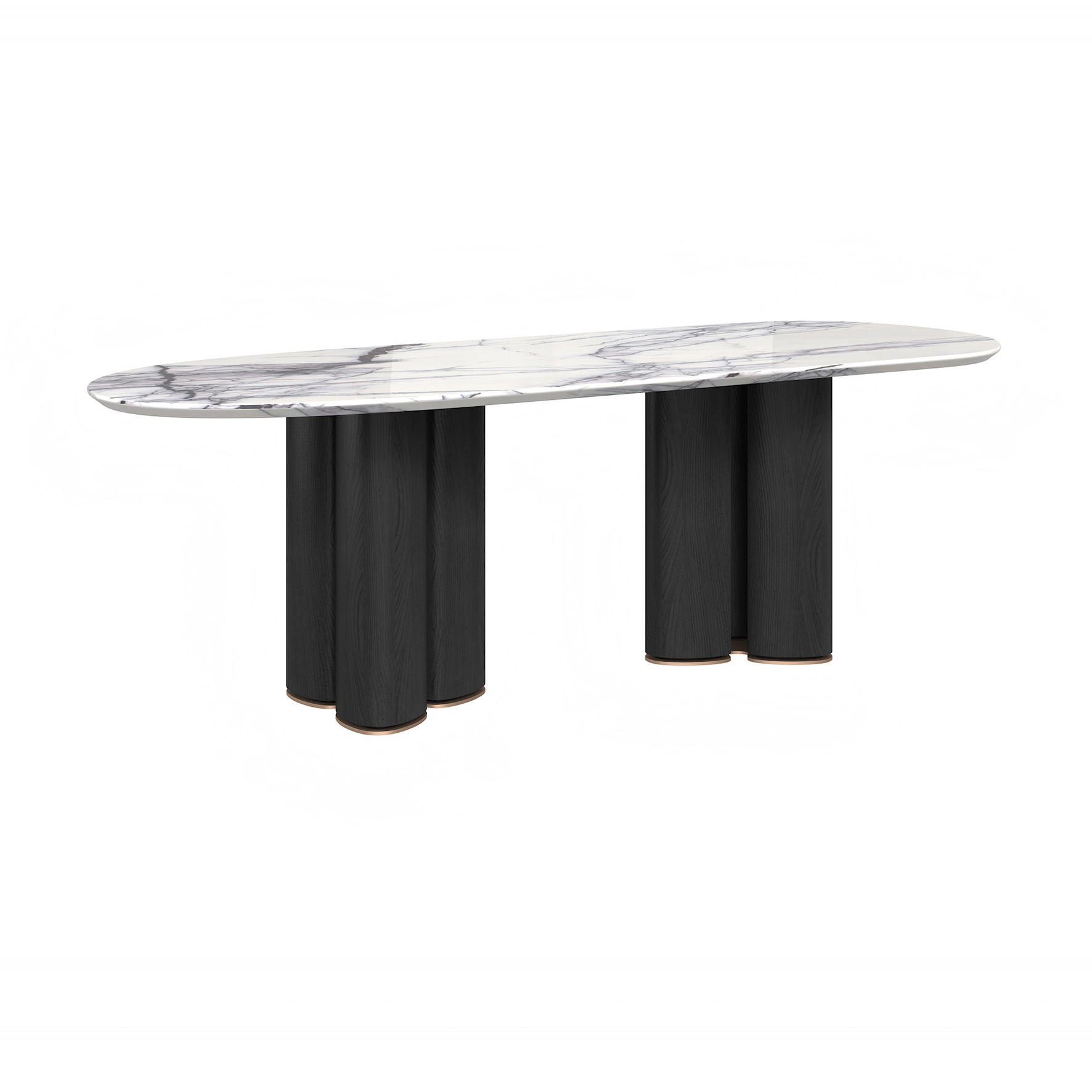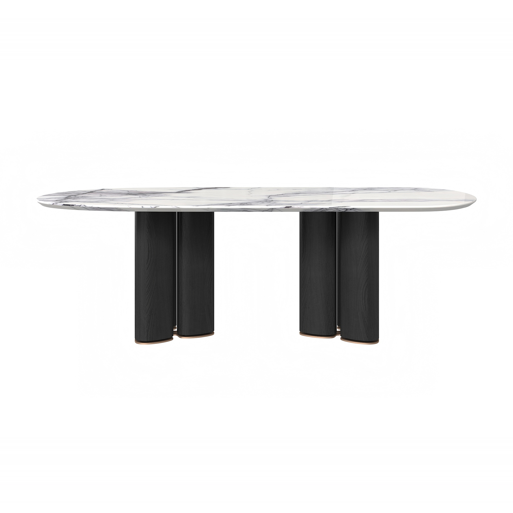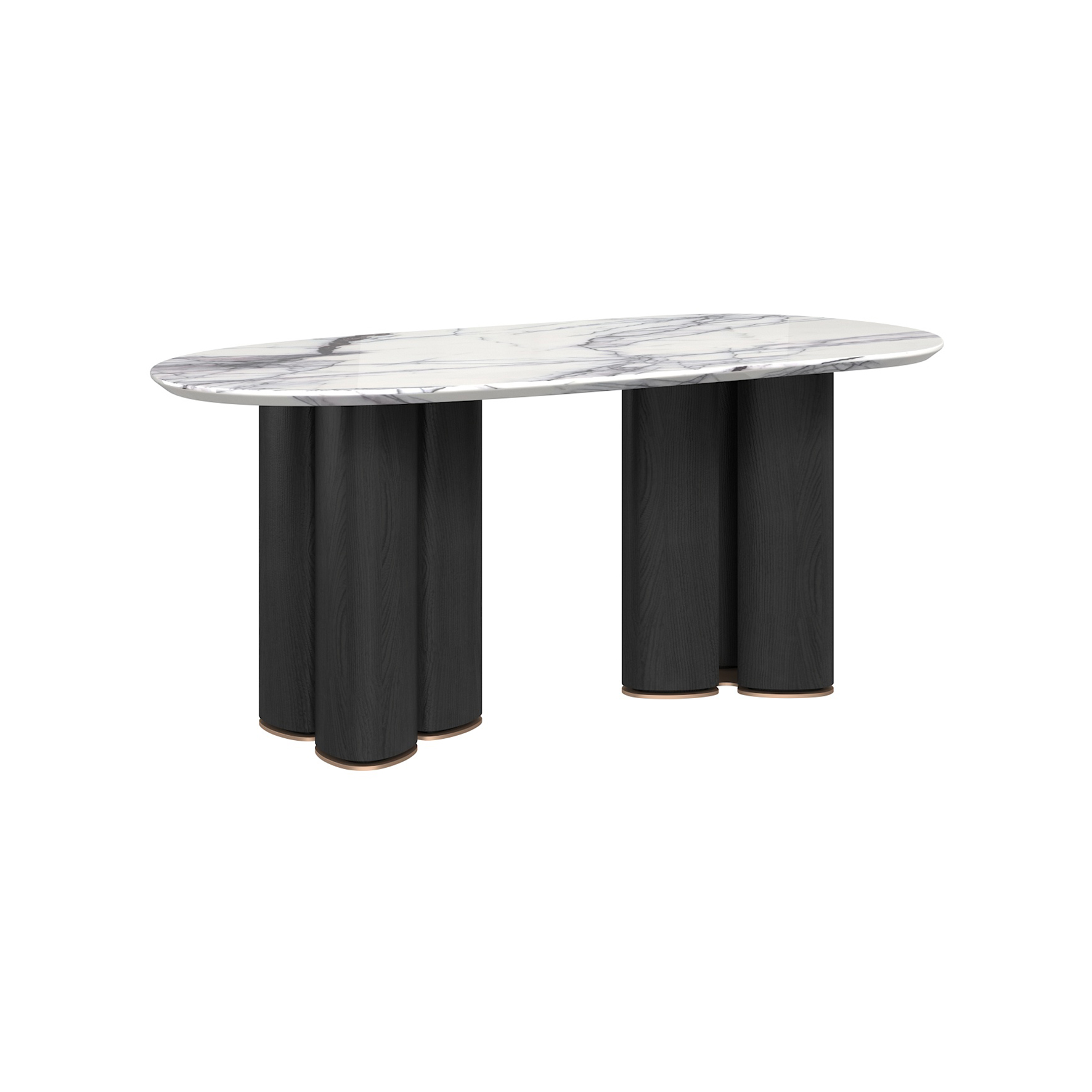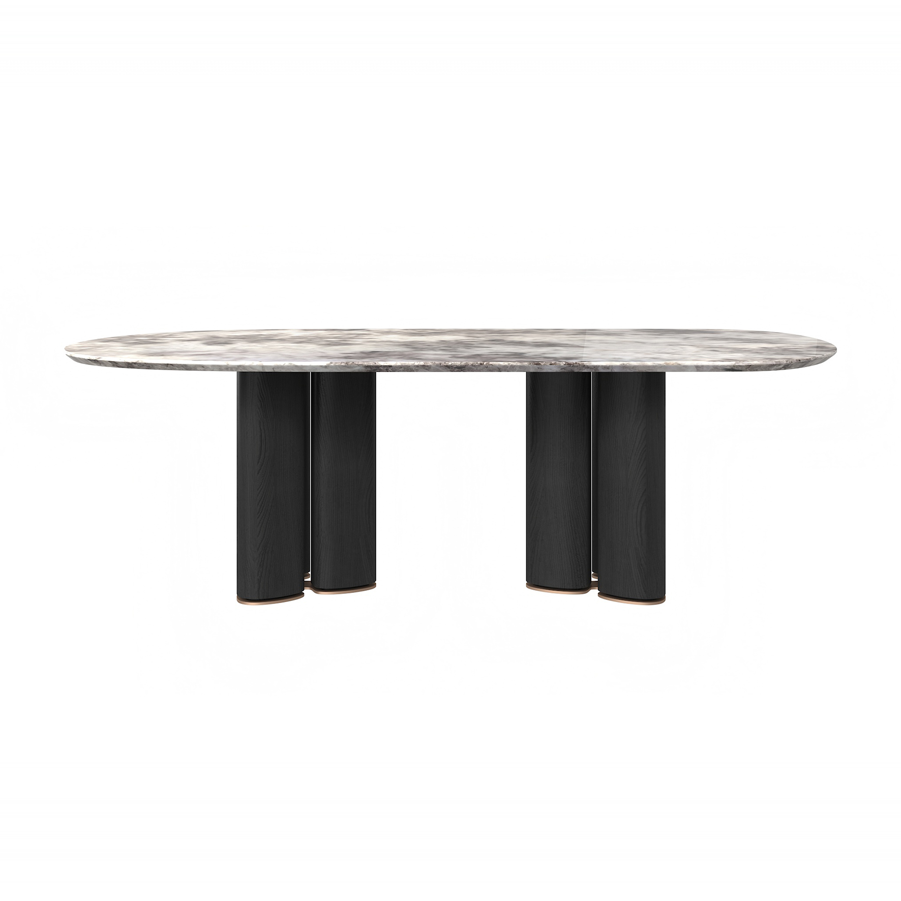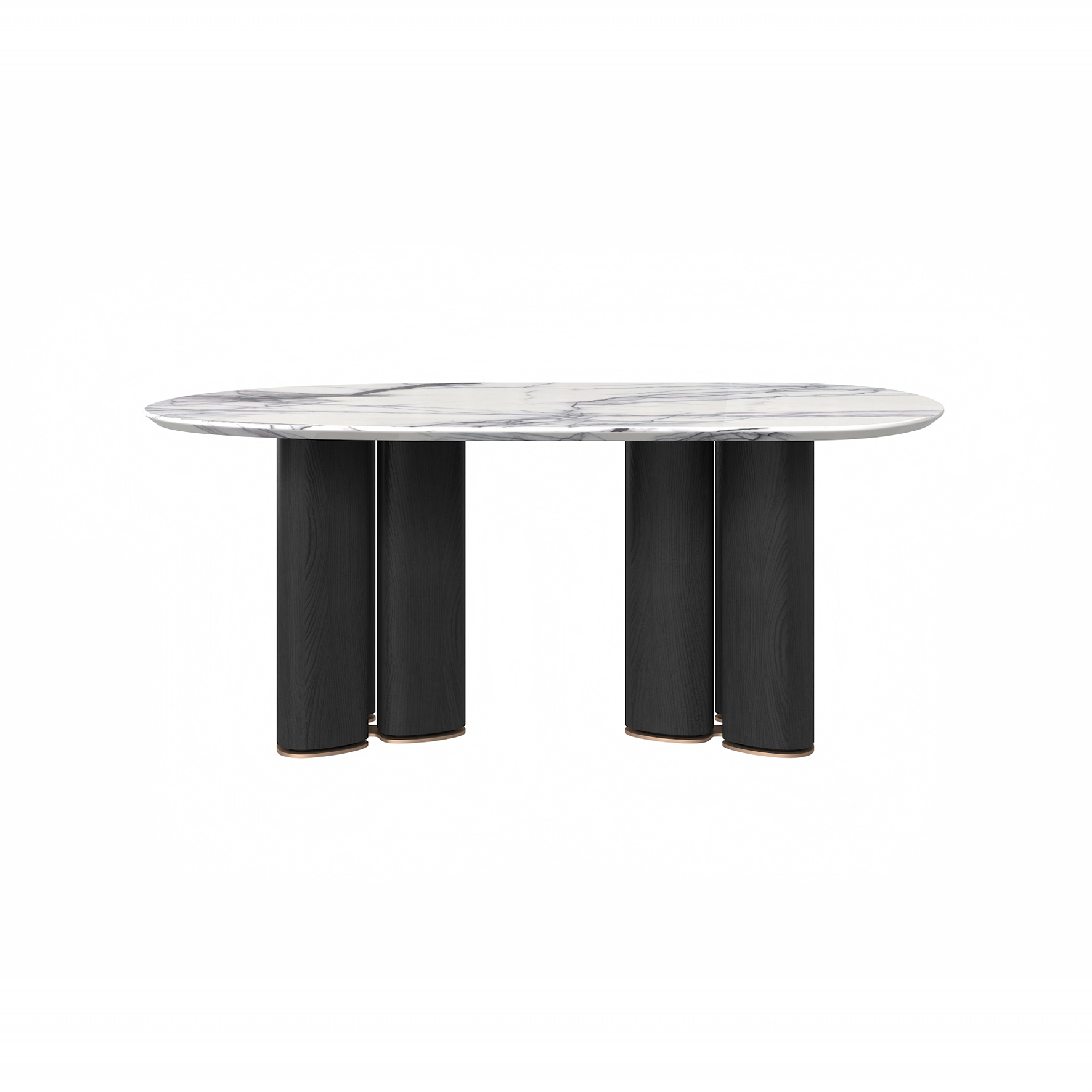 The tabletop is crafted from Paradise Bird/Snow Fox/Avoca-do Green marble, with legs finished in white oak moun-tain-pattern veneer and supported by metal feet.
