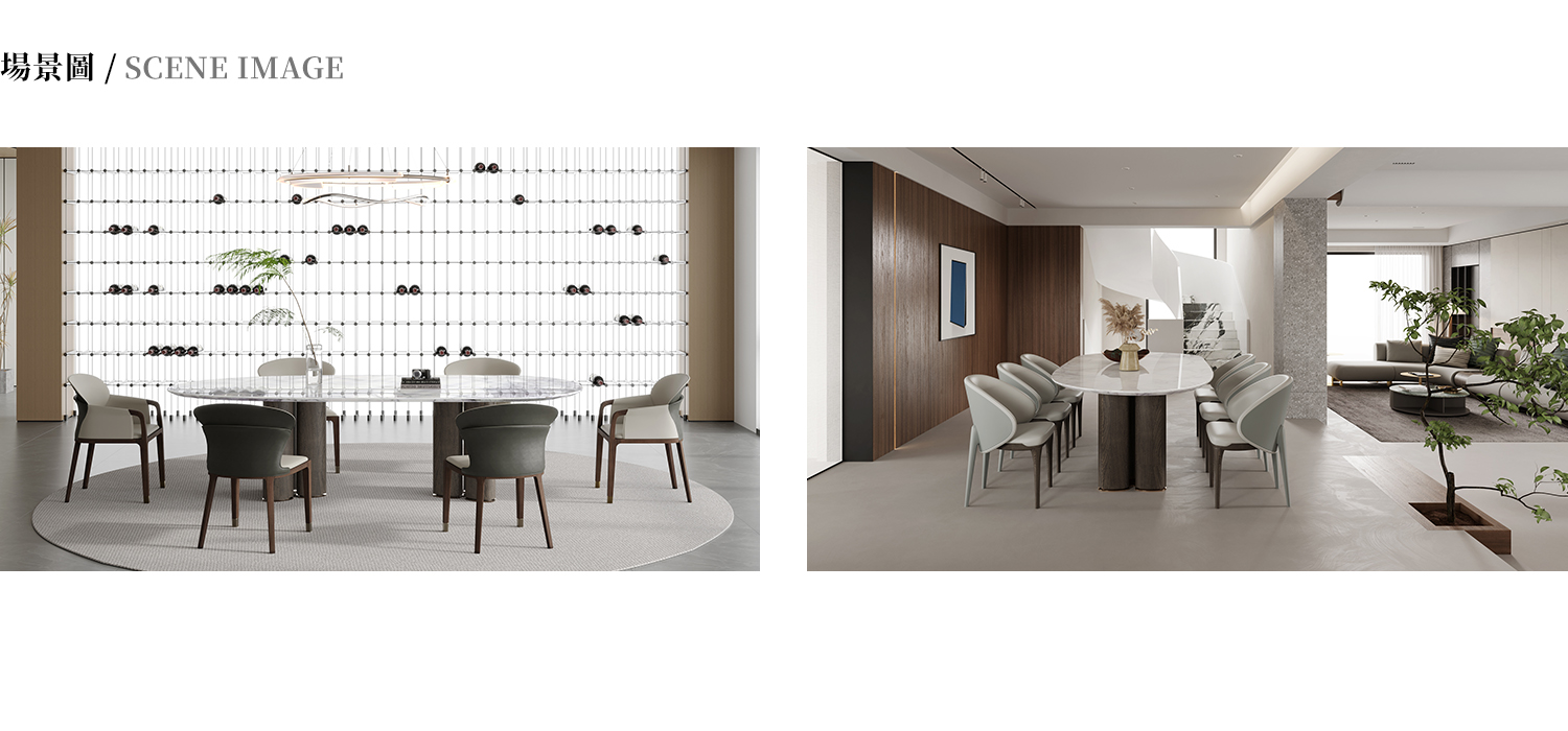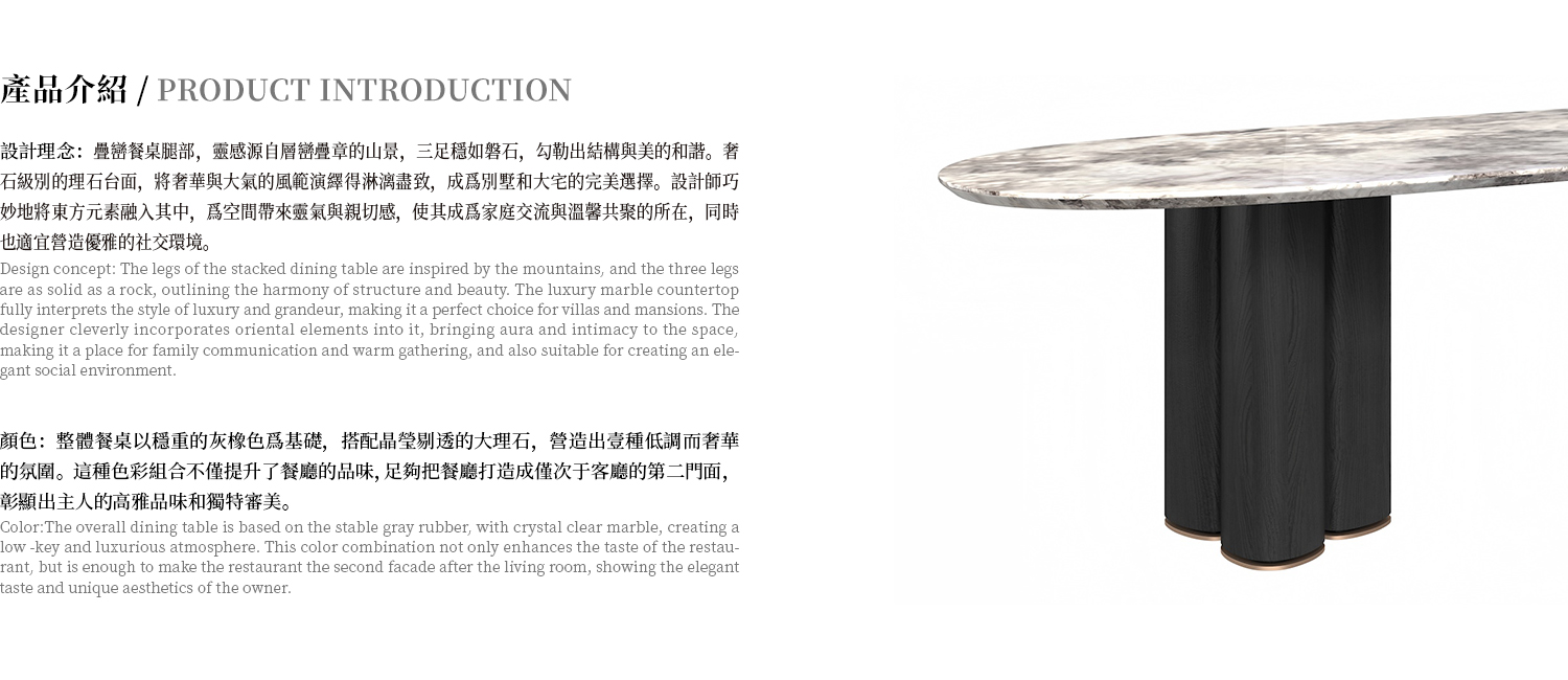 桌面為天堂鳥/雪山飛狐/牛油果綠大理石,桌腳為白橡小山紋木皮,金屬腳墊。