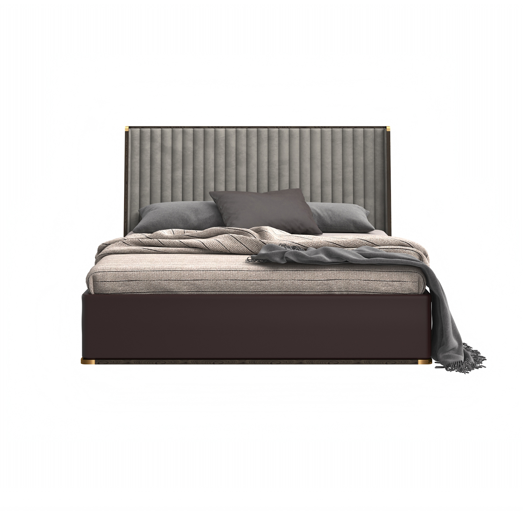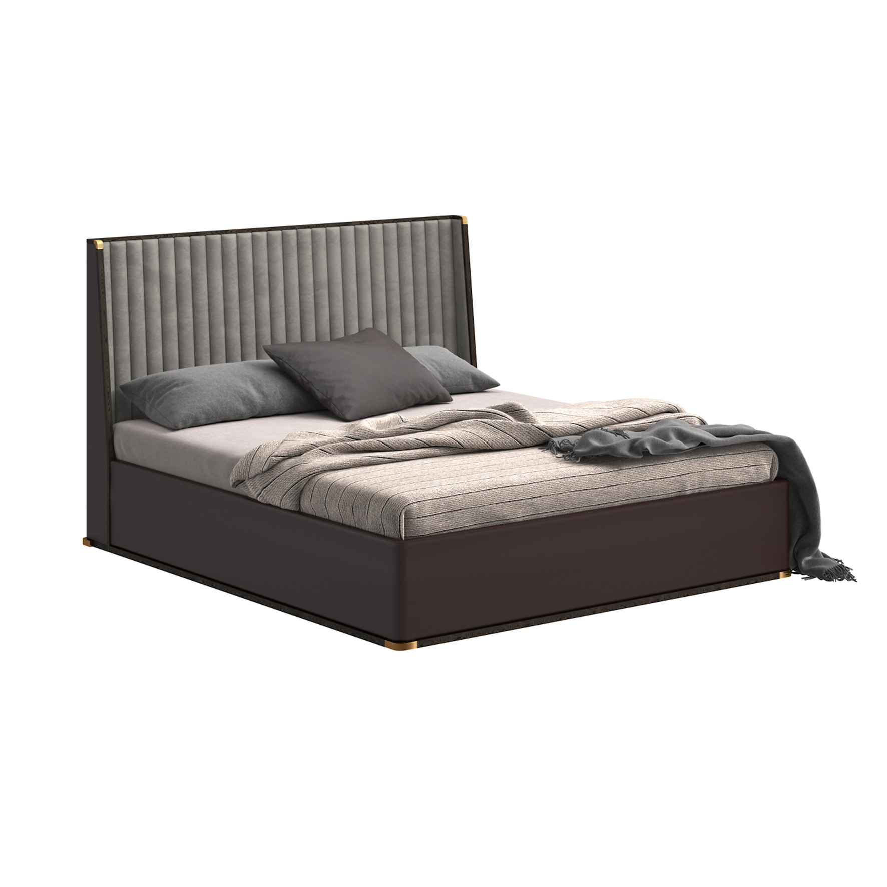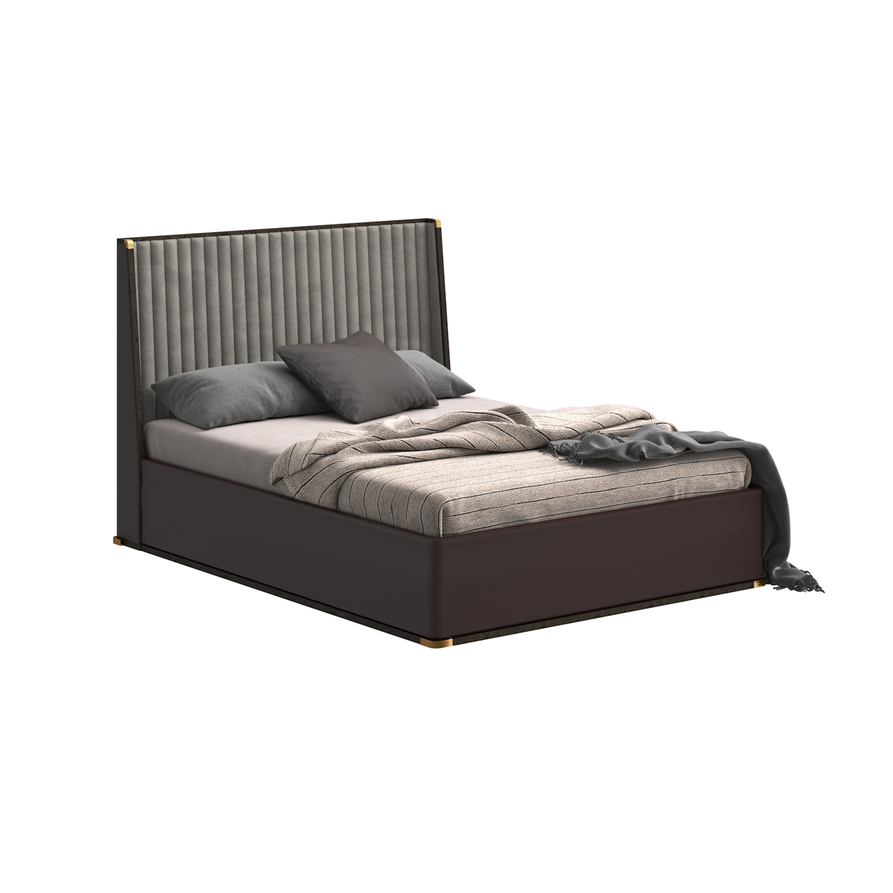 Solid wood frame with the bed structure featuring fabric up-holstery, ultra-fiber leather, solid ash wood, and metalaccents.