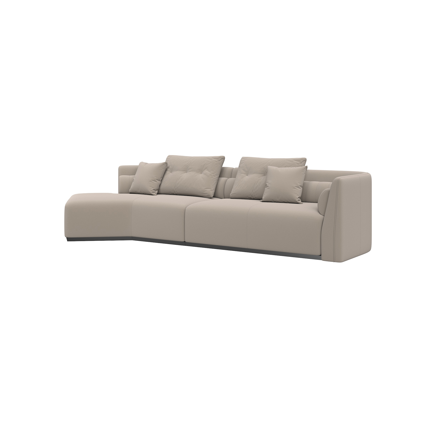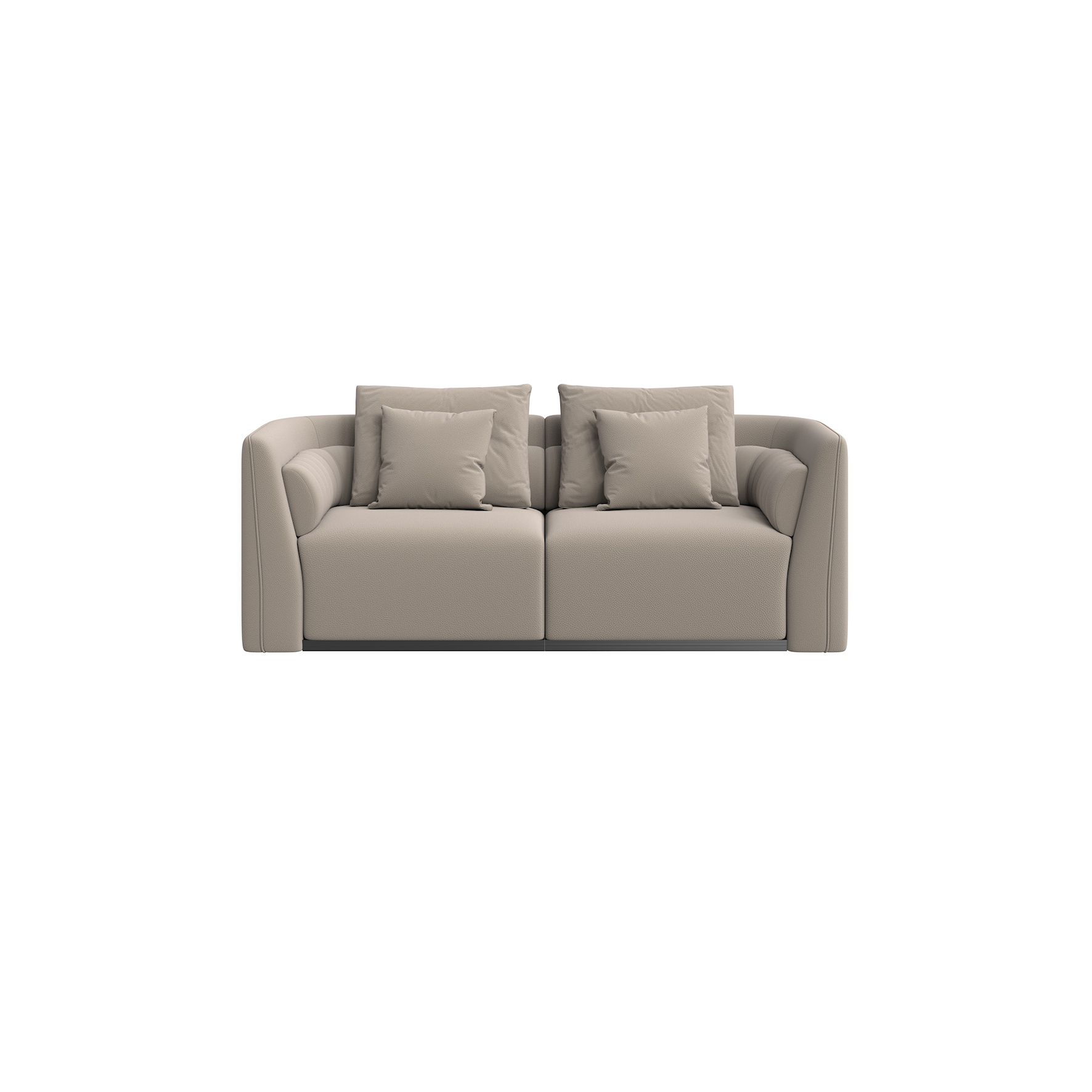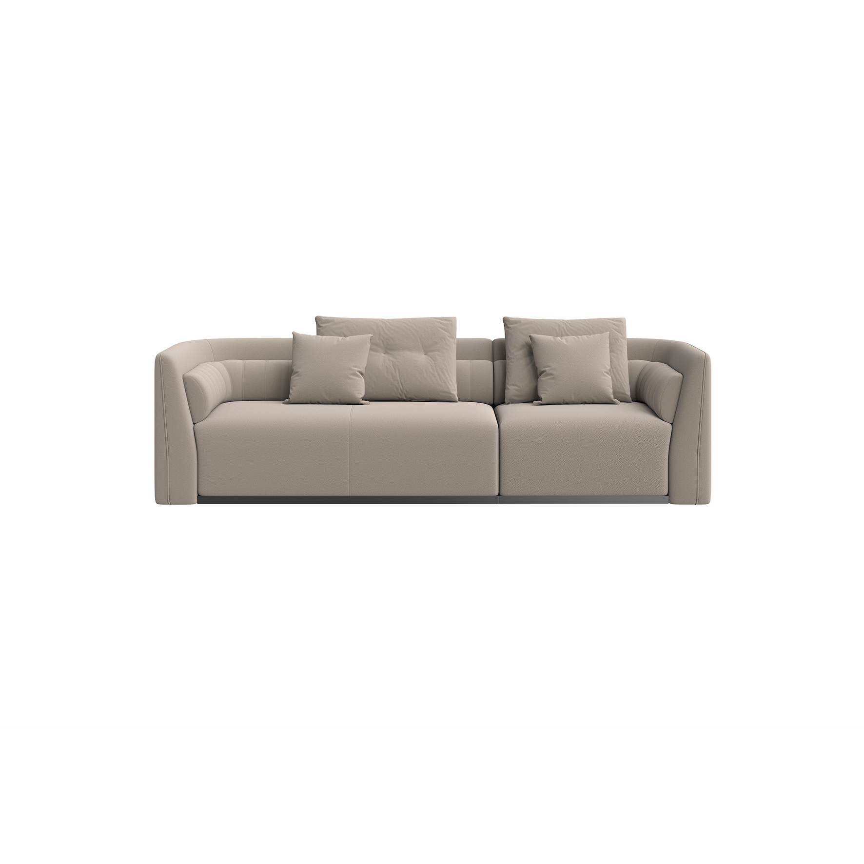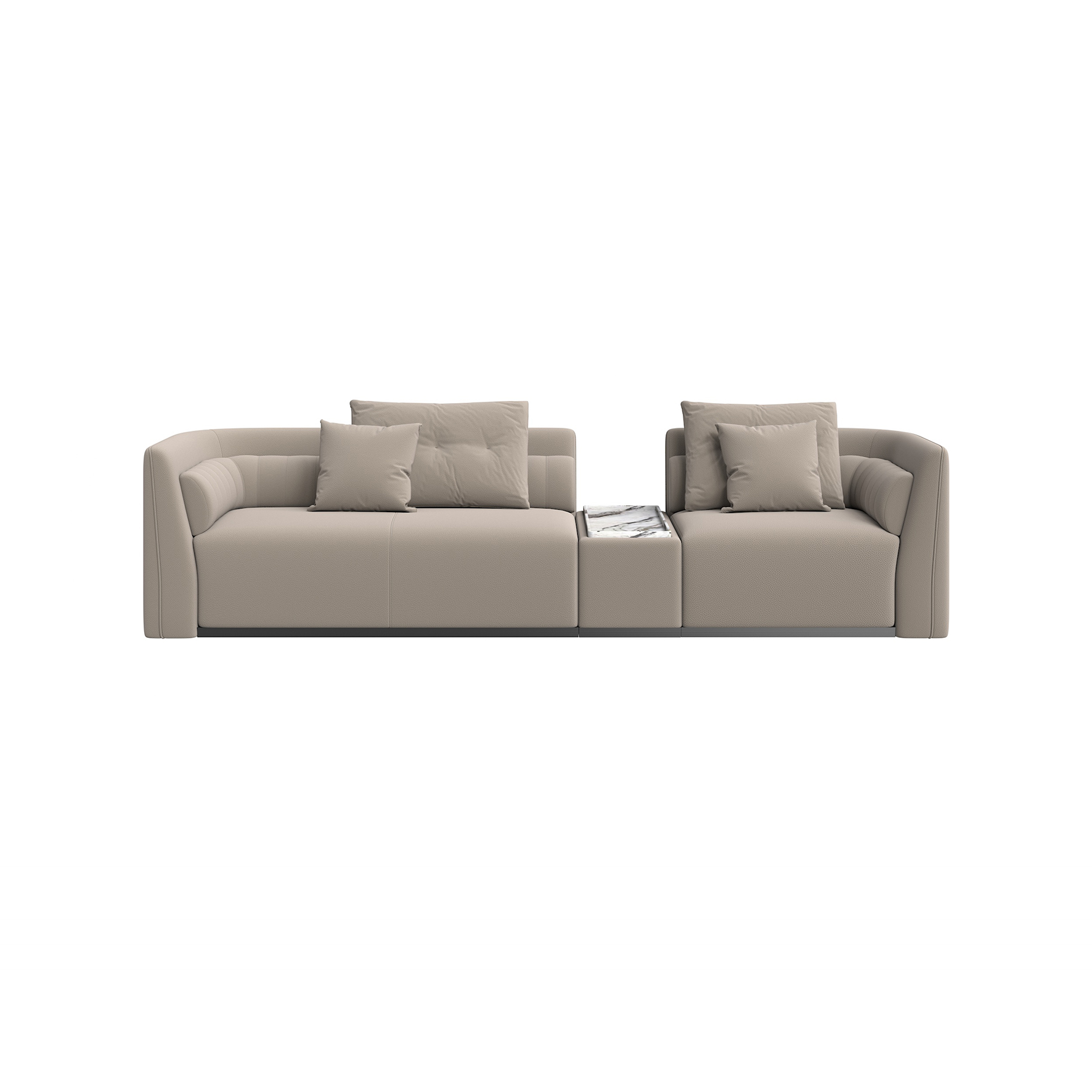 The sofa is leather-wrapped throughout, with an E0-grade solid wood multilayer frame, inserted with a few table tops em-bedded in Siena White marble and a 304 brushed stainless steel base.