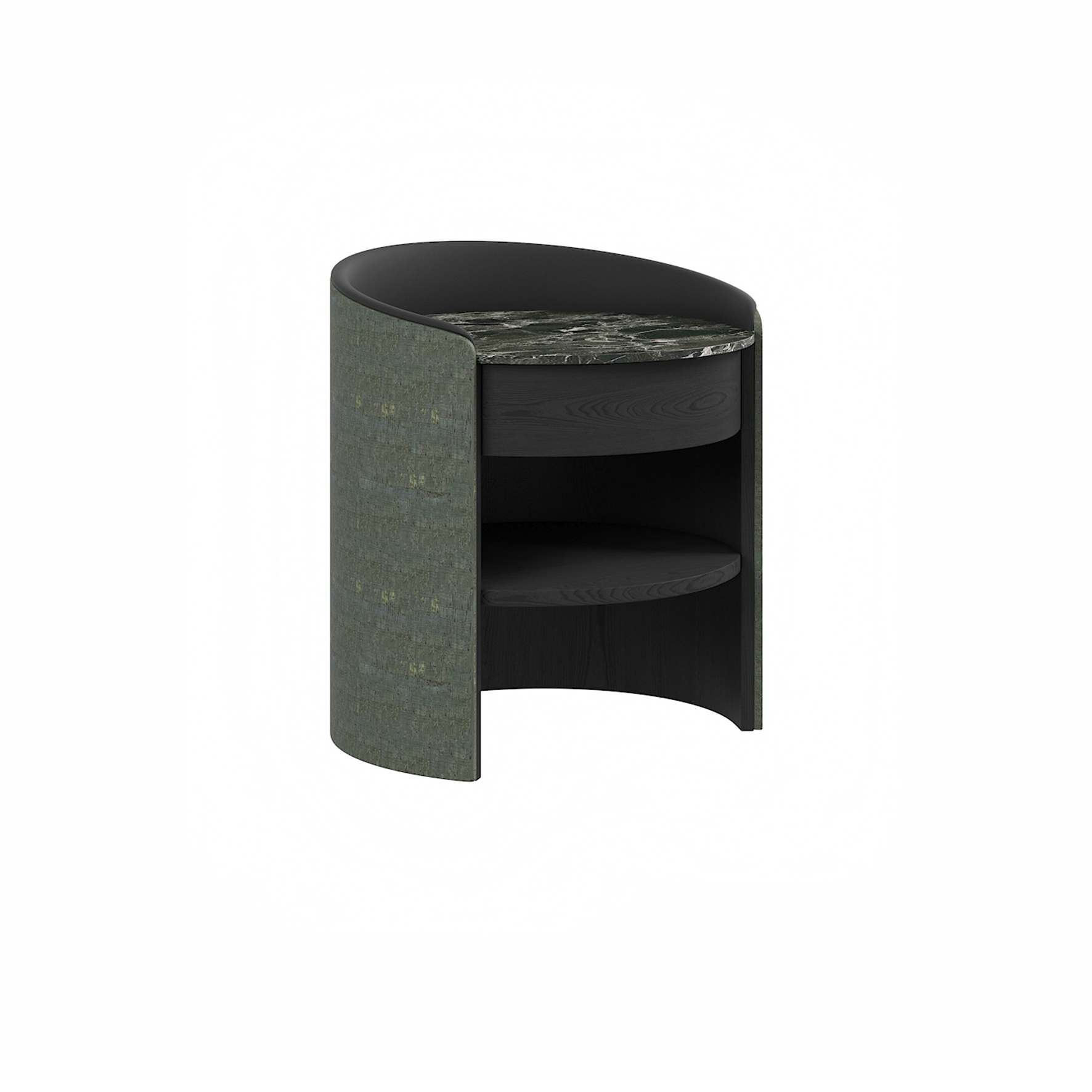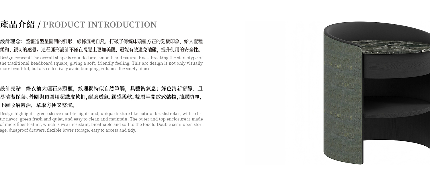 床頭櫃檯面為綠衣袖大理石,頂圍硬棉軟扪,抽面 + 活動層板為白橡小山紋木皮,外側板皮革硬包。