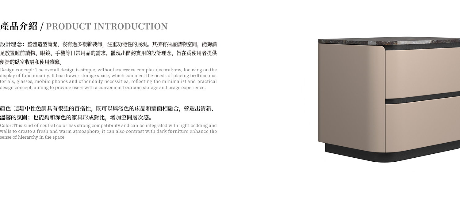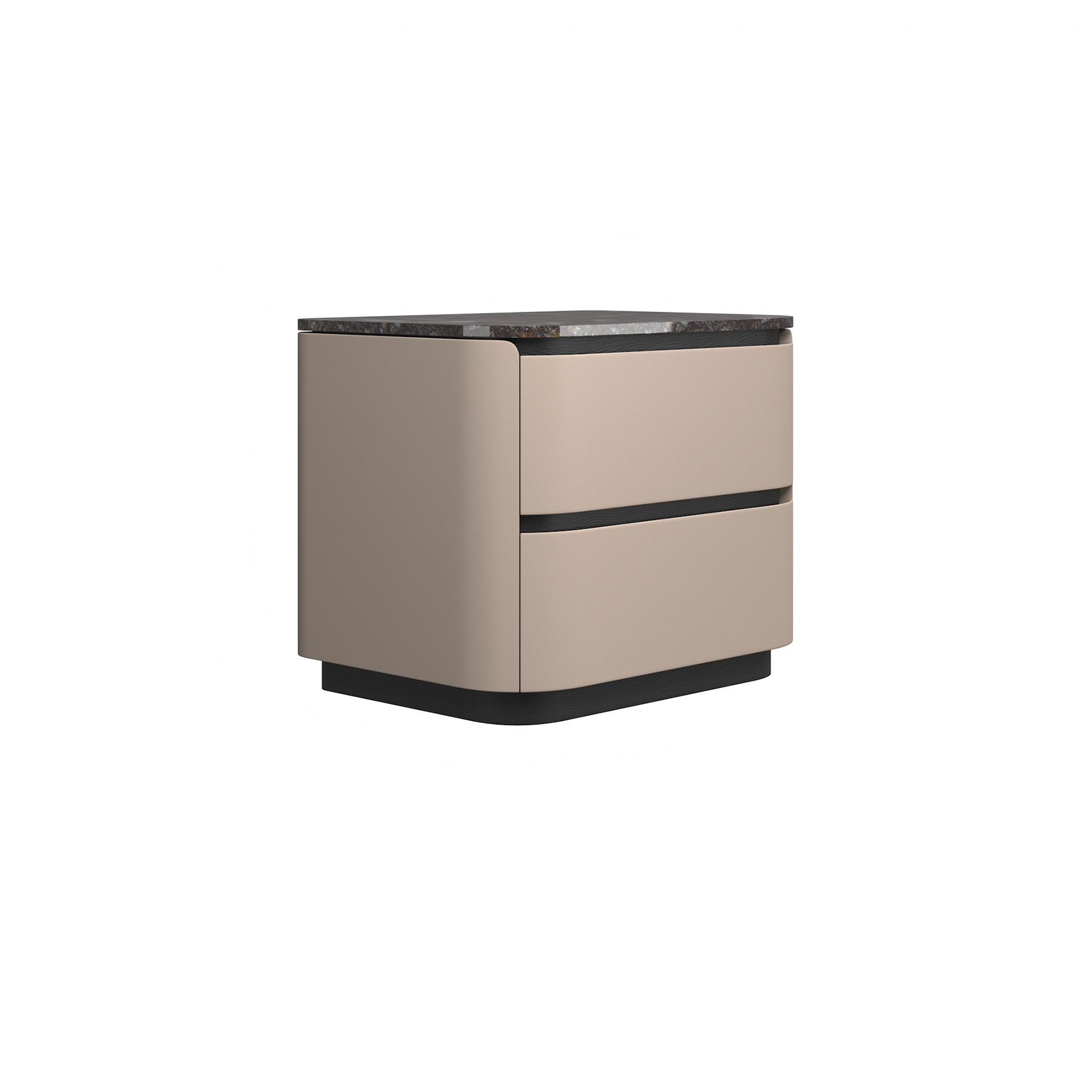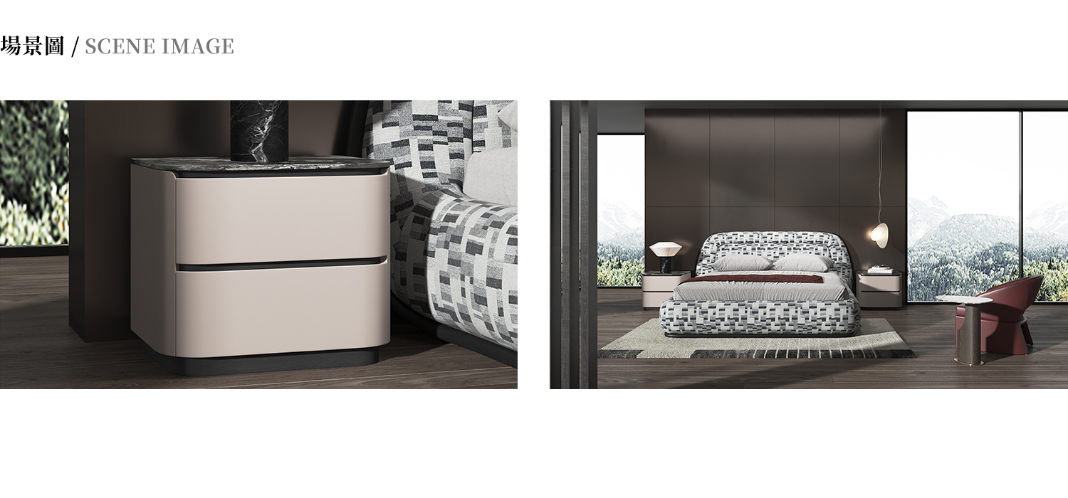 床頭櫃檯面為鉑金鑽大理石,抽面為皮革硬包,實木底框。