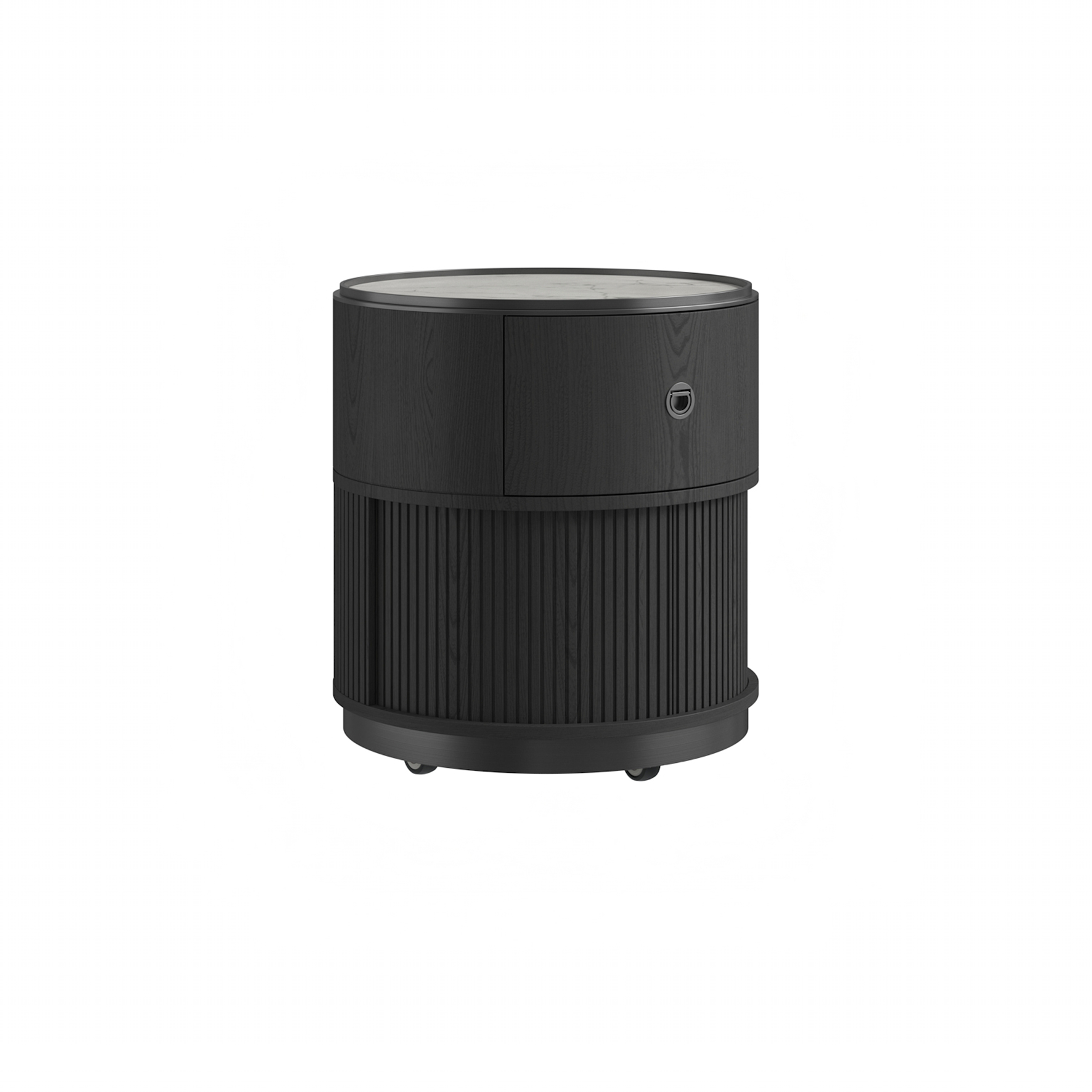The nightstand features a sintered stone top with a meta!top frame. The main body is crafted from white oak smal!mountain grain wood veneer, complemented by concealedhardware pulls. The metal base frame is equipped with uni-versal casters (two of which have brakes).