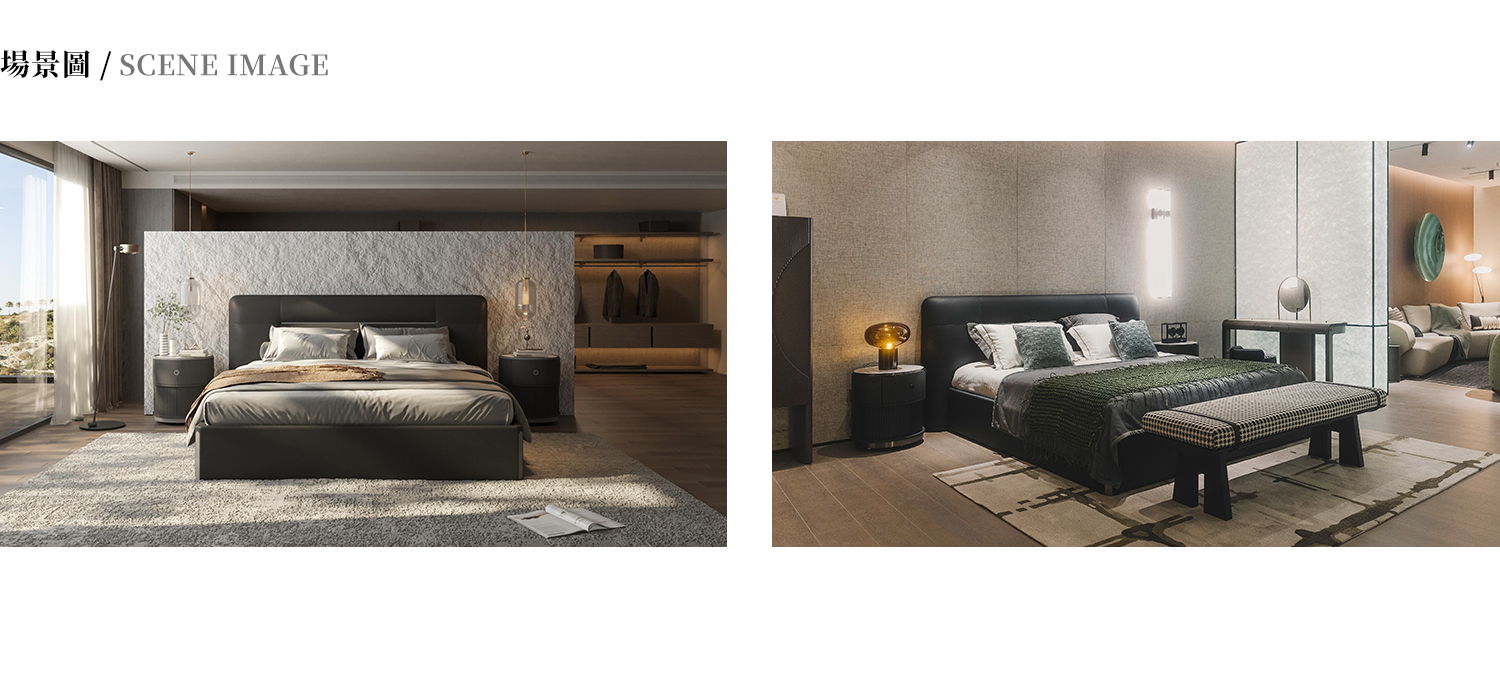 床頭櫃檯面為岩板(金屬頂框),櫃身為白橡小山紋木皮,五金隱形拉手,金屬底框(配有萬向輪兩個帶剎車)。