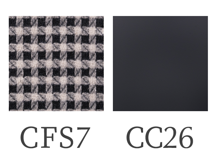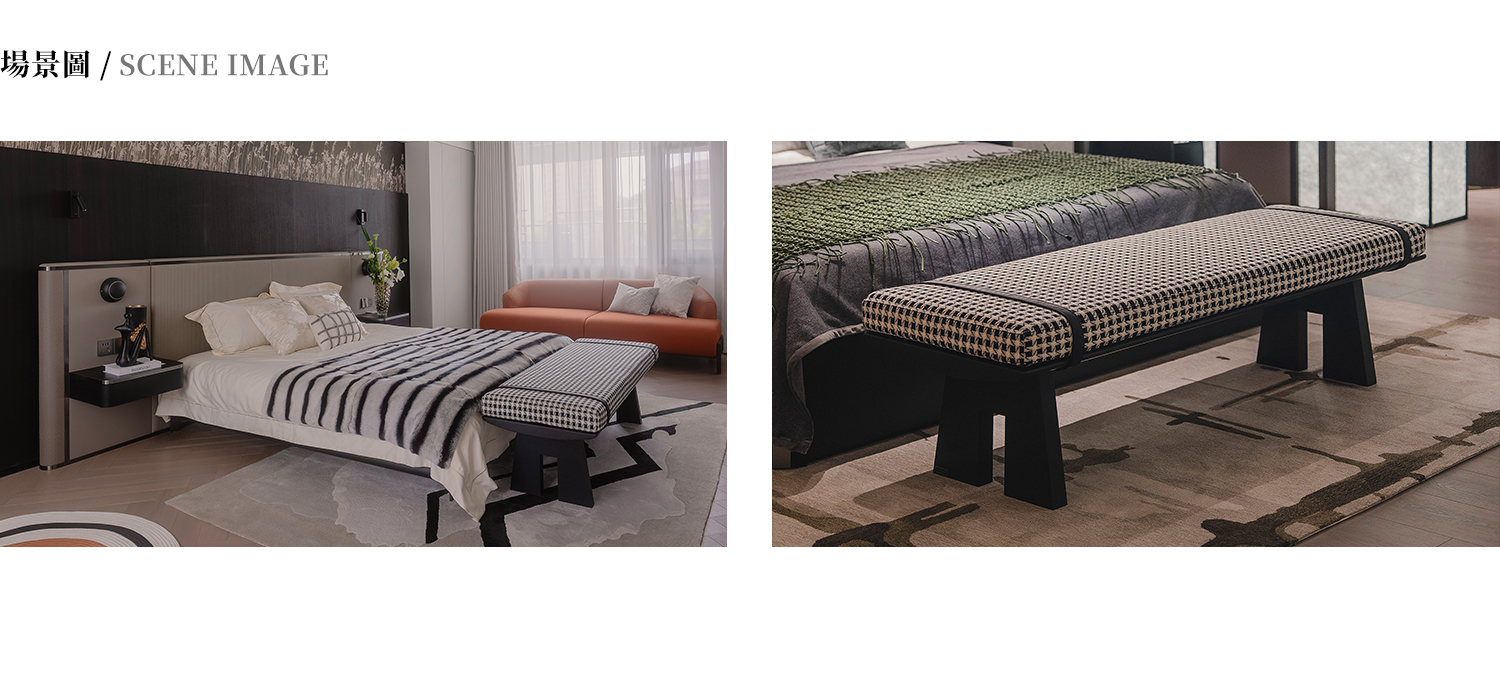 框架為白橡小山紋木皮 + 白蠟木,坐墊面料為布藝(兩端有皮革裝飾),海綿填充。