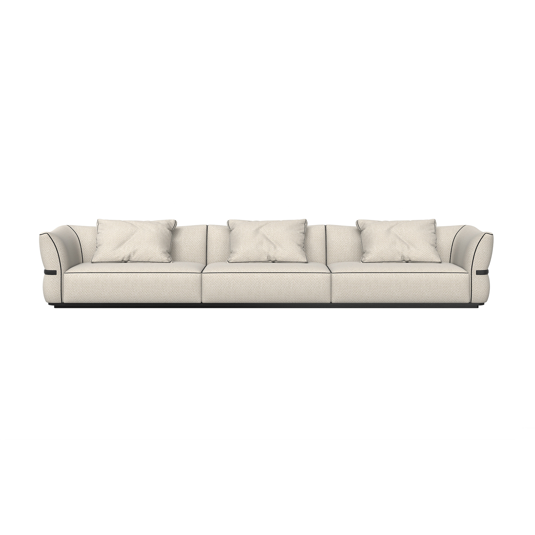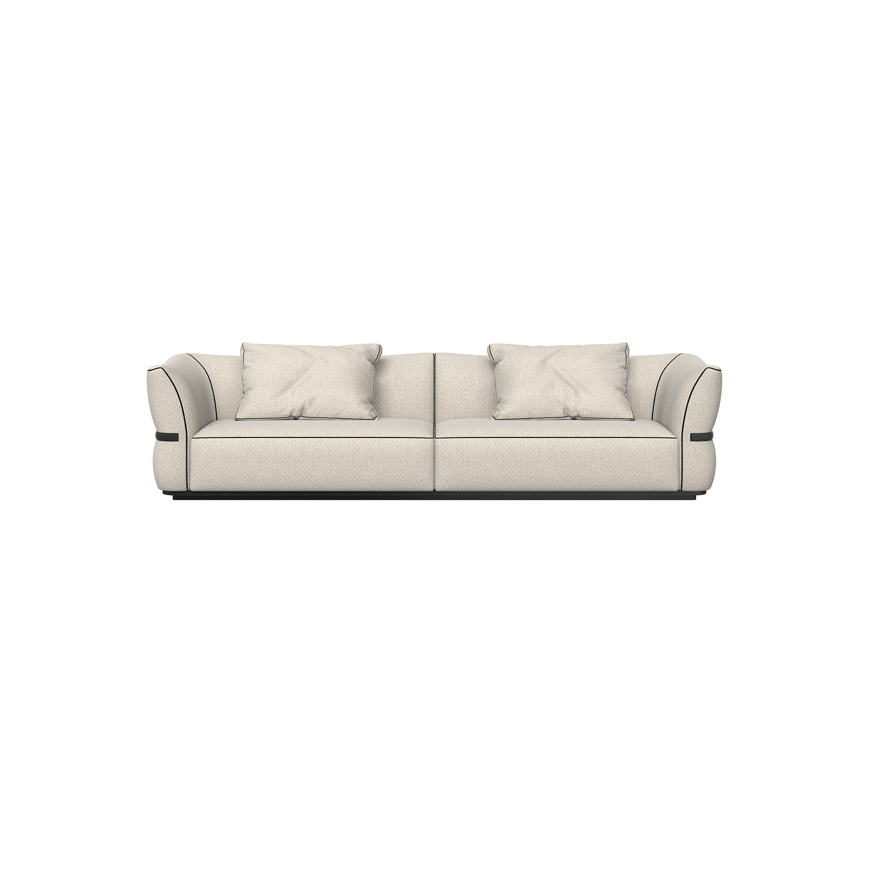 The sofa is fabric wrapped overall, with an imported pine frame, an ash solid wood open lacquered black oak base, and a saddle leather wrapped stainless steel waist section.