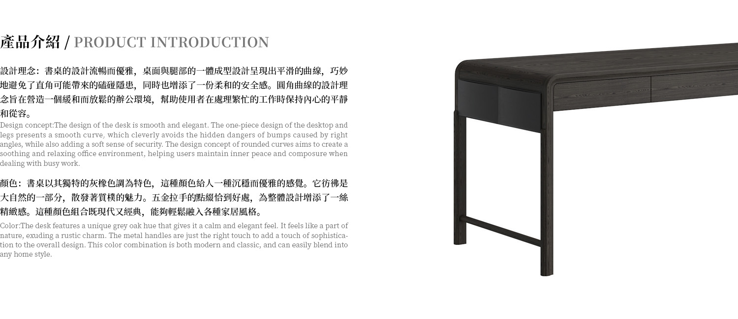 The overall frame of the desk is made of ash wood, thedrawers are built-in ltalian hidden damping tracks, and theside pockets are made of microfibre leather.