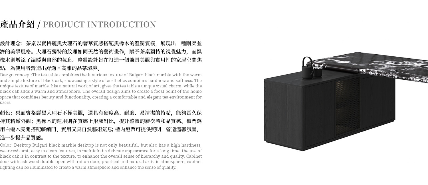 茶桌檯面寶格麗黑大理石 + 電磁爐,整體框架為白橡小山紋木飾面黑橡色。