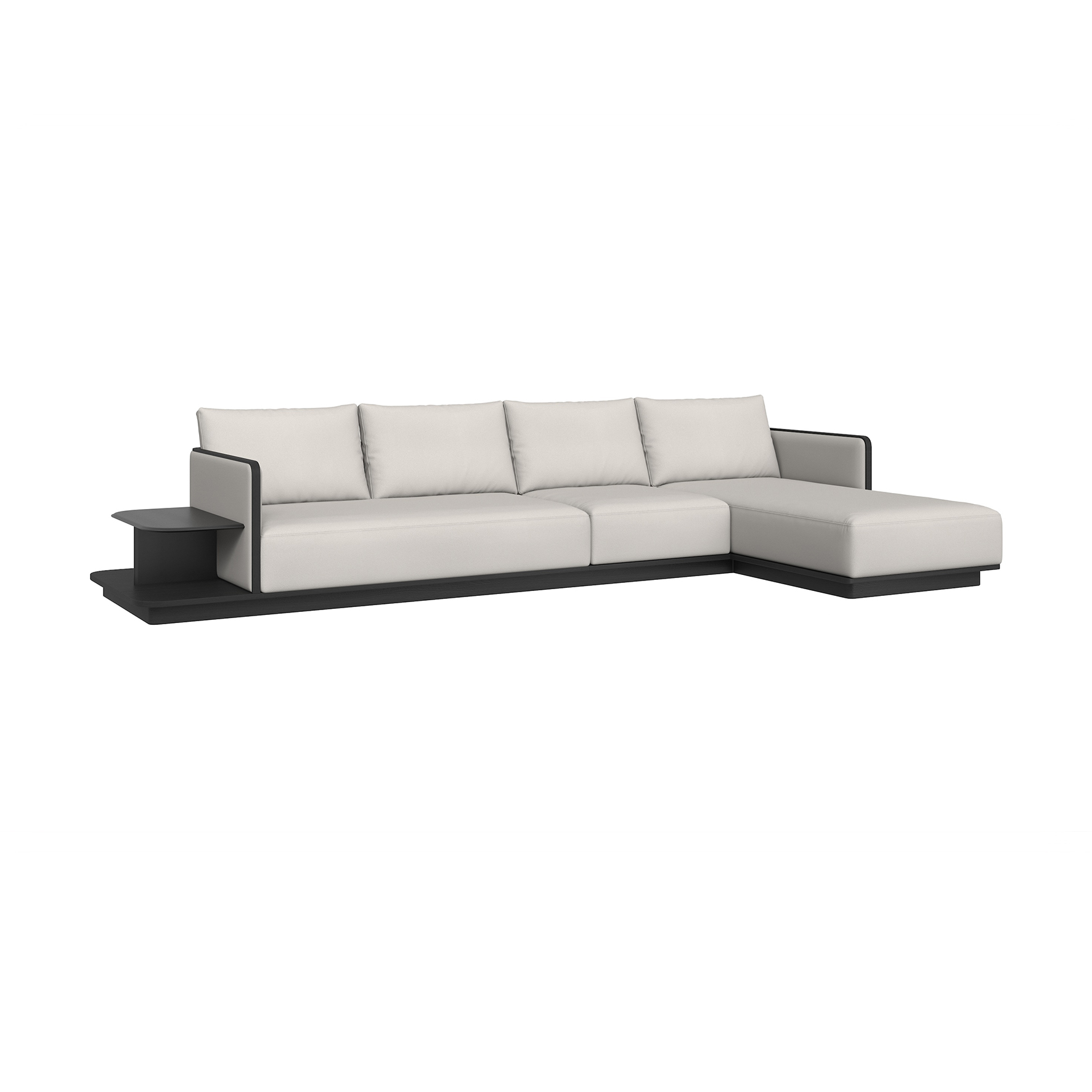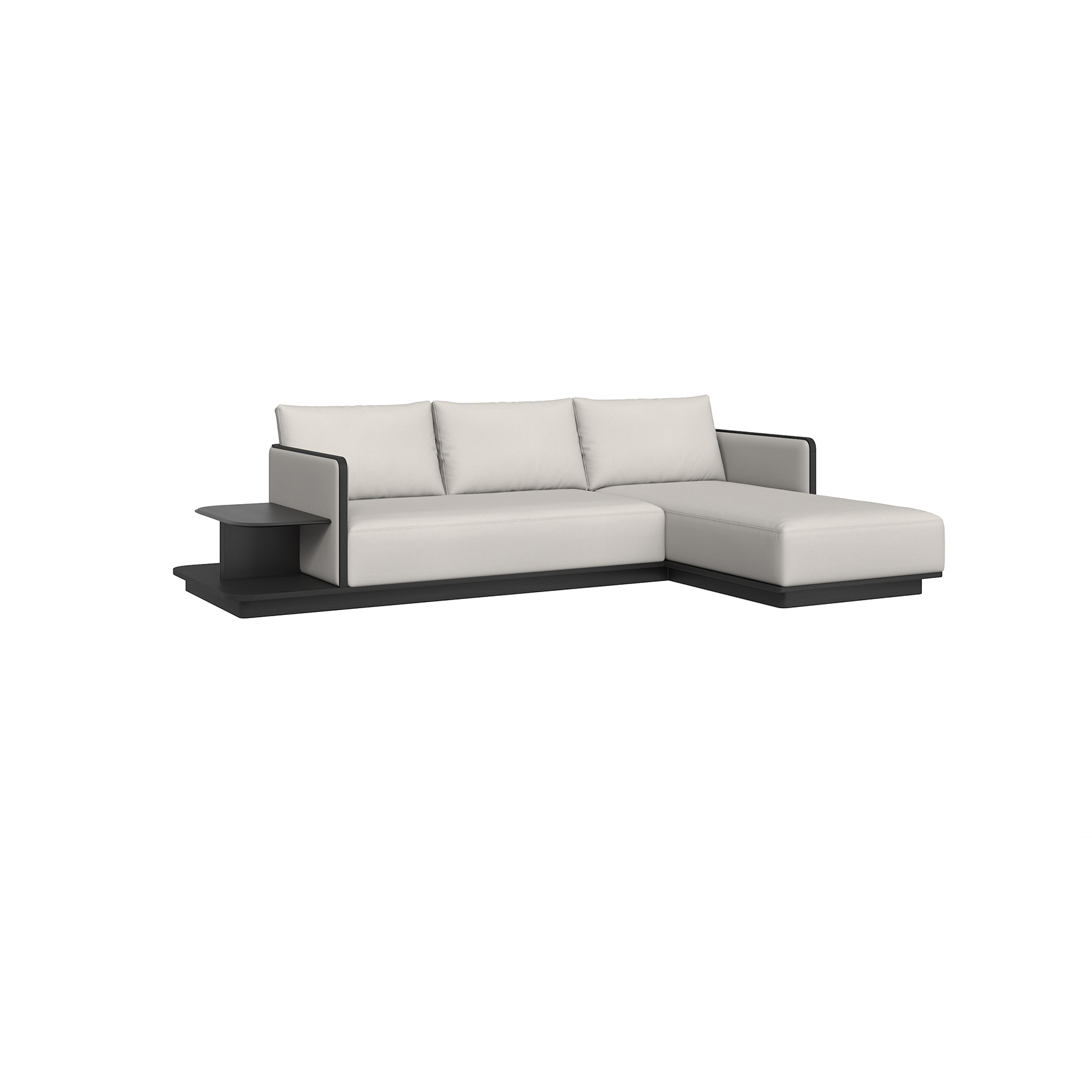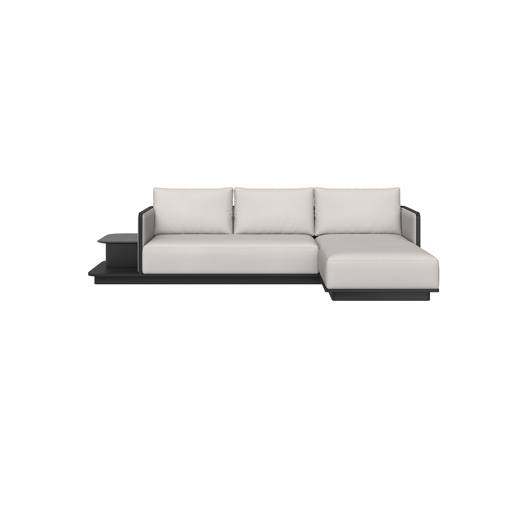 沙發整體為皮質包製,框架為進口松木,底座為白蠟木實木開放漆黑橡色,搭几檯面以馬鞍皮包製。