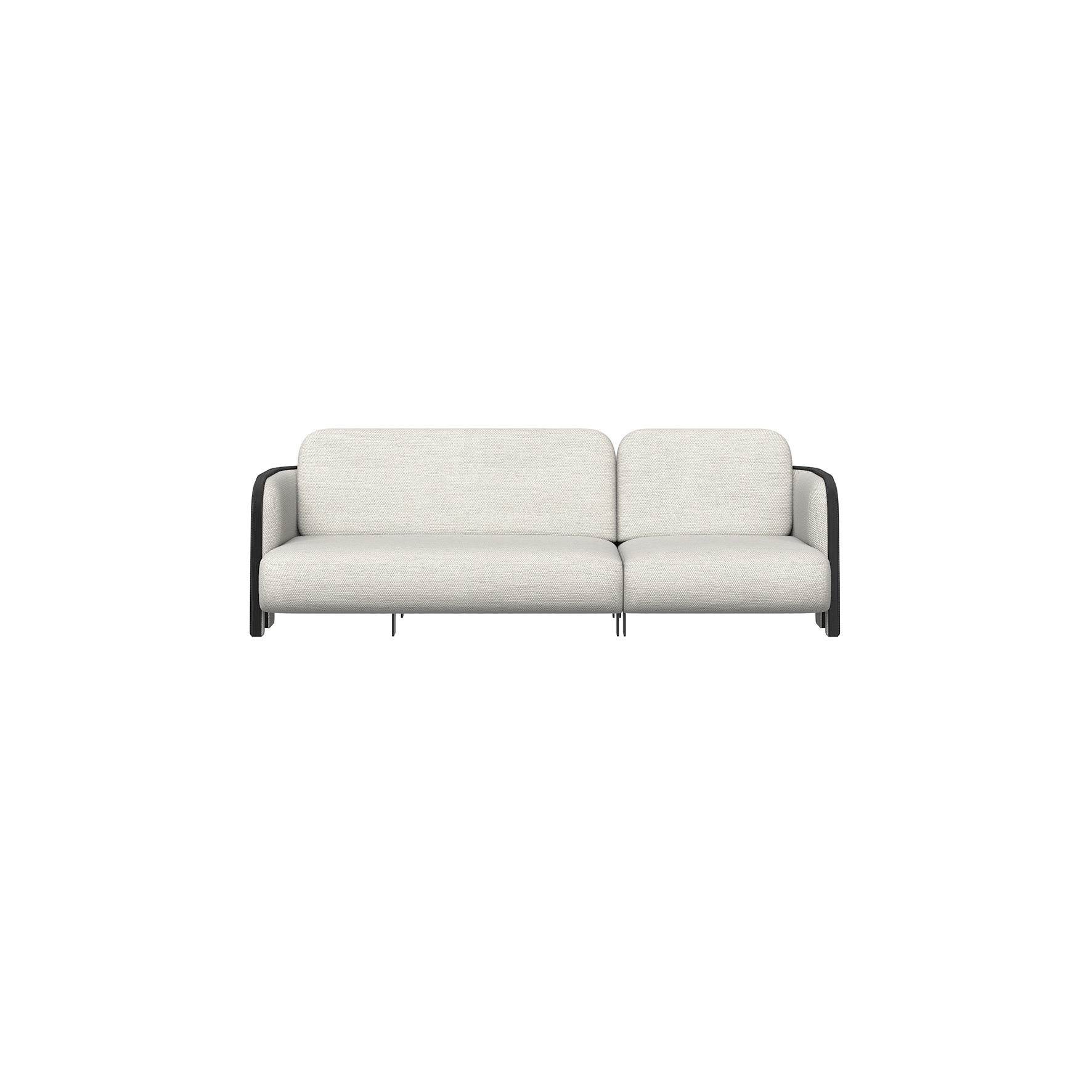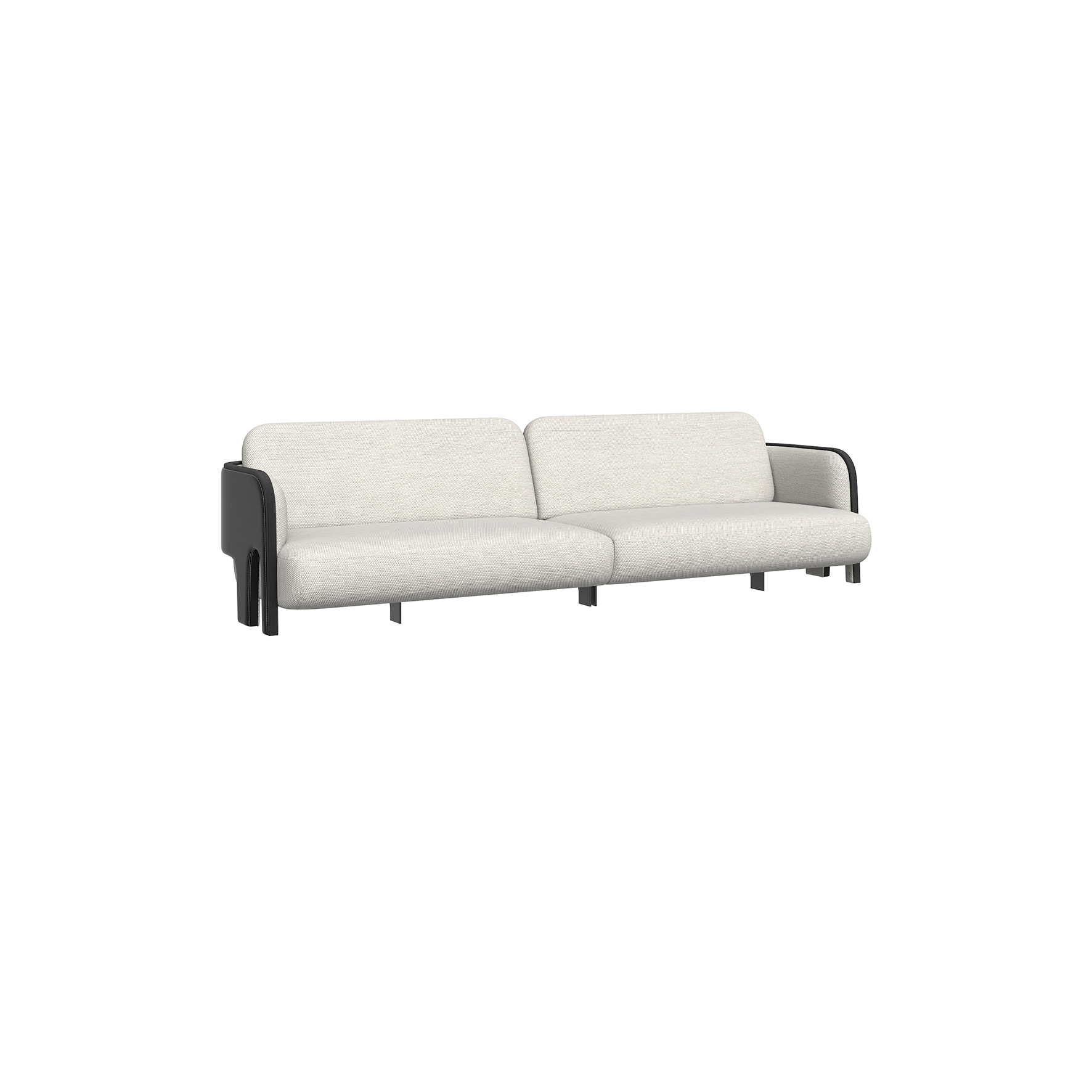沙發整體為面料包製,後背外圍採用馬鞍皮,框架為進口松木,底座為白蠟木實木開放漆黑橡色,配備金屬腳架。