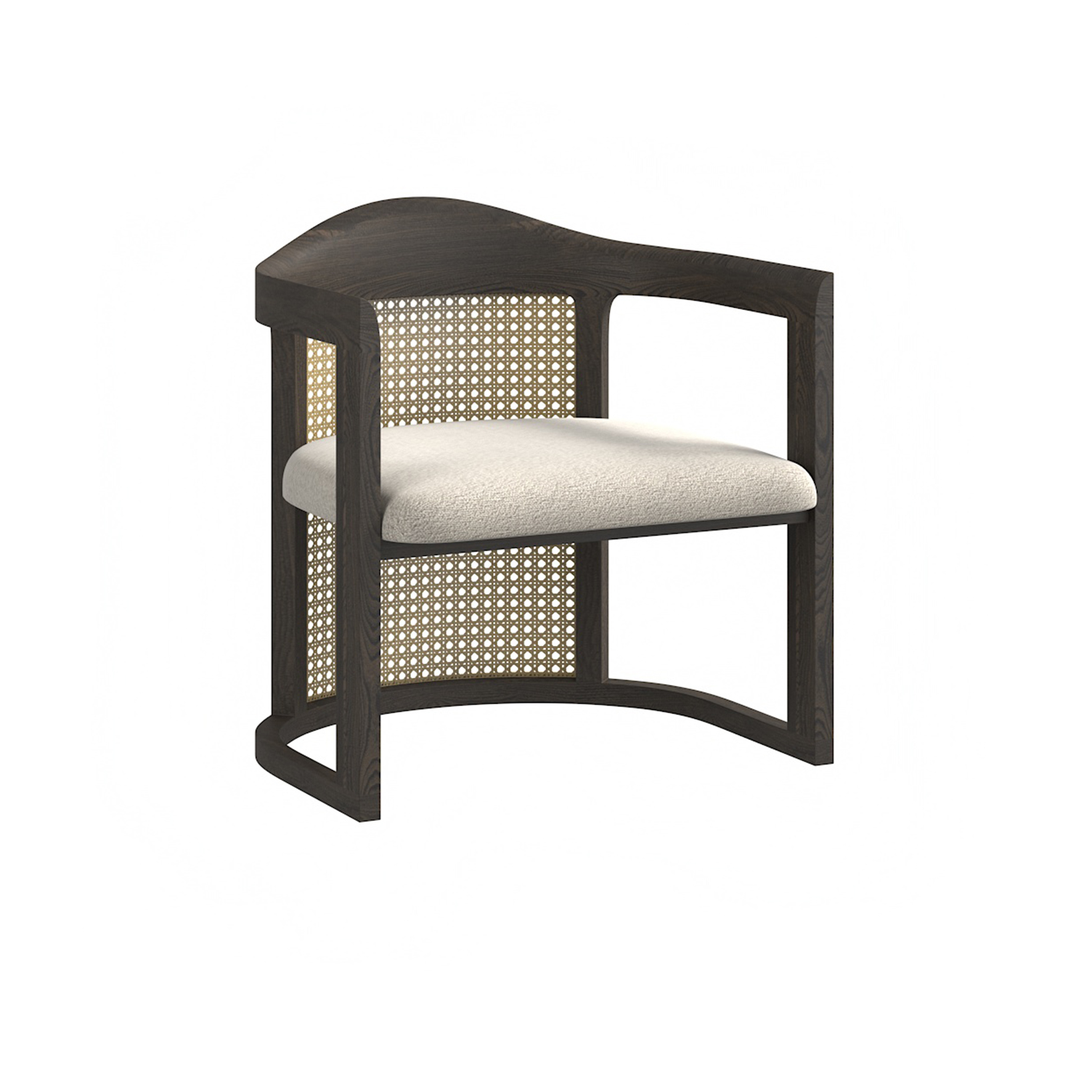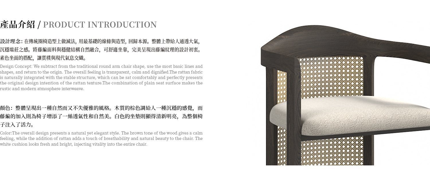 座墊整體為布料包制,框架為白蠟木實木開放漆,靠背採用藤編材質。