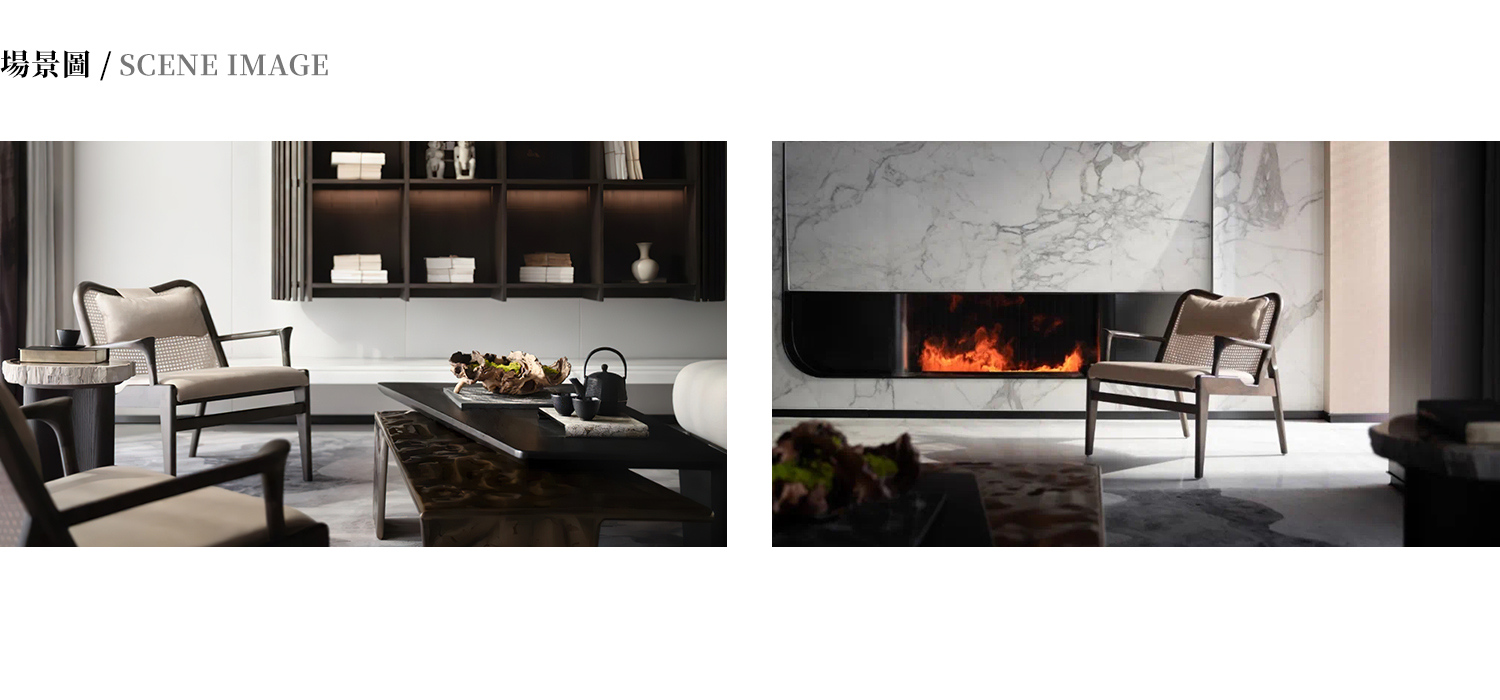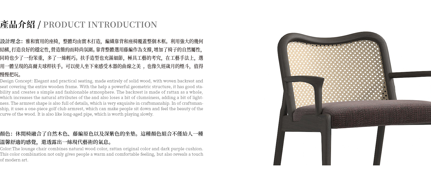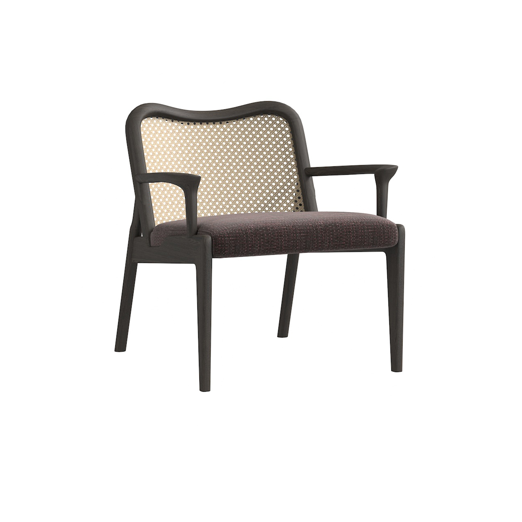 座墊整體為布料包制,框架為白蠟木實木開放漆,靠背採用藤編材質。