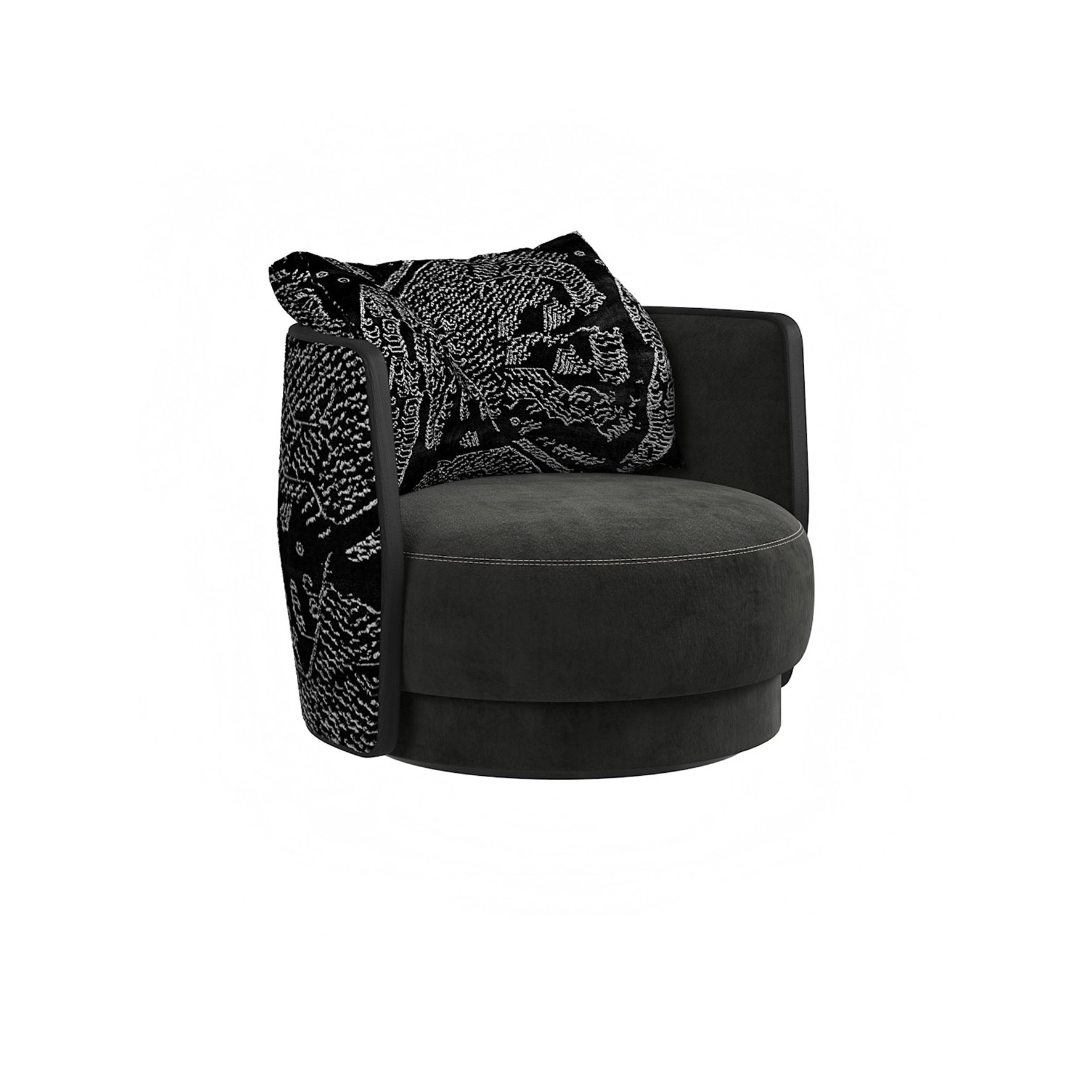 The whole is wrapped in fabric, the back of the chair is made of ash wood with open lacquer, and the bottom is built-in metal swivel.