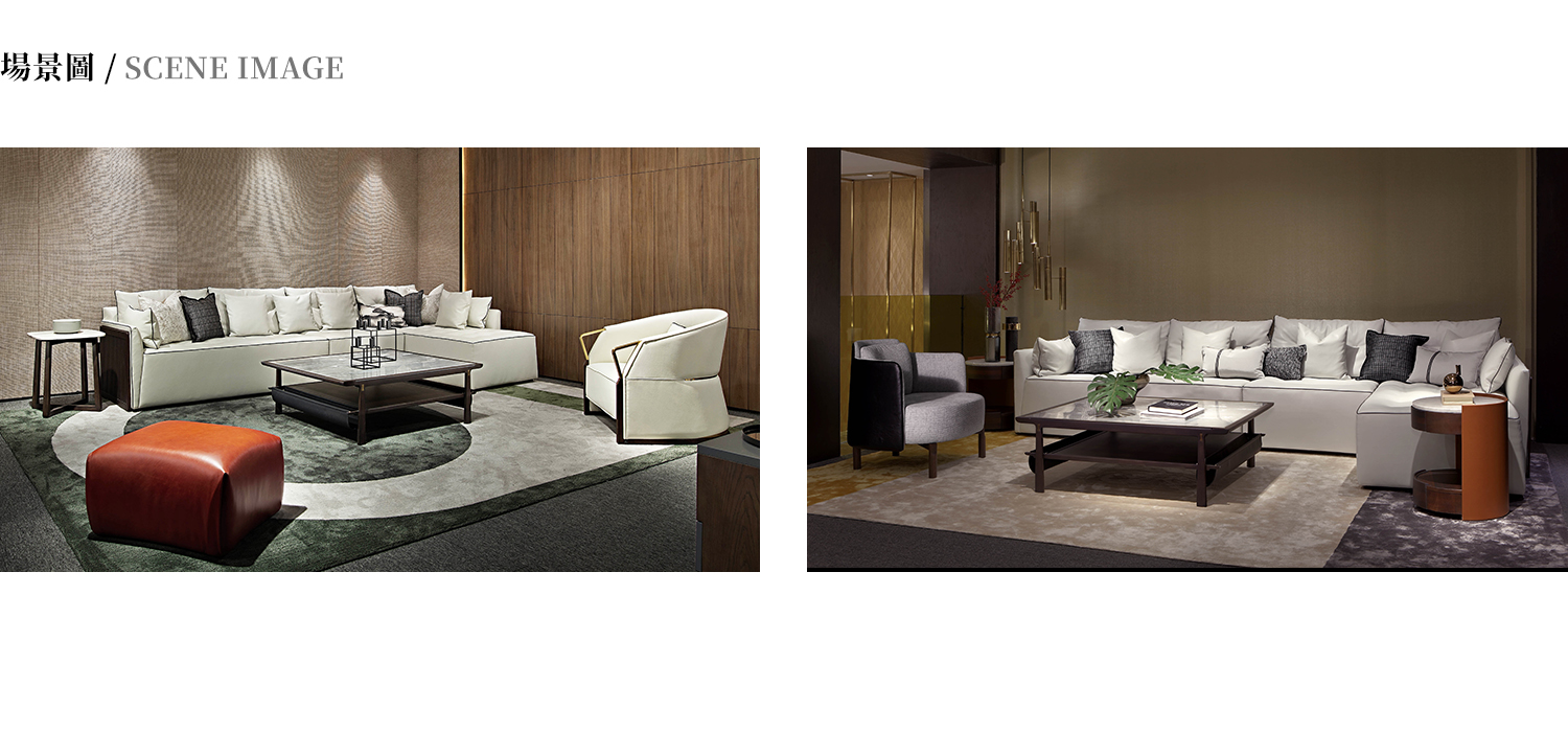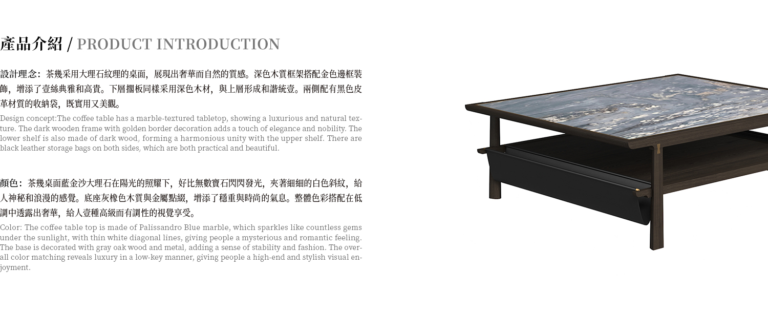 茶几桌面為藍金沙大理石,框架為白蠟木實木開放漆,側面設計皮革收納,蝴蝶金屬榫卯結構。