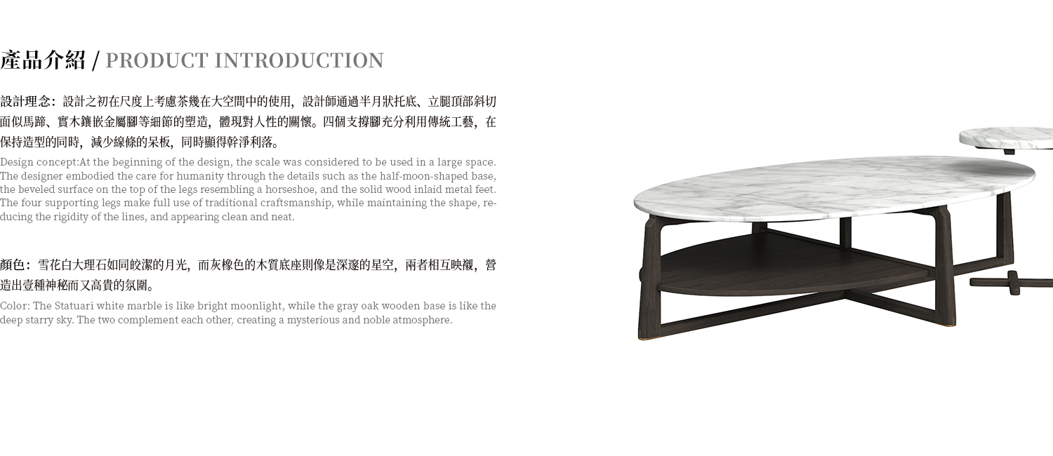 茶几桌面為雪花白大理石,框架為白蠟木實木開放漆,金屬腳墊。