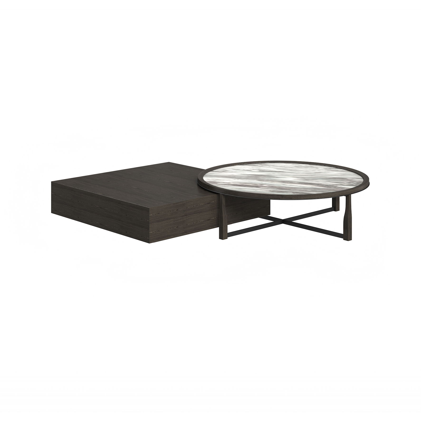 Combination coffee table with round table top in Gucci grey marble, square table top in open lacquered grey oak and drawers with built-in Italian hidden rebound tracks.
