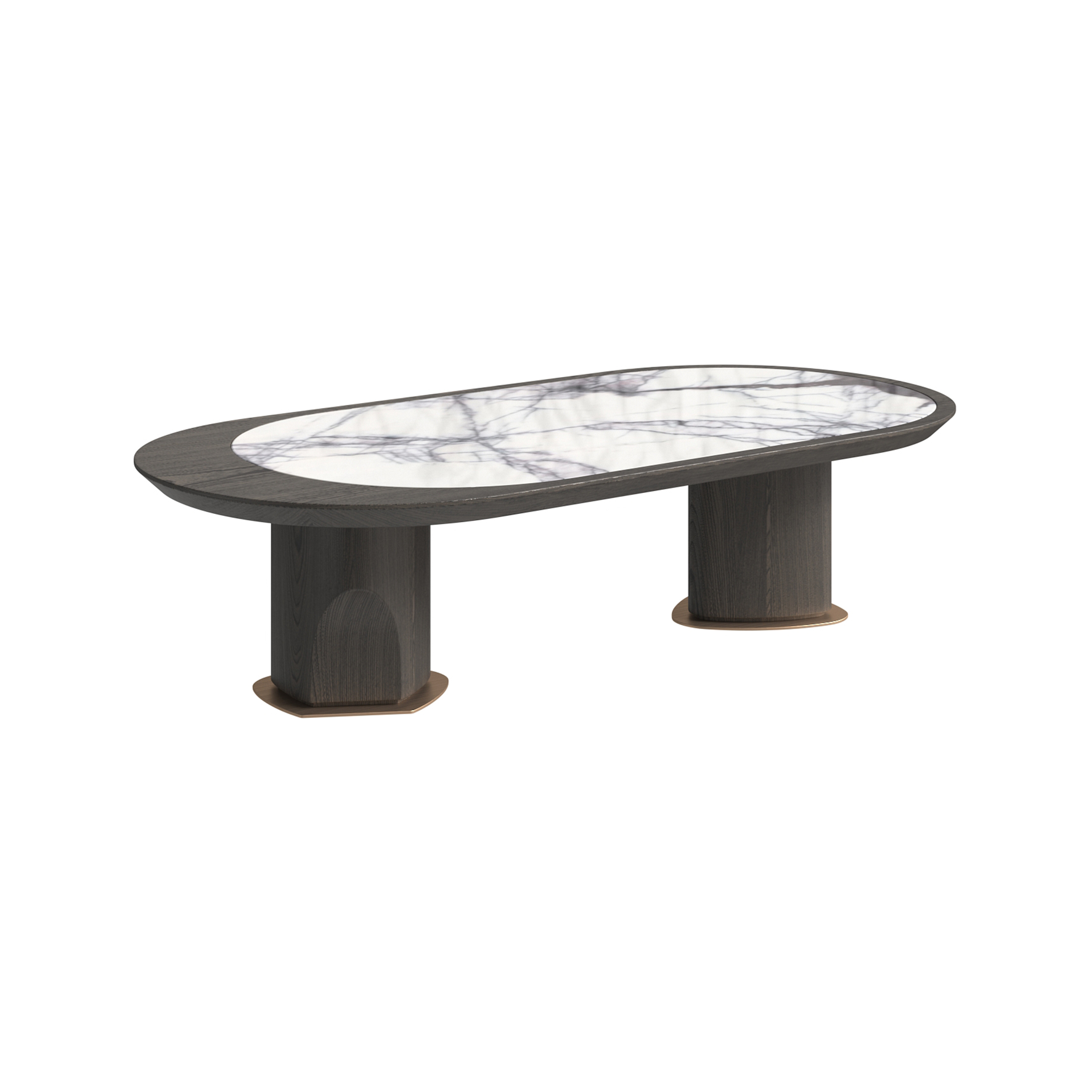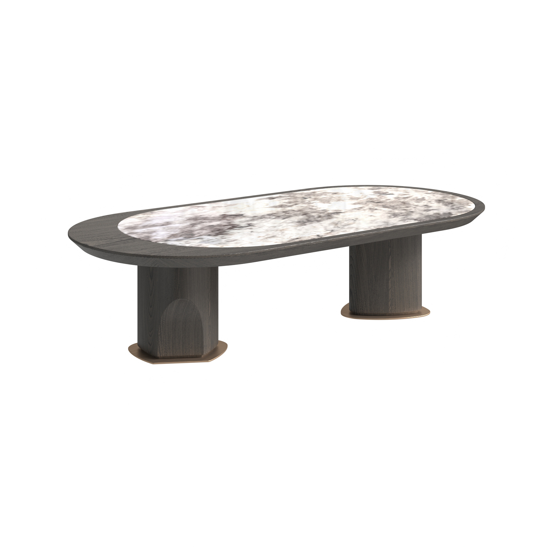 Coffee table table top embedded with bird of paradise marble, frame in ash solid wood open lacquered grey oak, 304 brushed stainless steel feet pads.