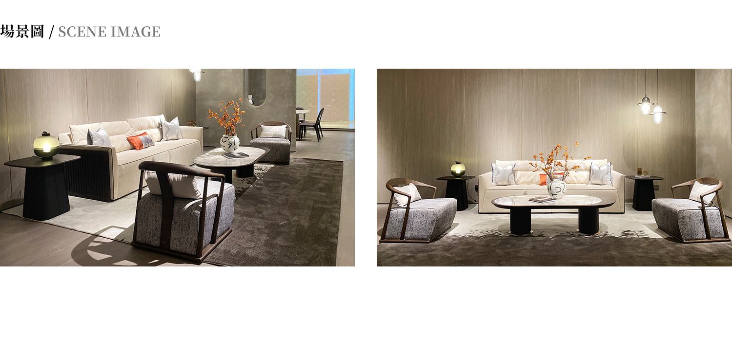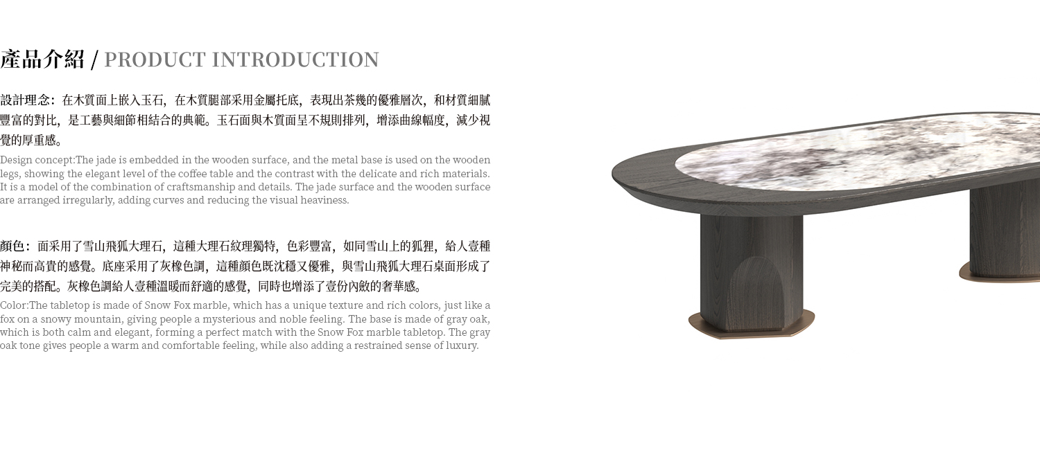 茶几檯面嵌入天堂鳥大理石,框架為白蠟木實木開放漆灰橡色,304 拉絲不鏽鋼腳墊。