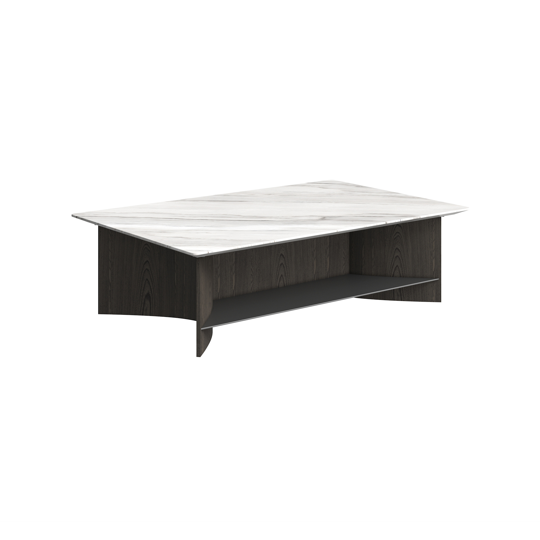 Coffee table table top in white gold sand marble, frame in ash solid wood open lacquered grey oak, side stainless steel laminate storage organisers.