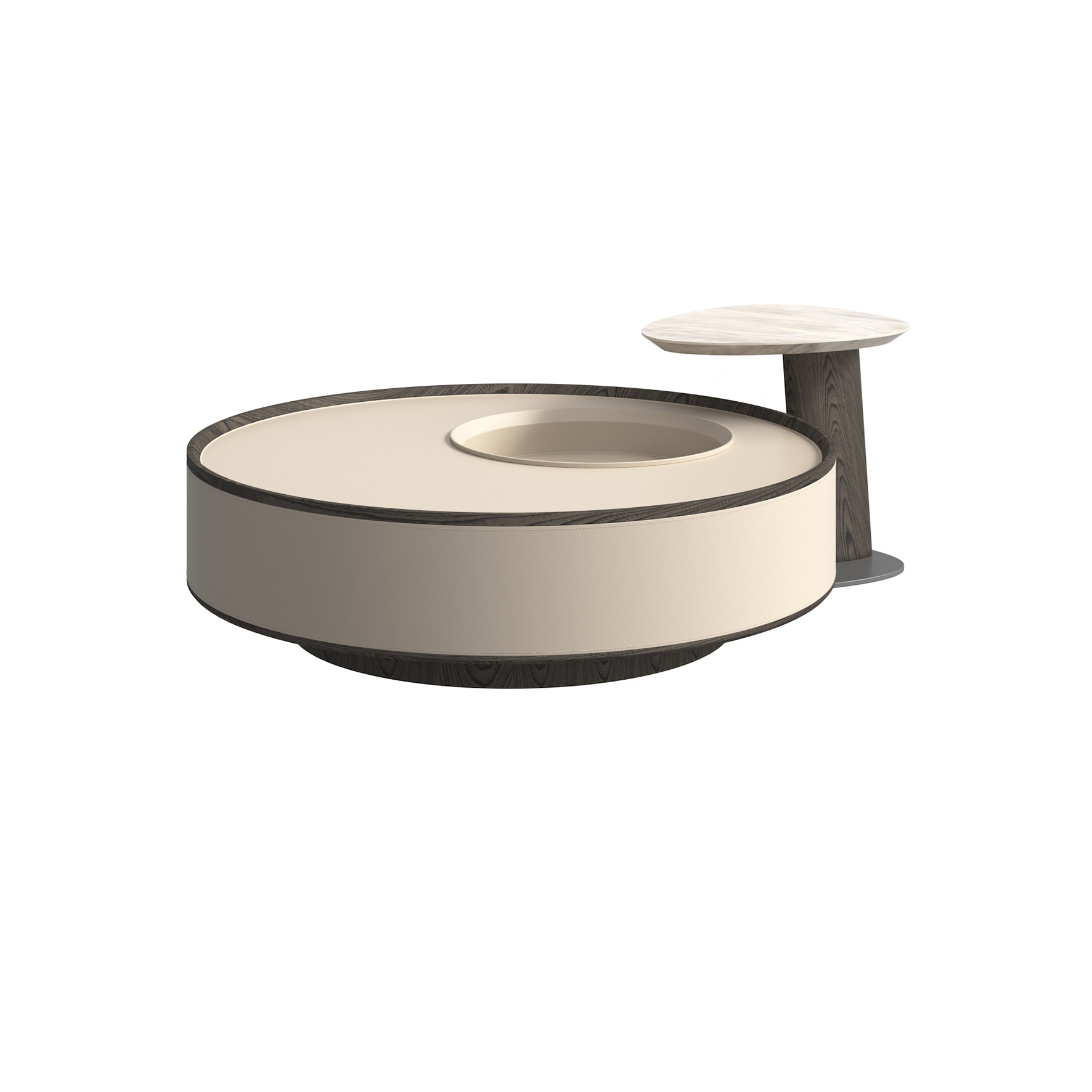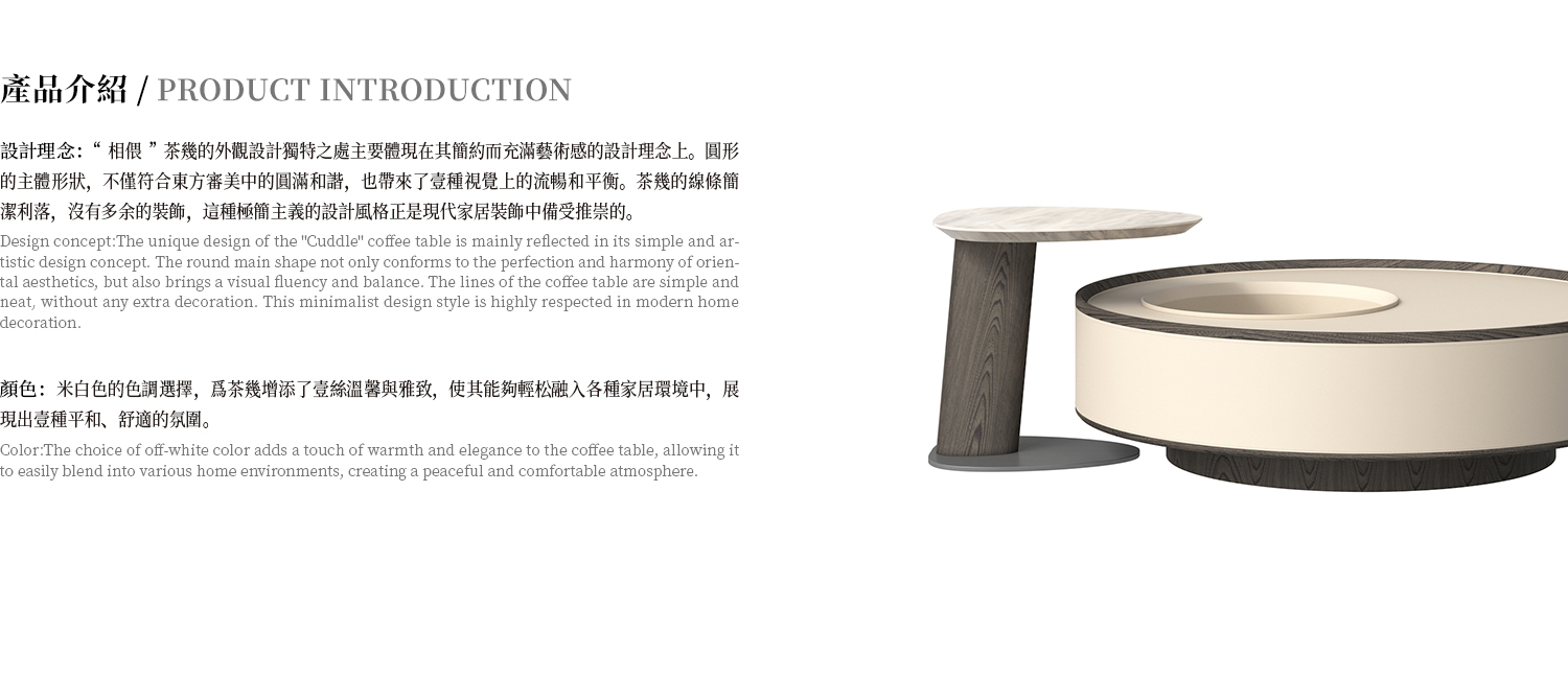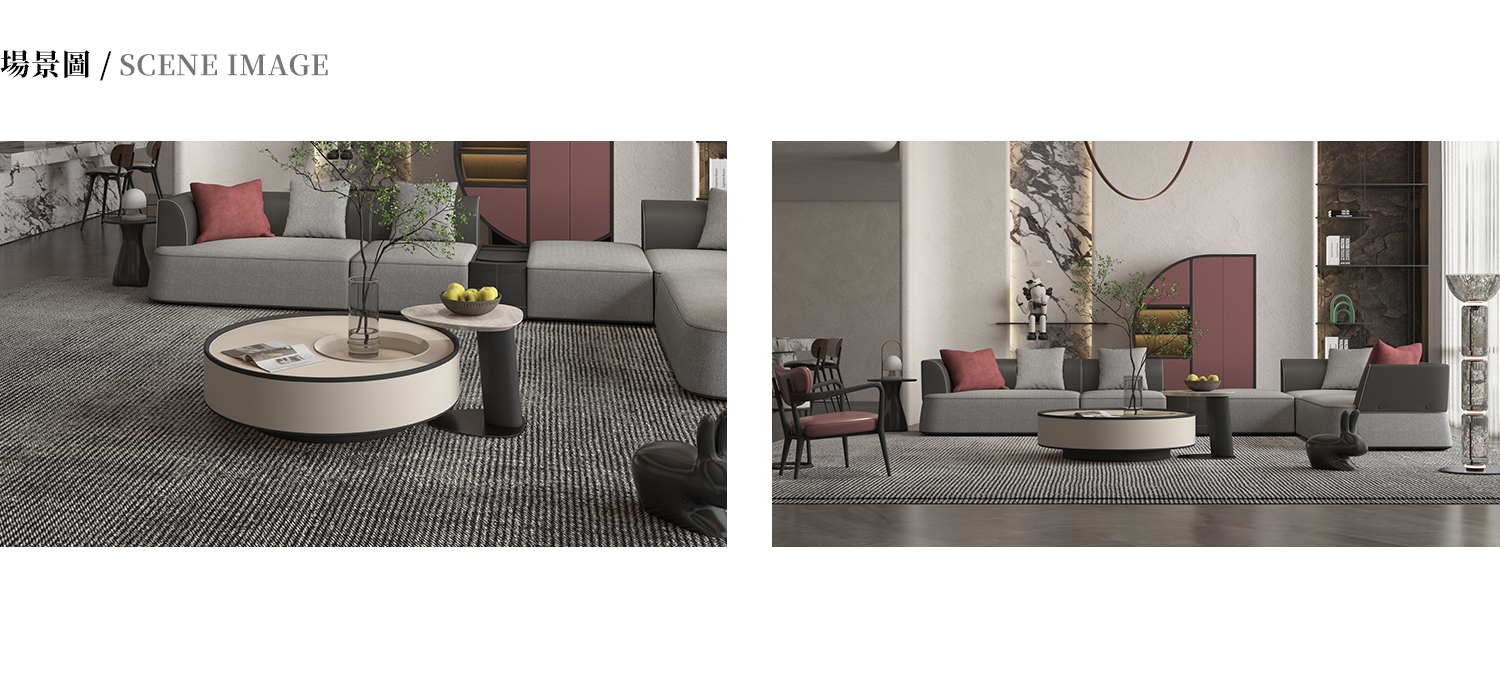 小茶几檯面為爵士白大理石,腳墊使用 304 拉絲不鏽鋼,框架為白蠟木實木開放漆灰橡色,大茶几周圍採用馬鞍皮包制。