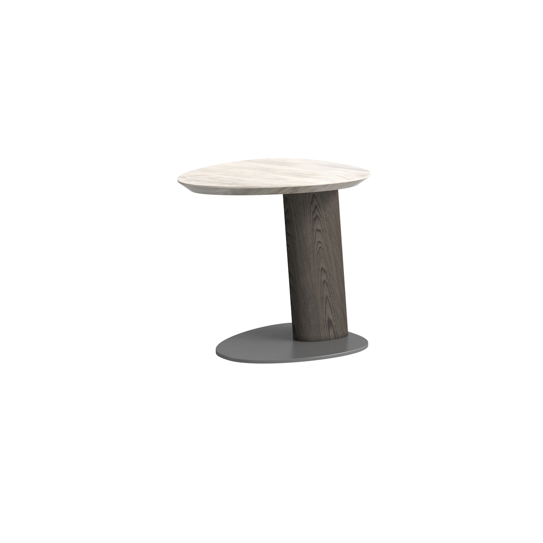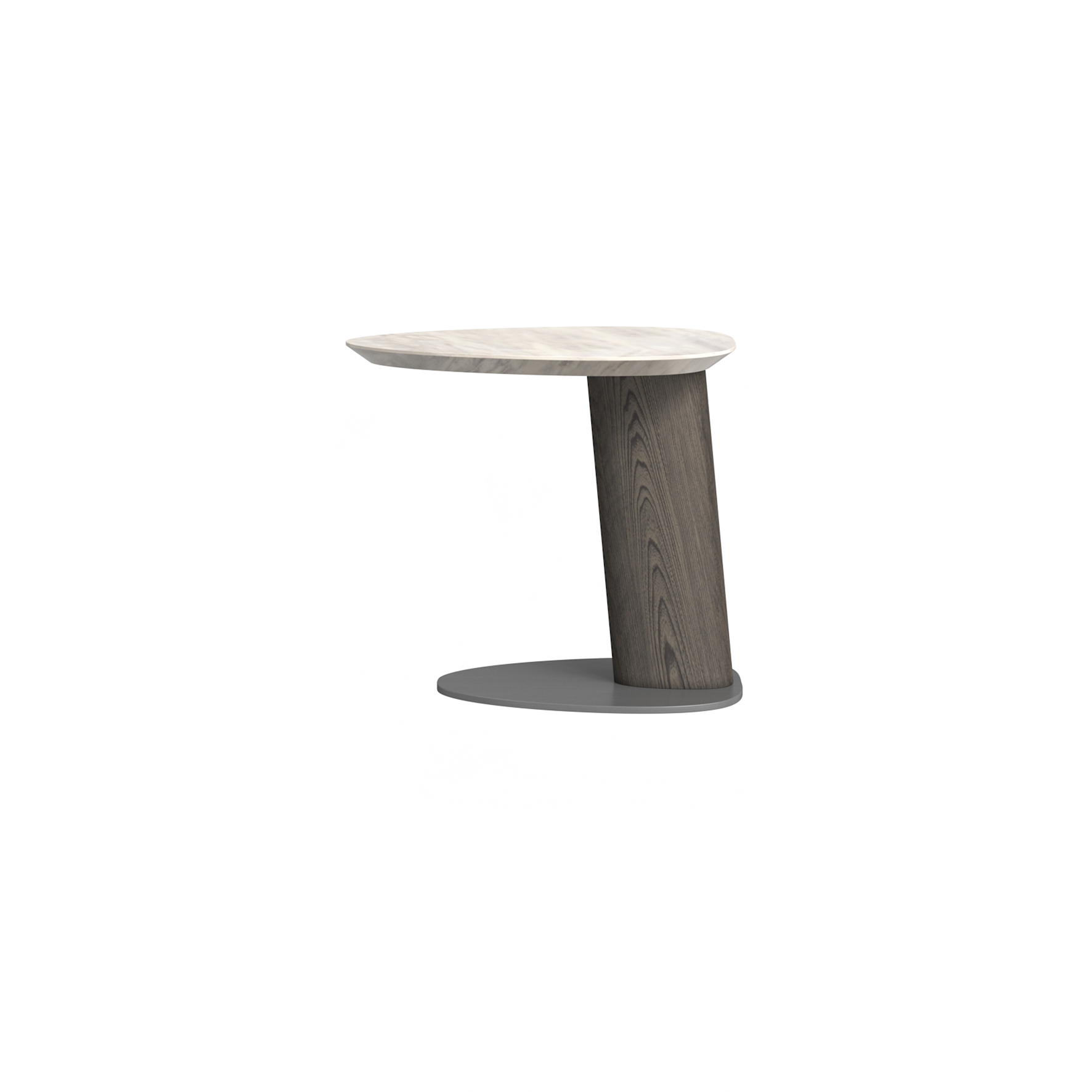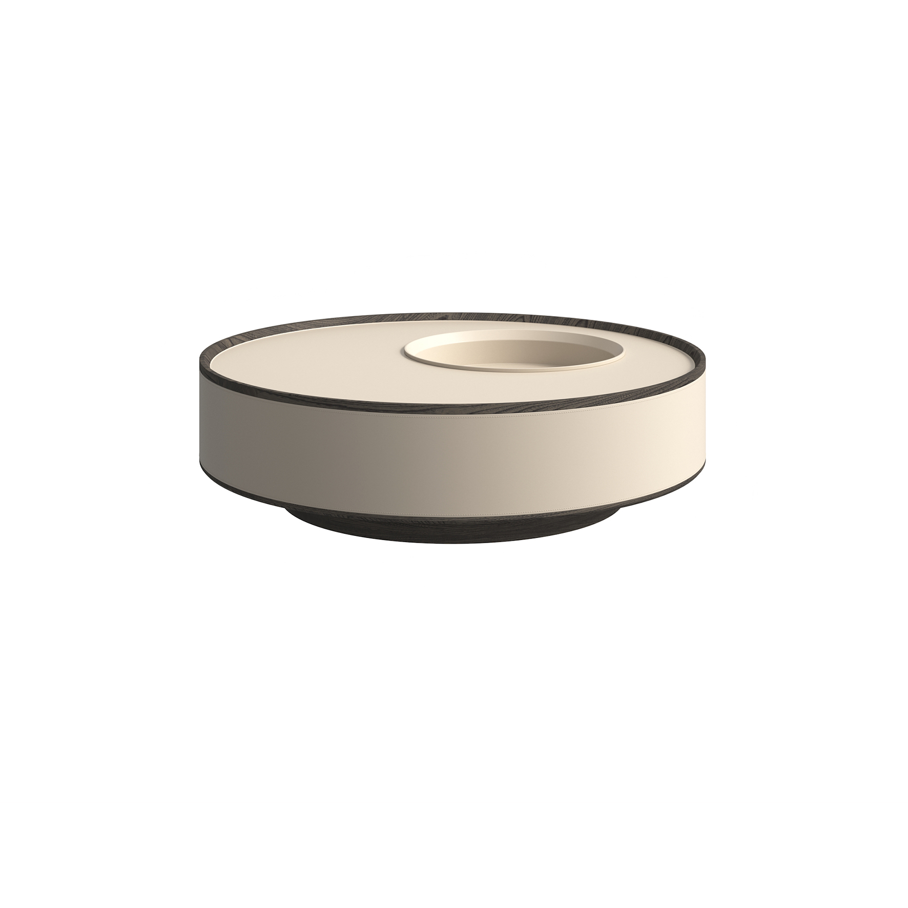小茶几檯面為爵士白大理石,腳墊使用 304 拉絲不鏽鋼,框架為白蠟木實木開放漆灰橡色,大茶几周圍採用馬鞍皮包制。