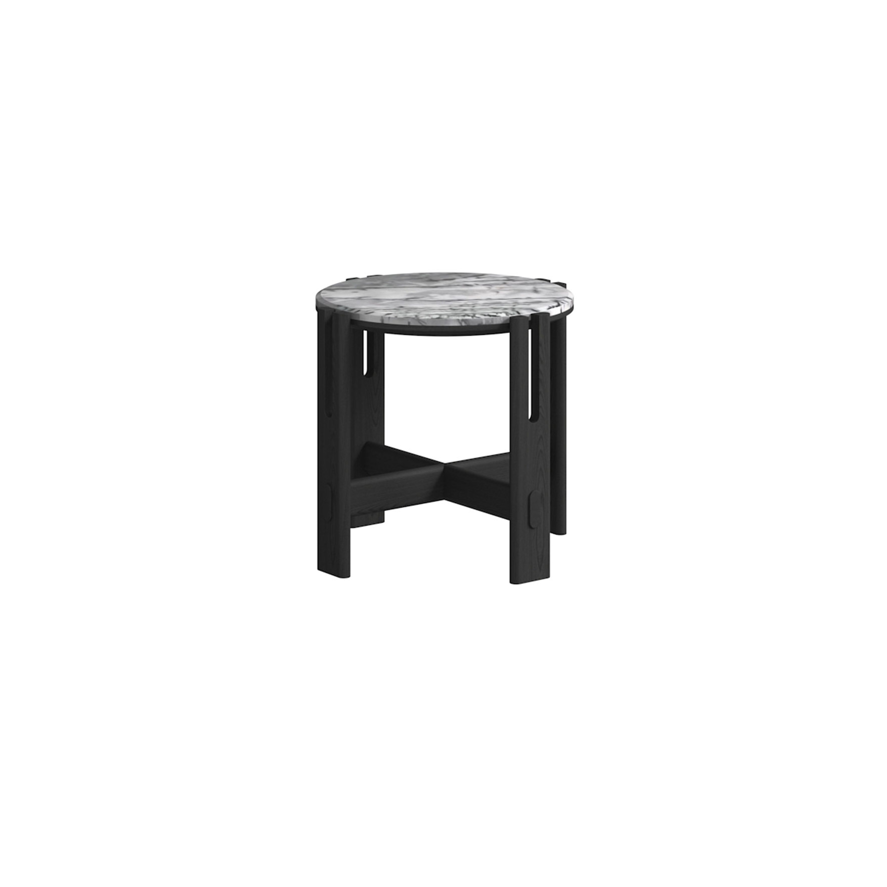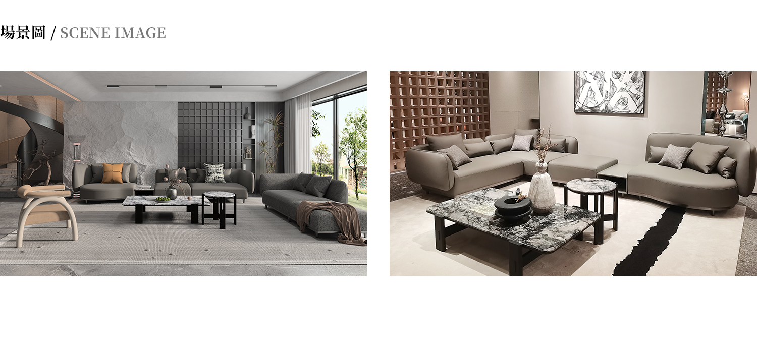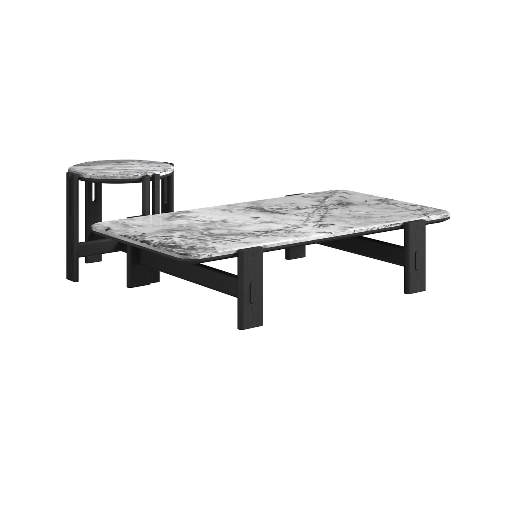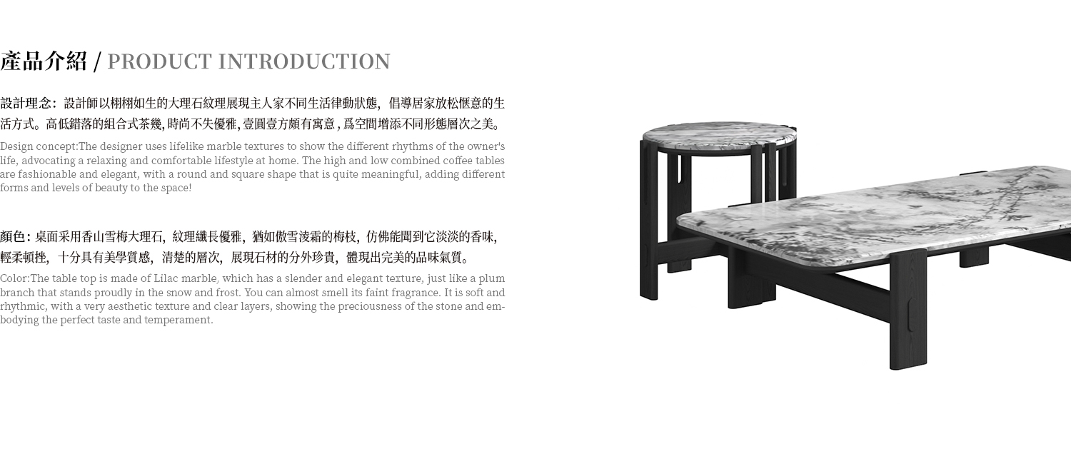 組合茶几檯面為香山雪梅大理石,框架整體為白蠟木實木開放漆黑橡色。