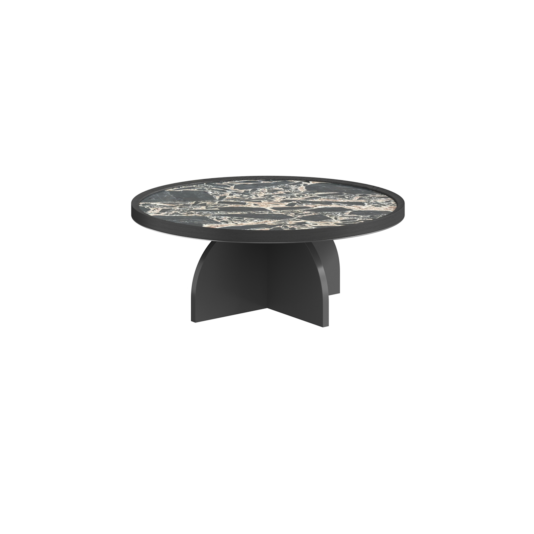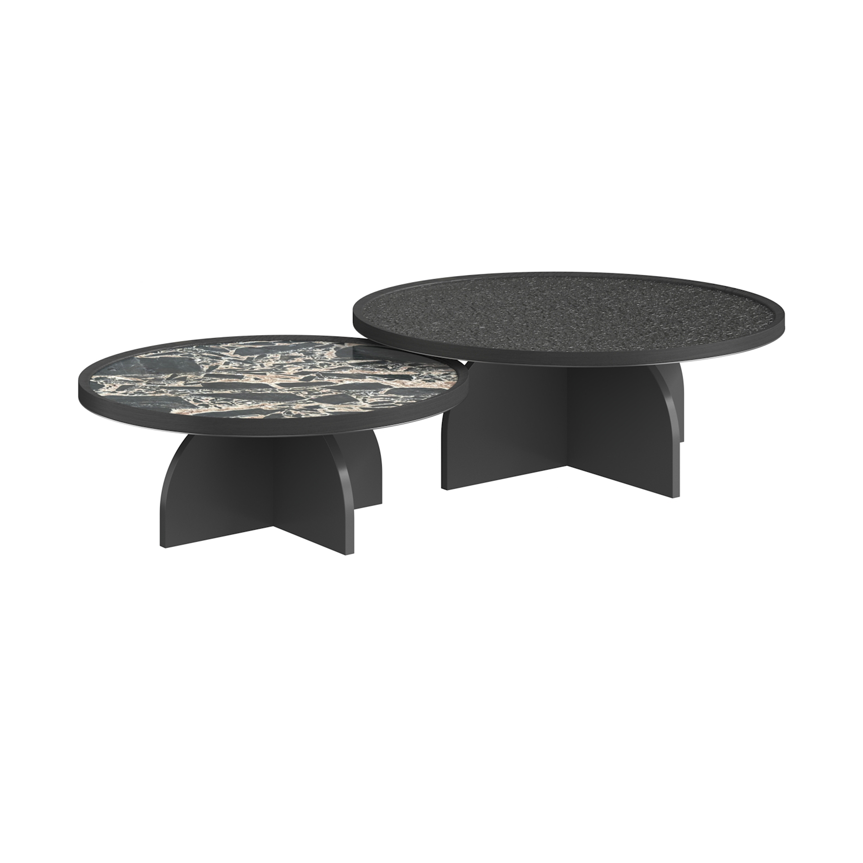 The large coffee table table top is aqua glass, the small coffee table top is Bulgari Gold marble, the overall frame is solid ash wood lacquered in black oak open lacquer, and the feet are made of 304 brushed stainless steel.
