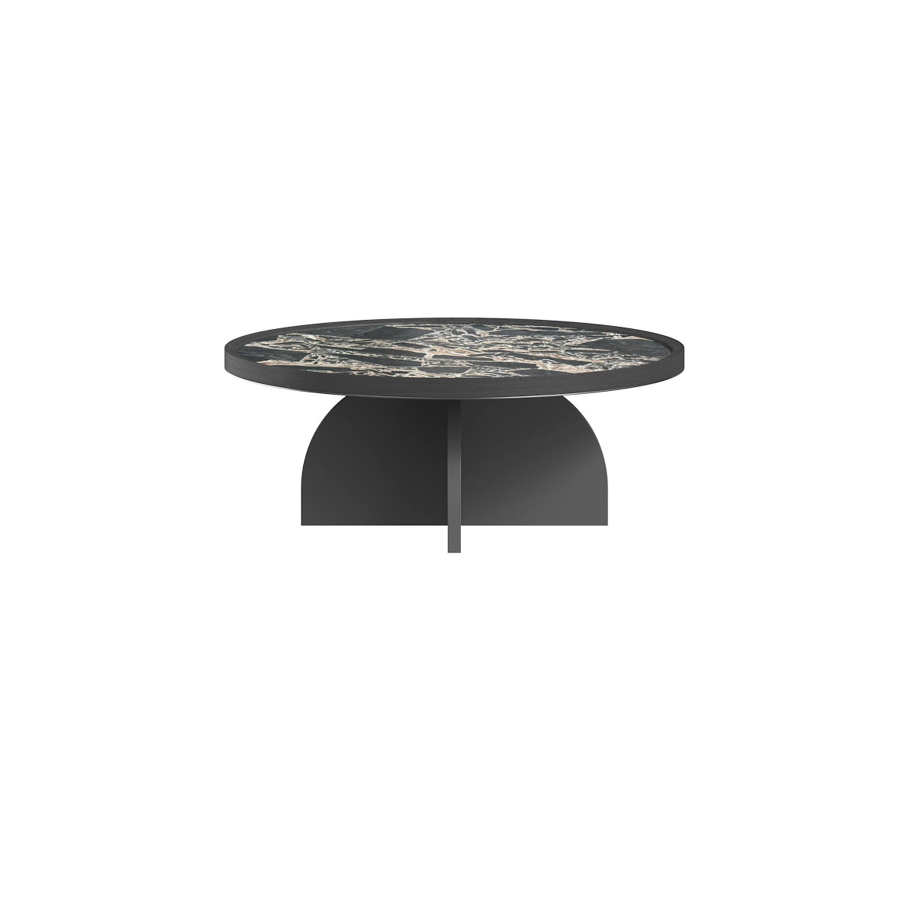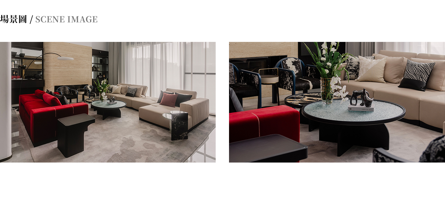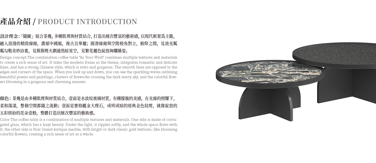 大茶几檯面為水紋玻璃,小茶几檯面為寶格麗金大理石,整體框架為白蠟木實色漆,黑橡色開放漆,腳墊採用 304 拉絲不鏽鋼。