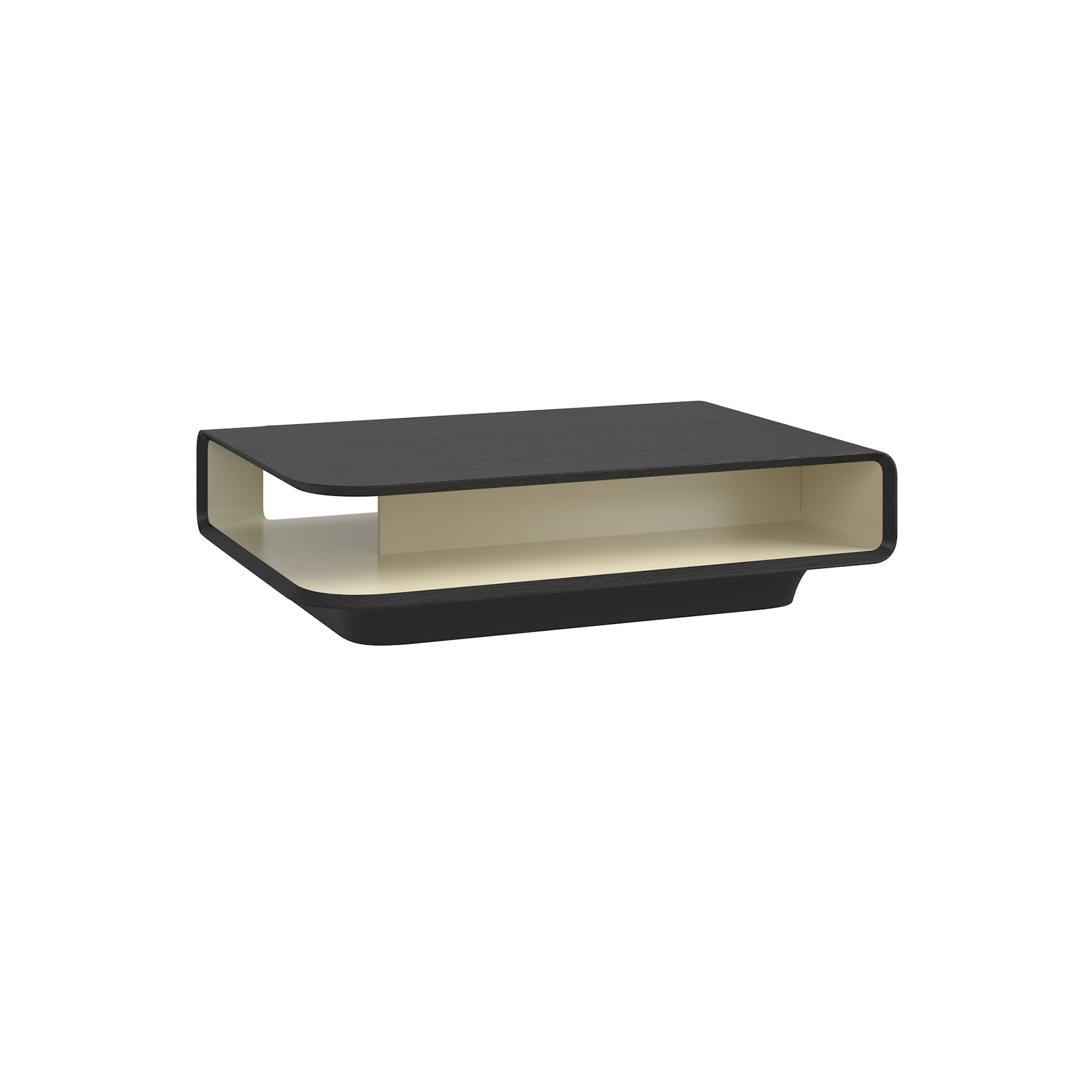 The coffee table is EO grade solid wood multi-ply black oak open lacquer overall and the storage shelves are wrapped in microfibre leather.
