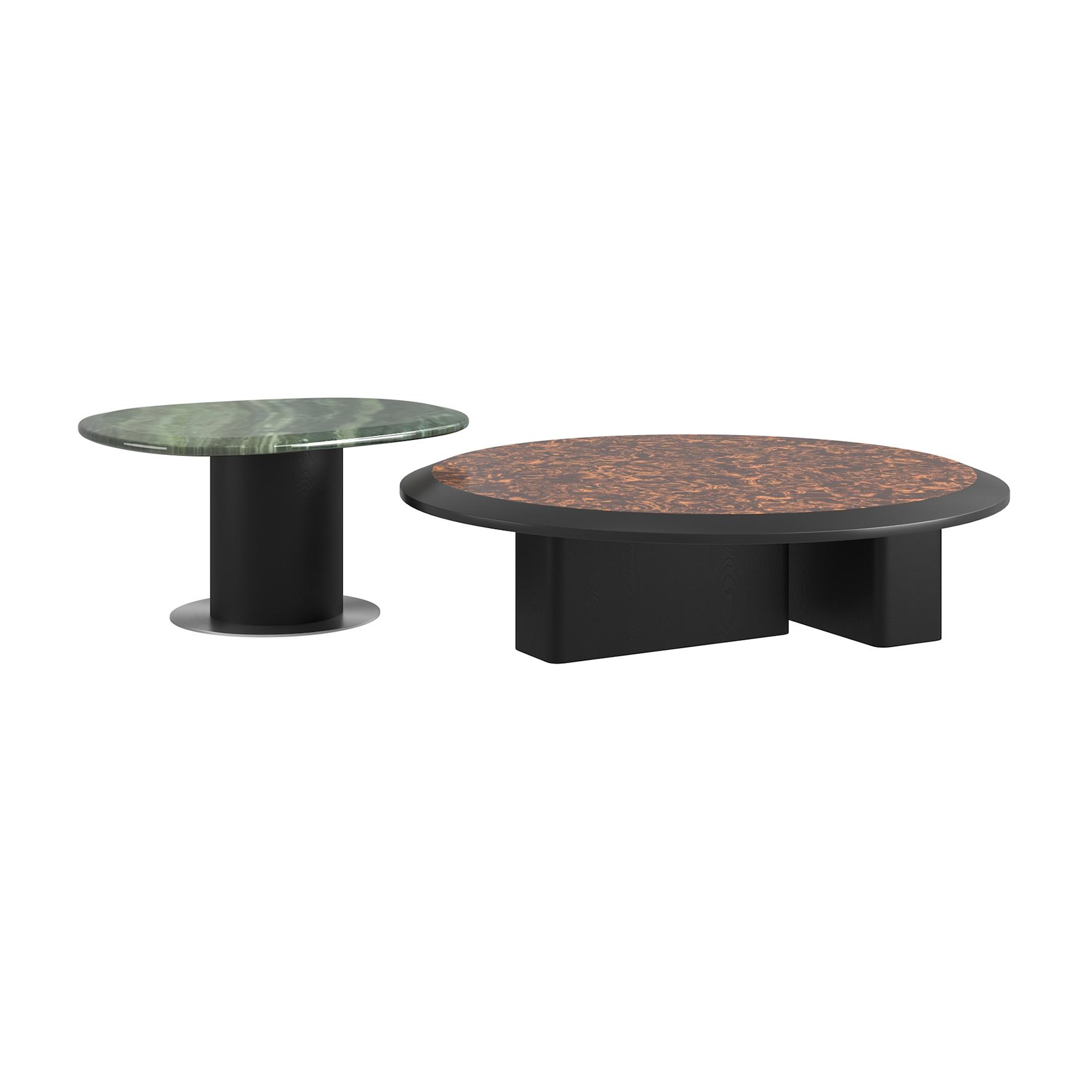 The small coffee table table top is made of avocado green marble with 304 brushed stainless steel feet, the large coffee table table top is made of grenadilla veneer and the overall white oak veneer is open lacquered in black oak colour.