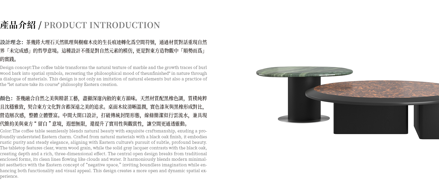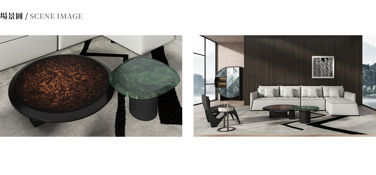 小茶几檯面採用牛油果綠大理石,腳墊為 304 拉絲不鏽鋼,大茶几檯面為樹榴木飾面,整體白橡木飾面黑橡色開放漆。