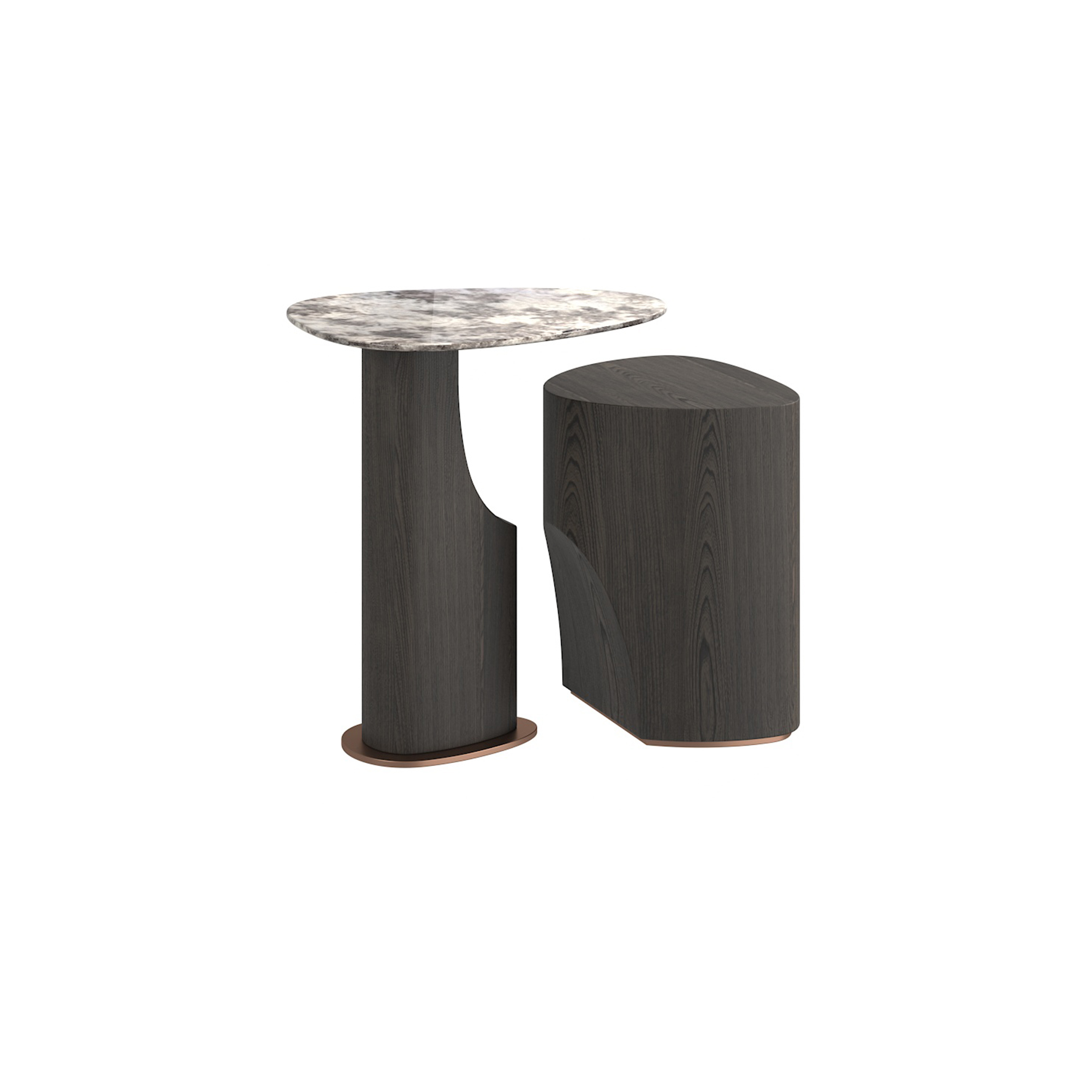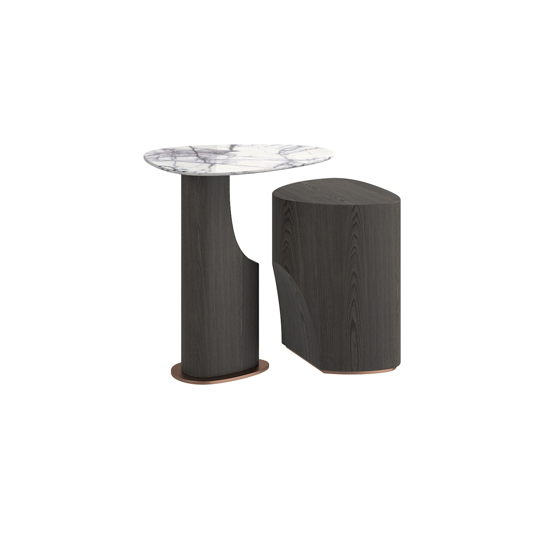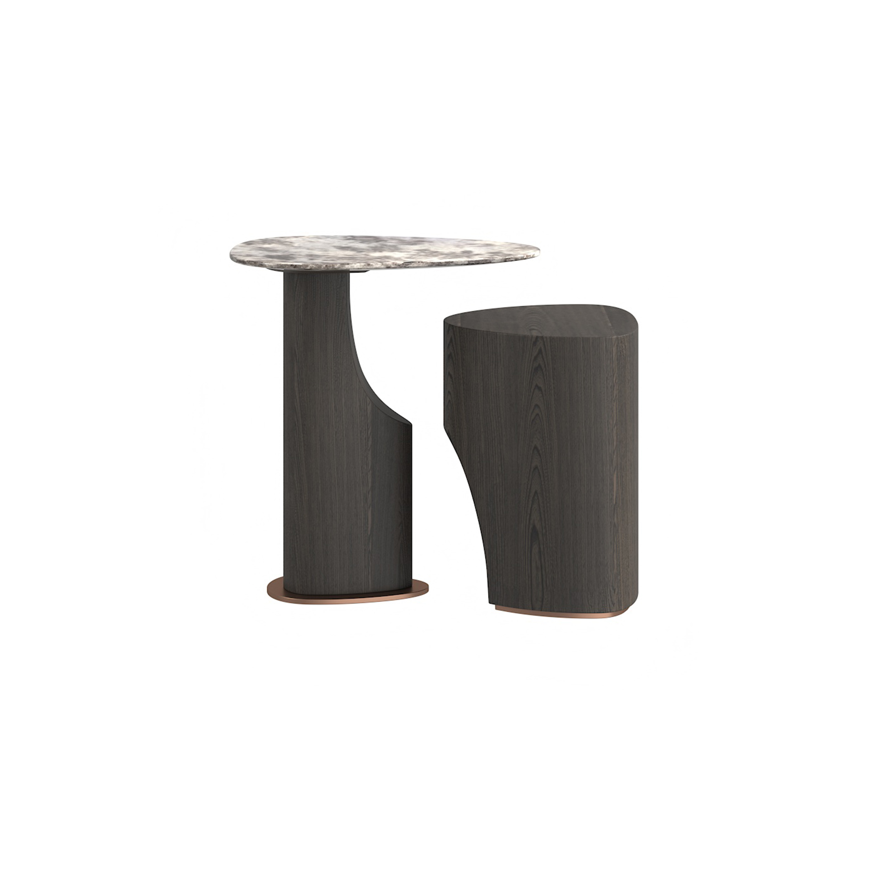 High side table top in Snowy Mountain Fox marble, overall frame in ash solid wood open lacquered grey oak and feet in 304 brushed stainless steel.
