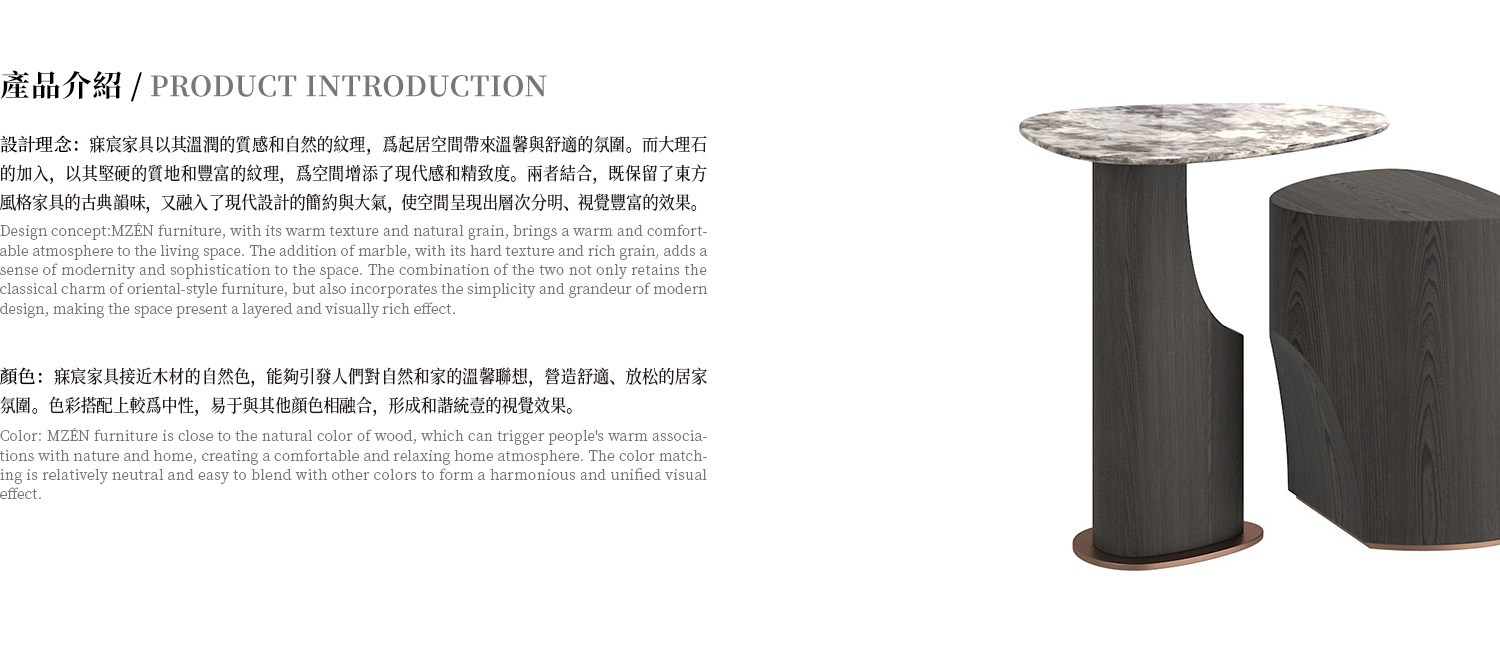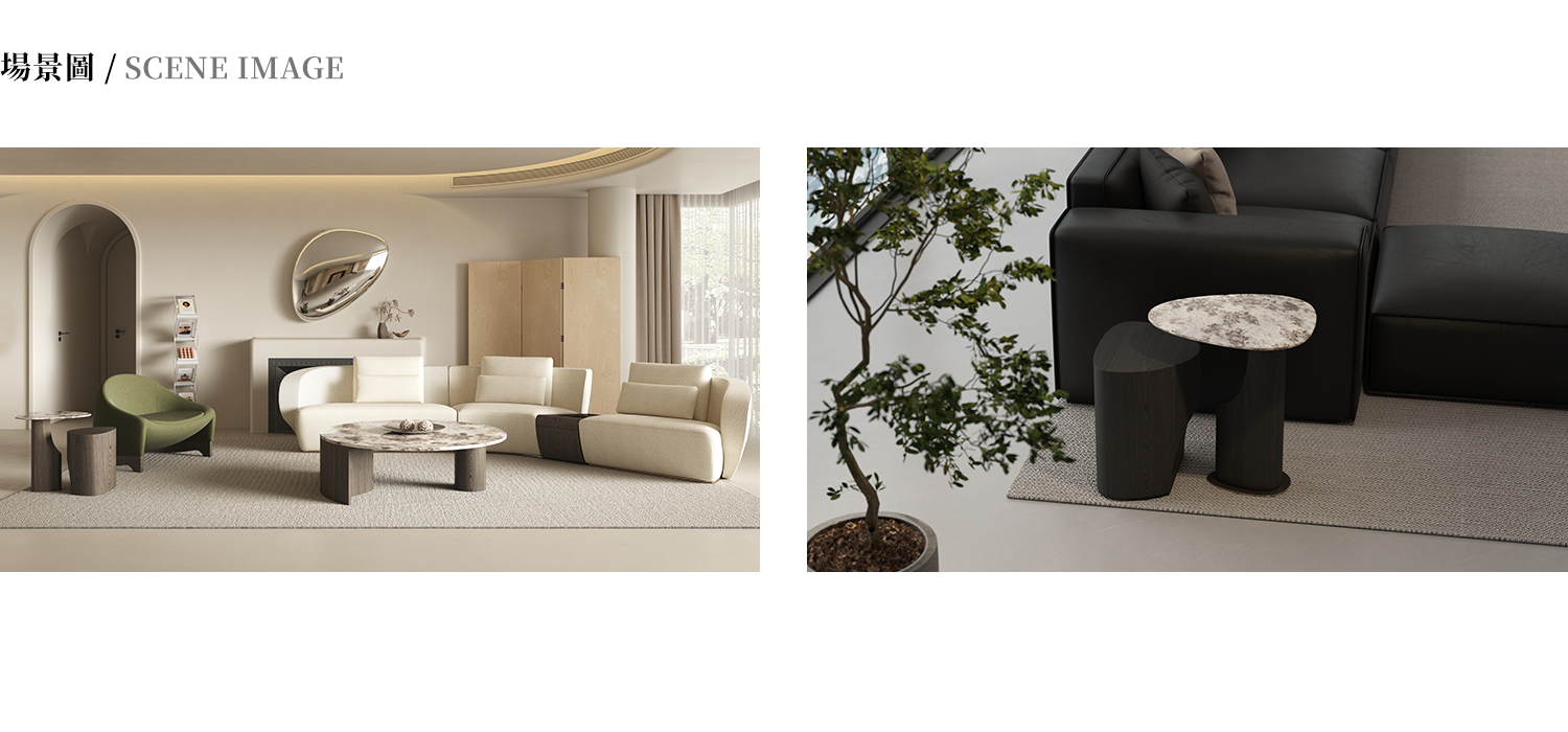 高邊几檯面為雪山飛狐大理石,整體框架為白蠟木實木開放漆灰橡色,腳墊採用 304 拉絲不鏽鋼。