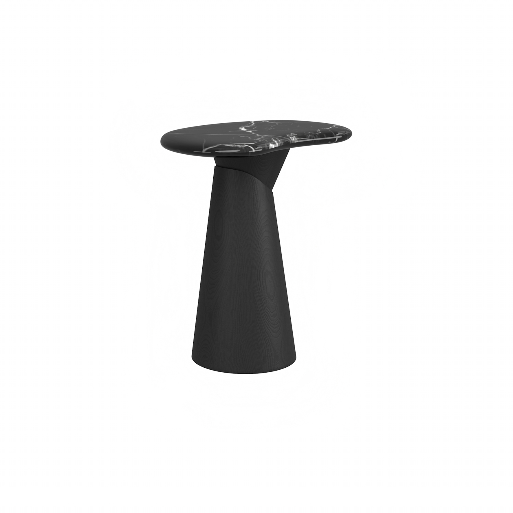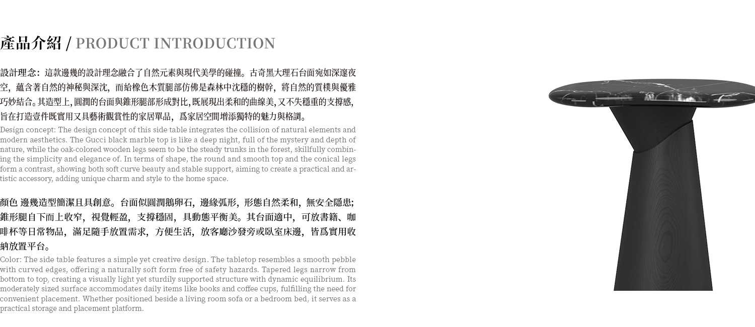 邊几檯面為潑墨黑大理石,整體框架為白蠟木實木開放漆黑橡色。