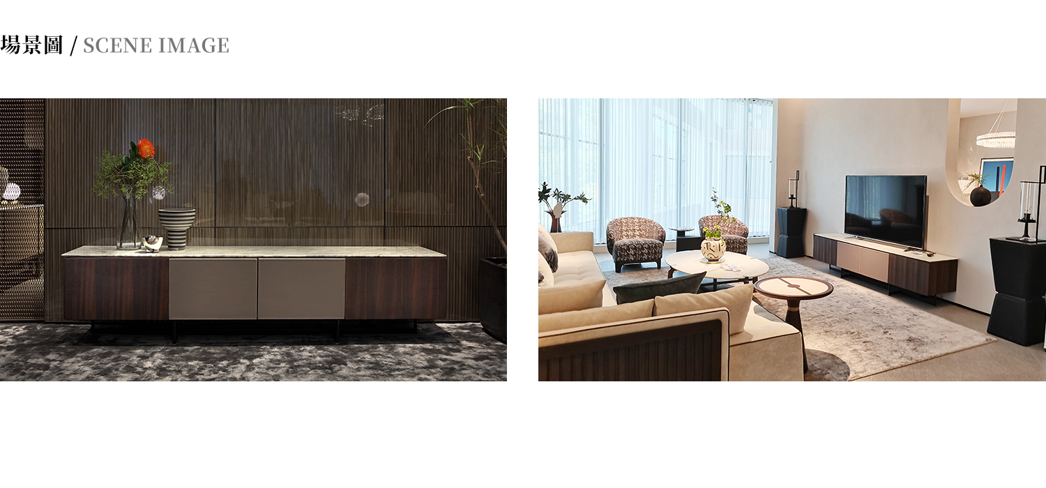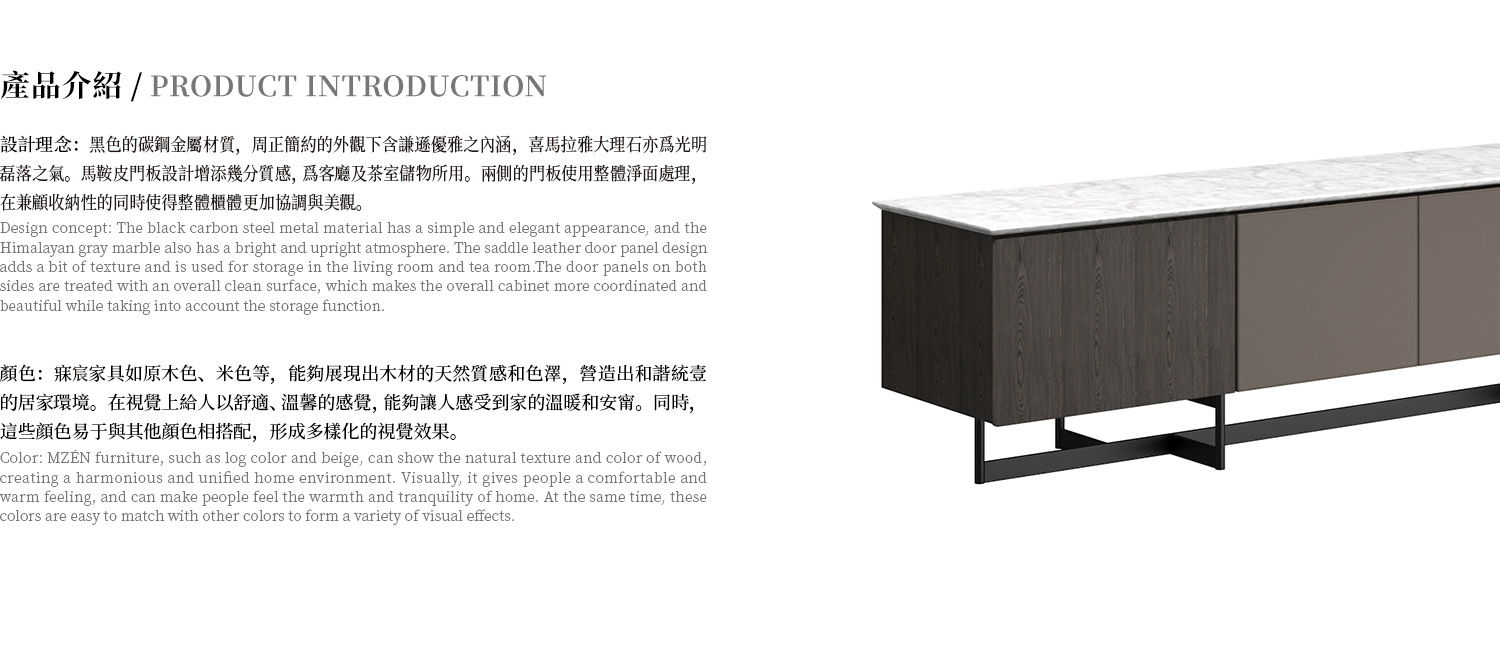 電視櫃桌面為喜馬拉雅灰大理石,框架為白蠟木實木開放漆灰橡色,中間門板採用馬鞍皮包制。