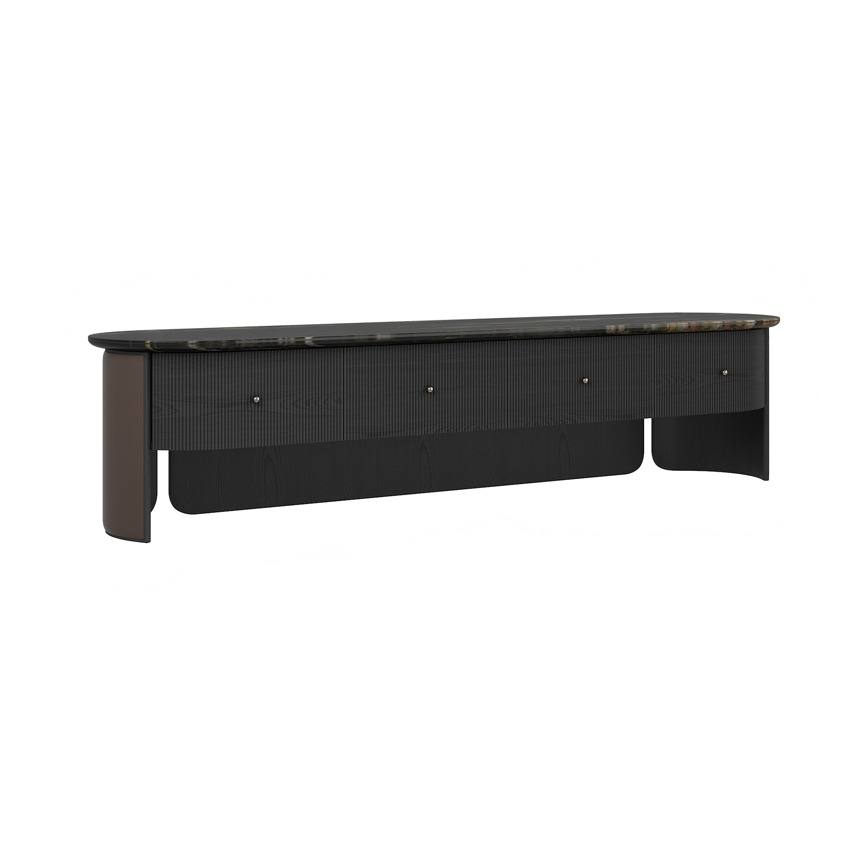 The TV stand has a black sand marble table top, a frame in ash solid wood open lacquered grey oak and a saddle leather wrap around the outside of the backrest. 金 属