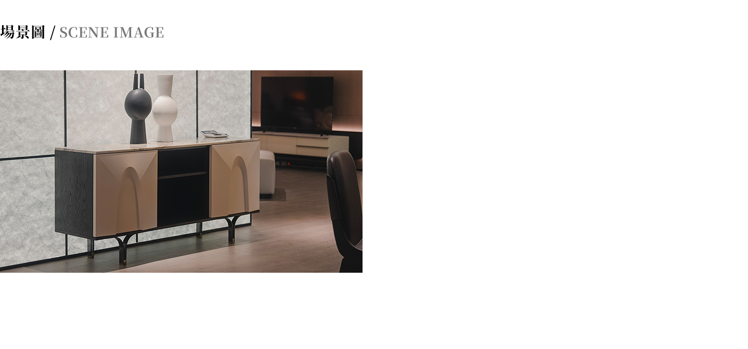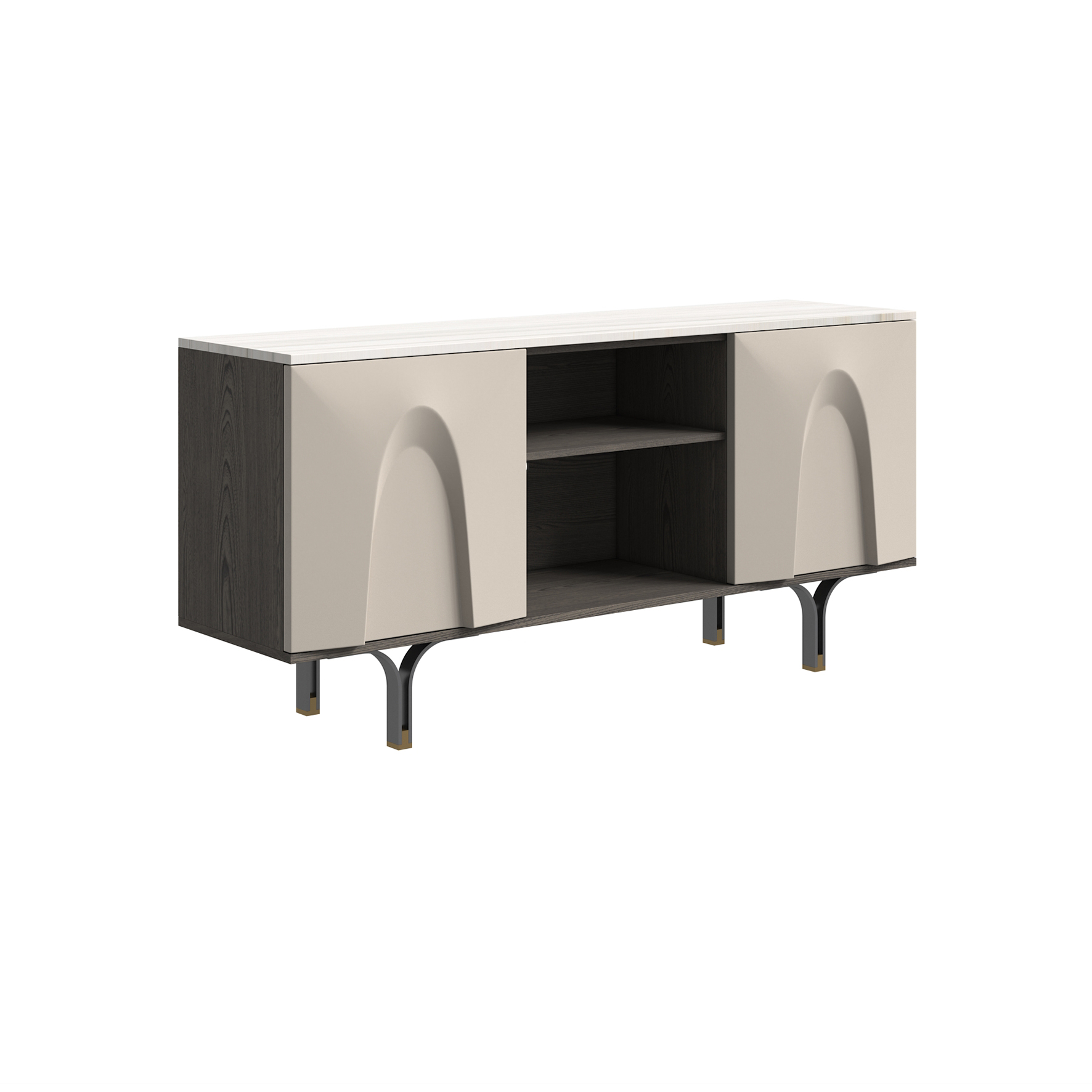 多功能櫃檯面採用白金沙大理石,框架為白橡小山紋木飾面,金屬腳架。
