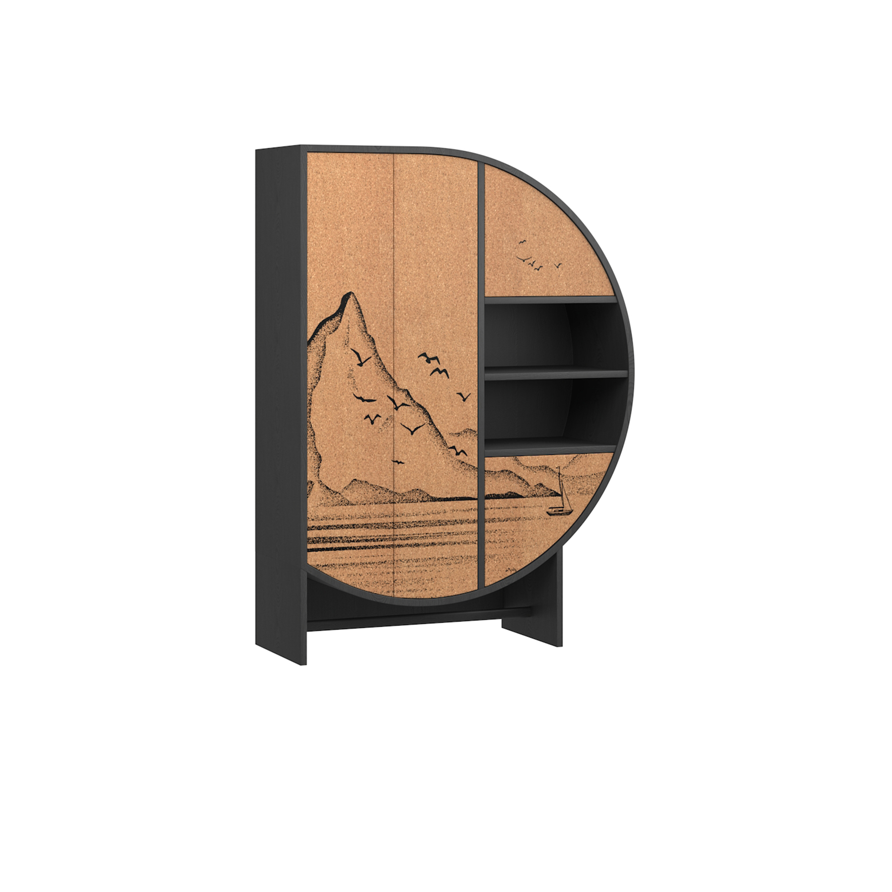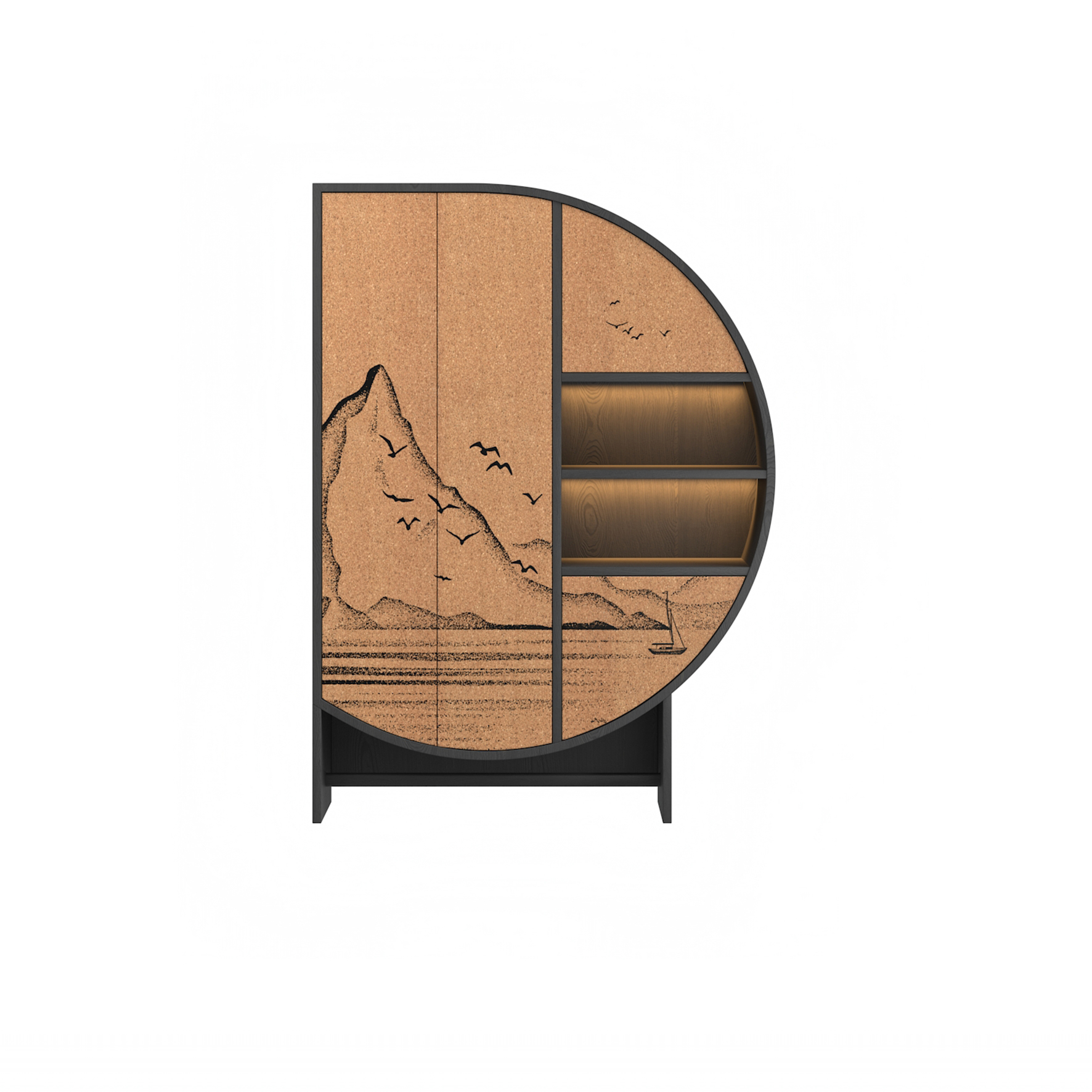 Multifunctional cabinet frame in ash with white oak chapar-ral veneer and custom painted door panels in cork.