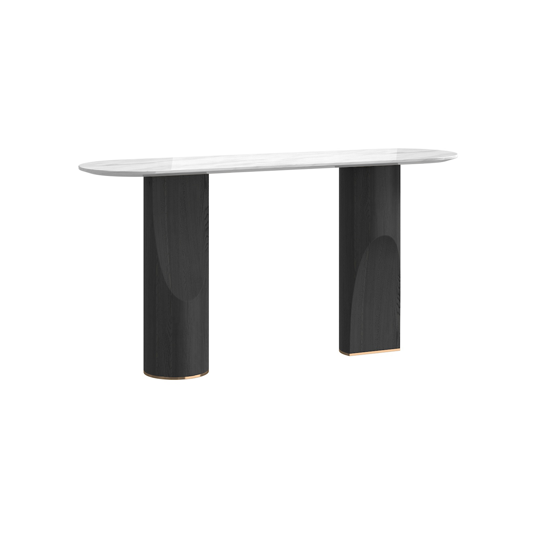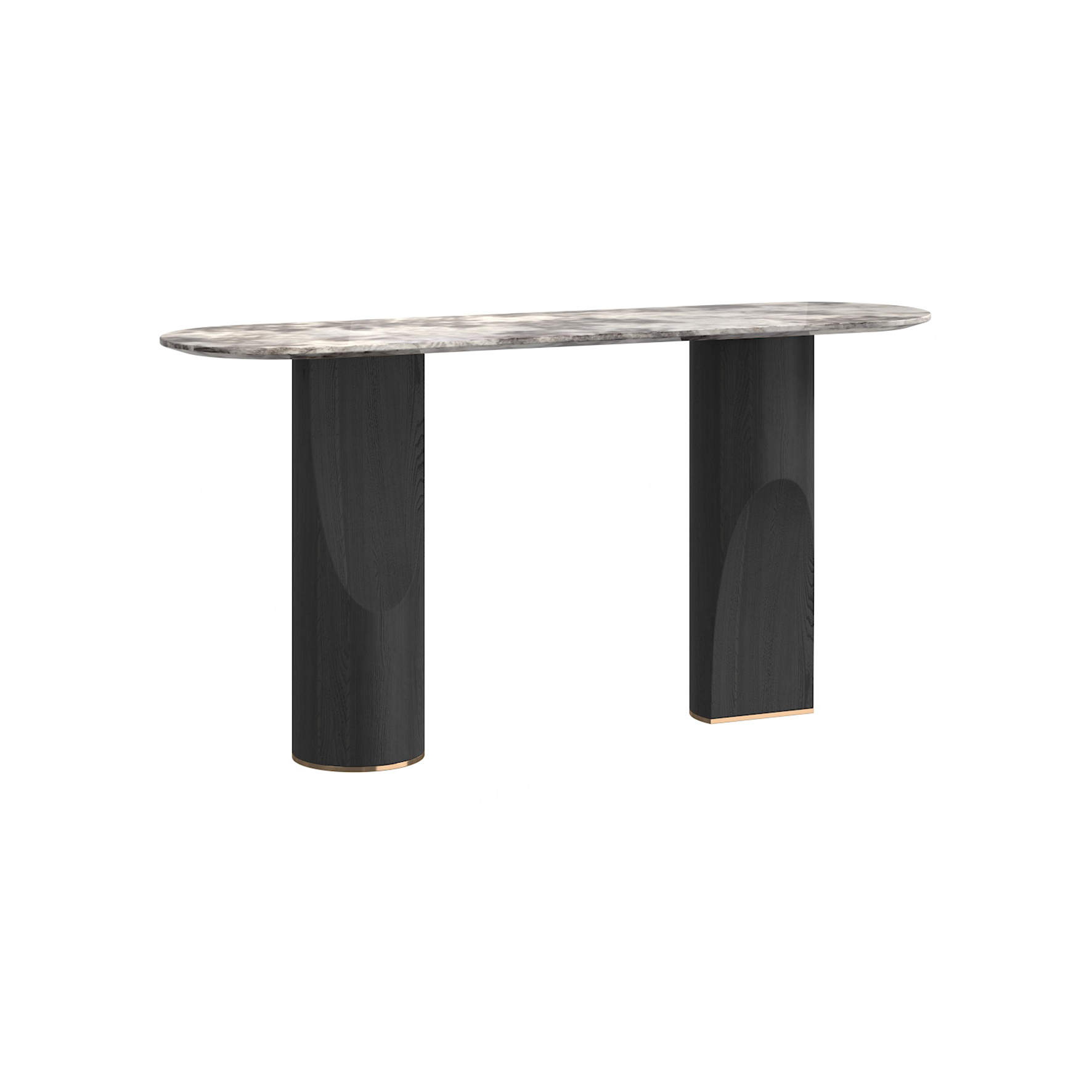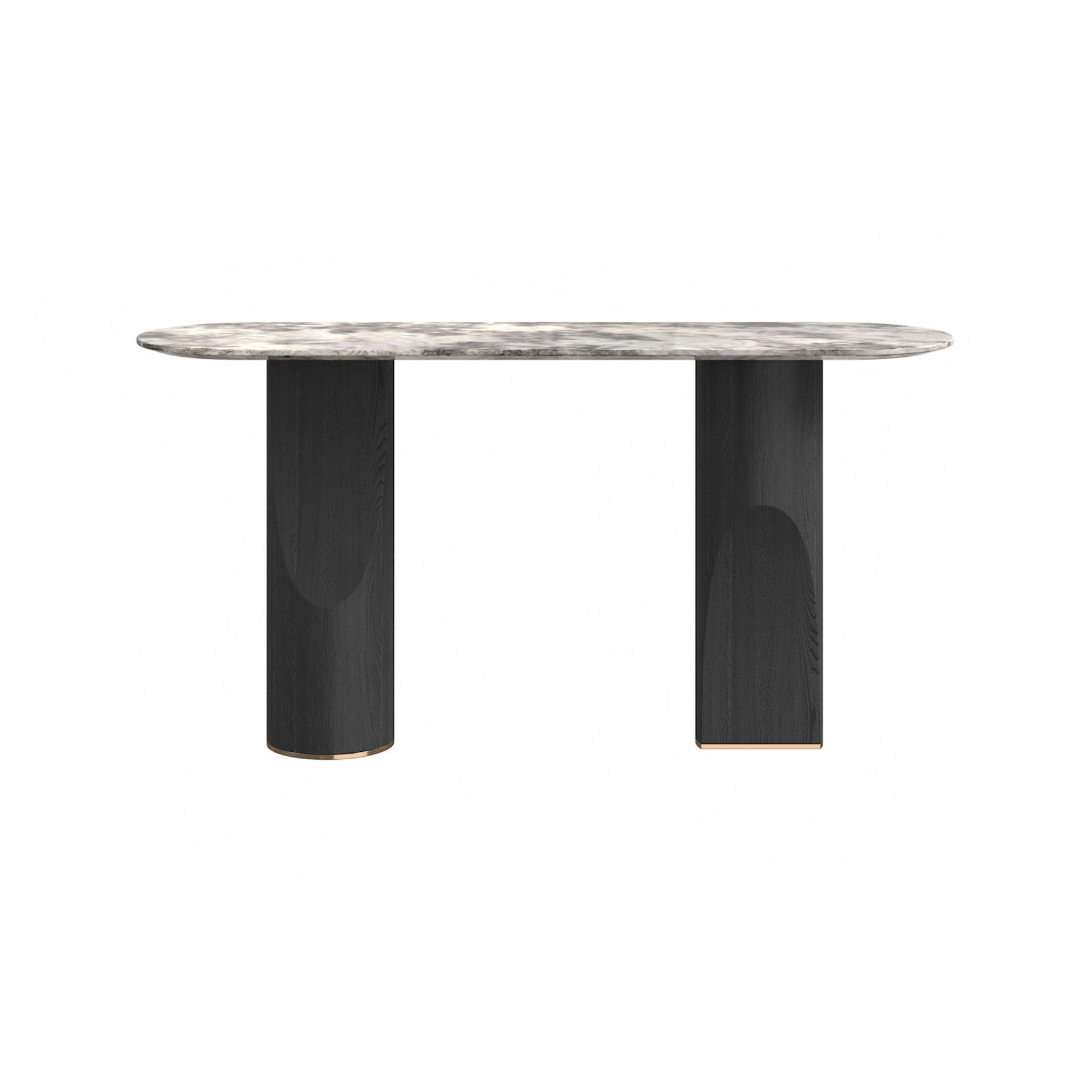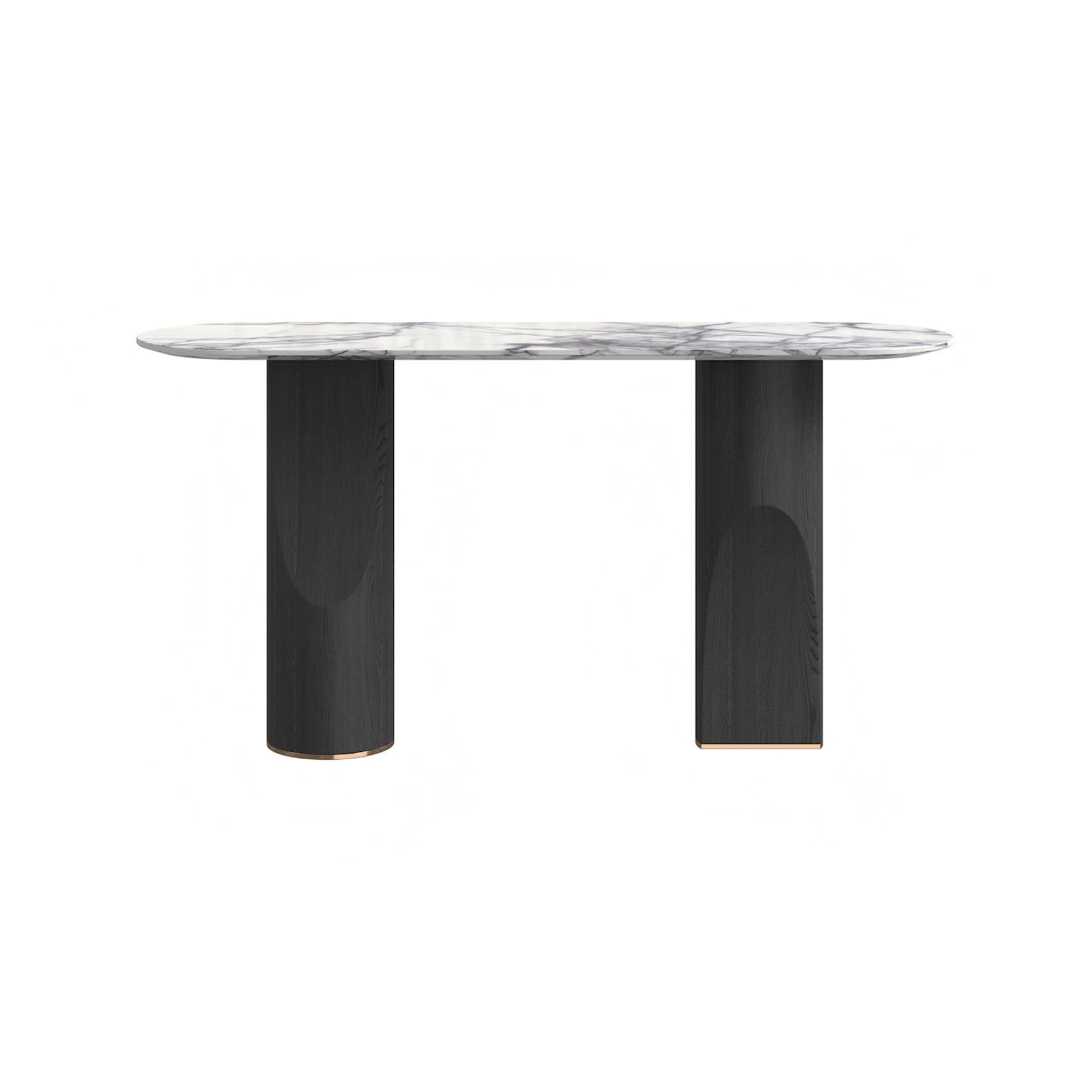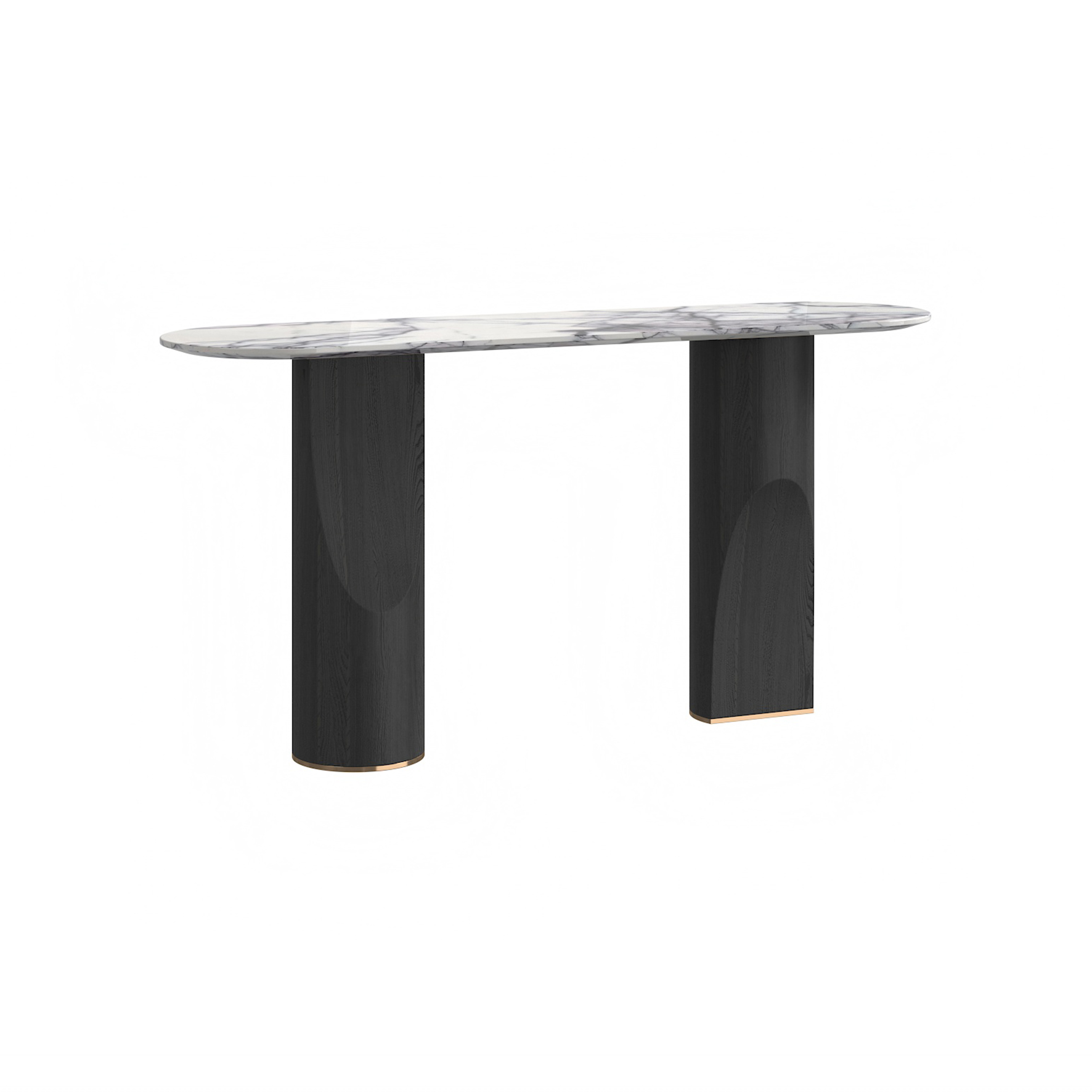 The entrance countertop is jazz white marble with legs in ash solid wood open lacquered black oak and feet in 304 brushed stainless steel.